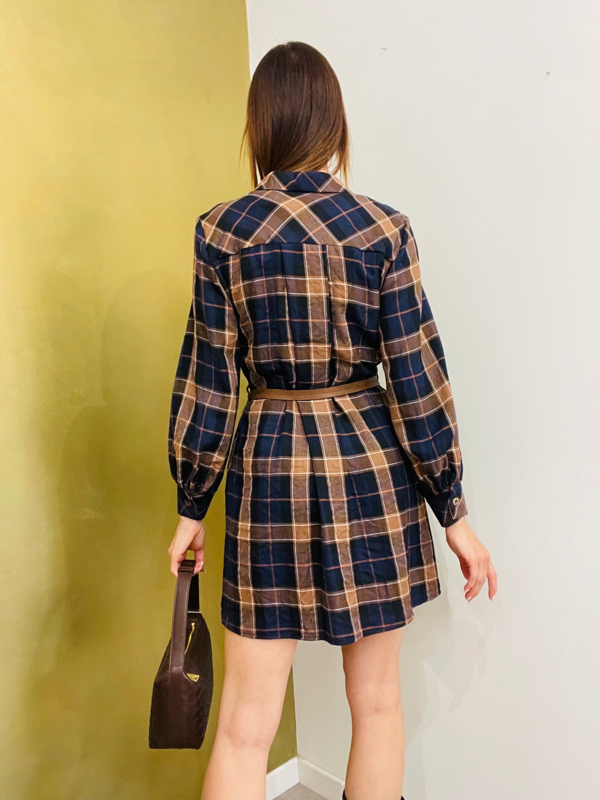 Abito camicia a quadri con quattro bottoni sul davanti, manica con polsino e bottone, cintura compresa