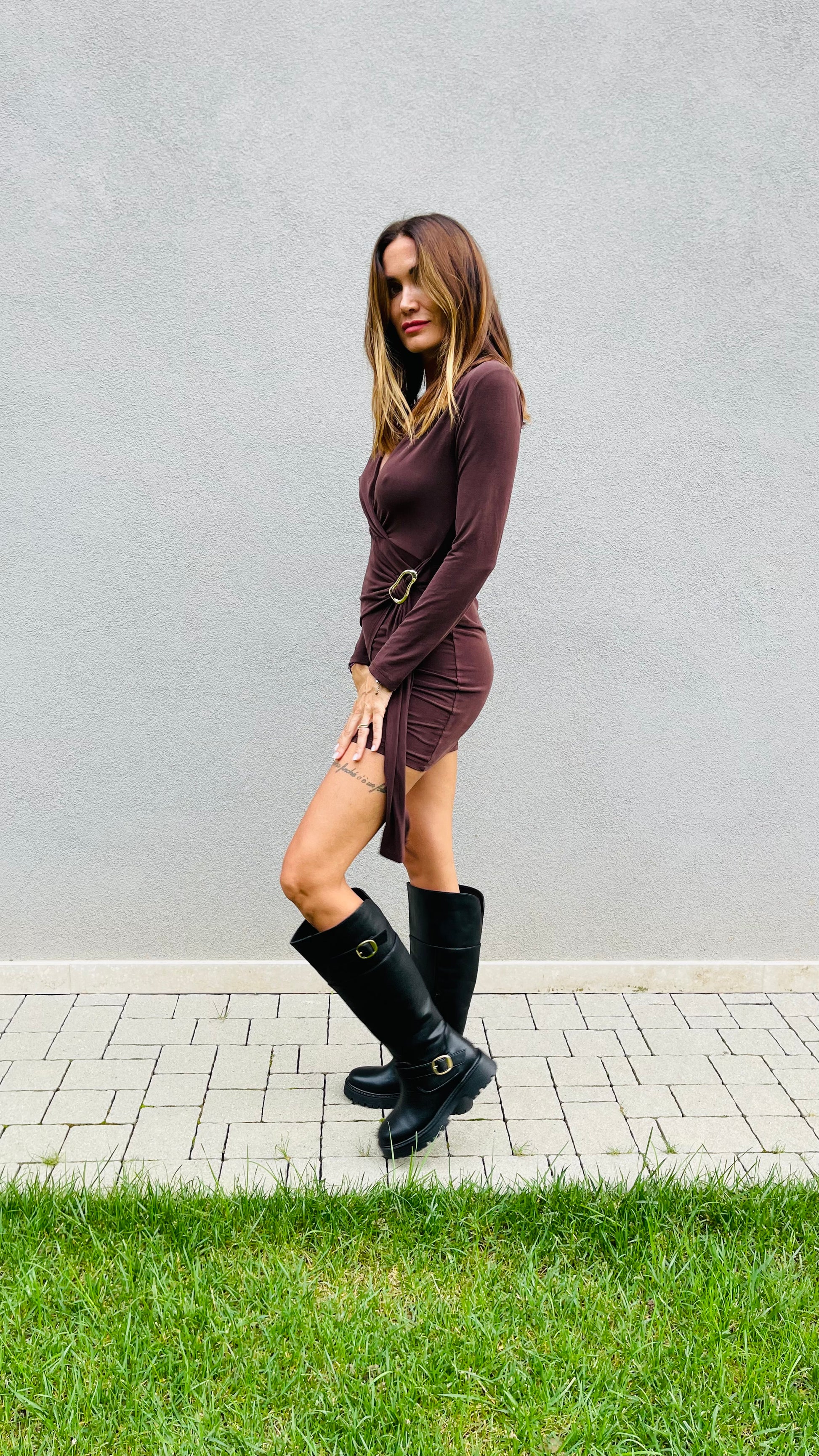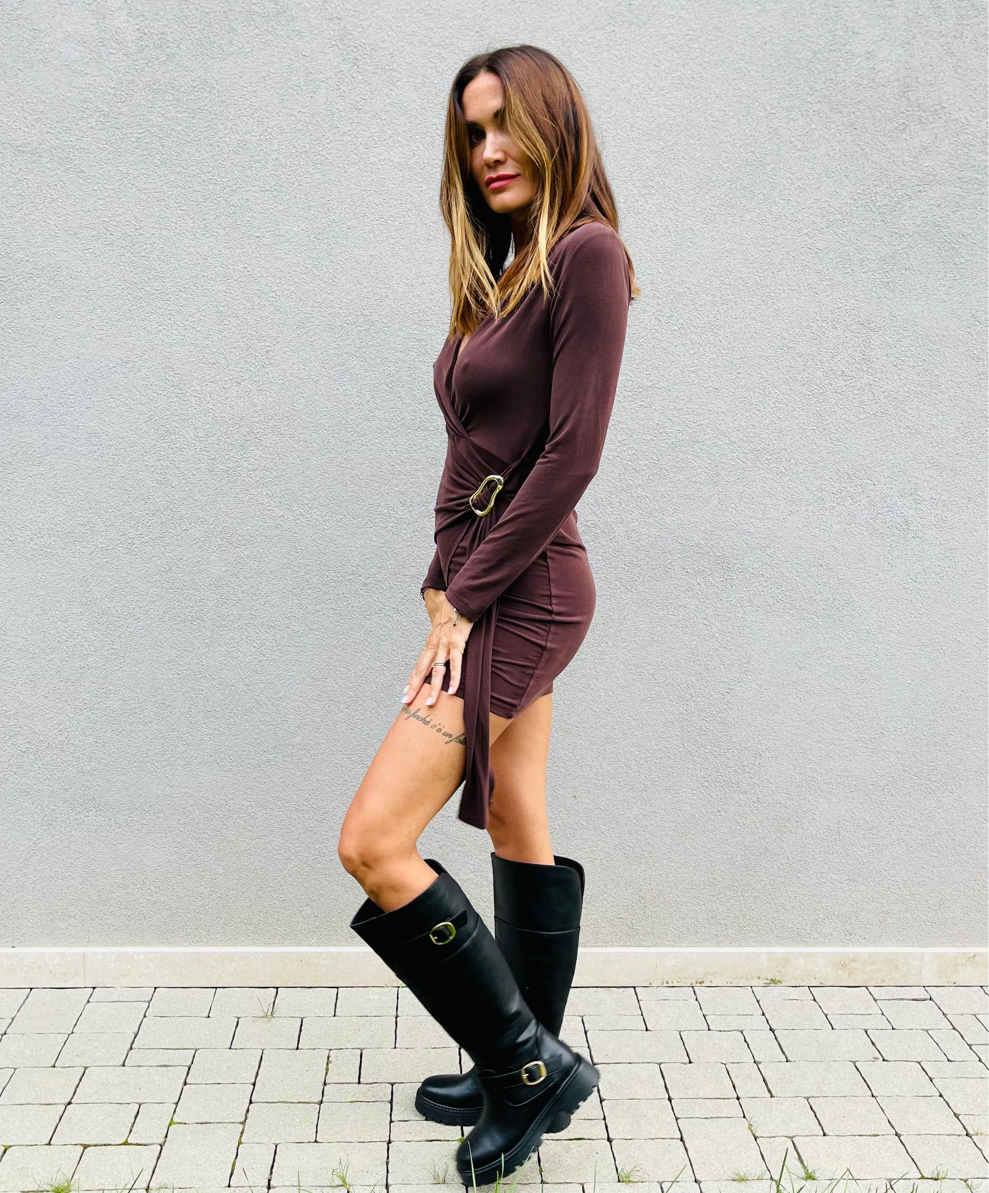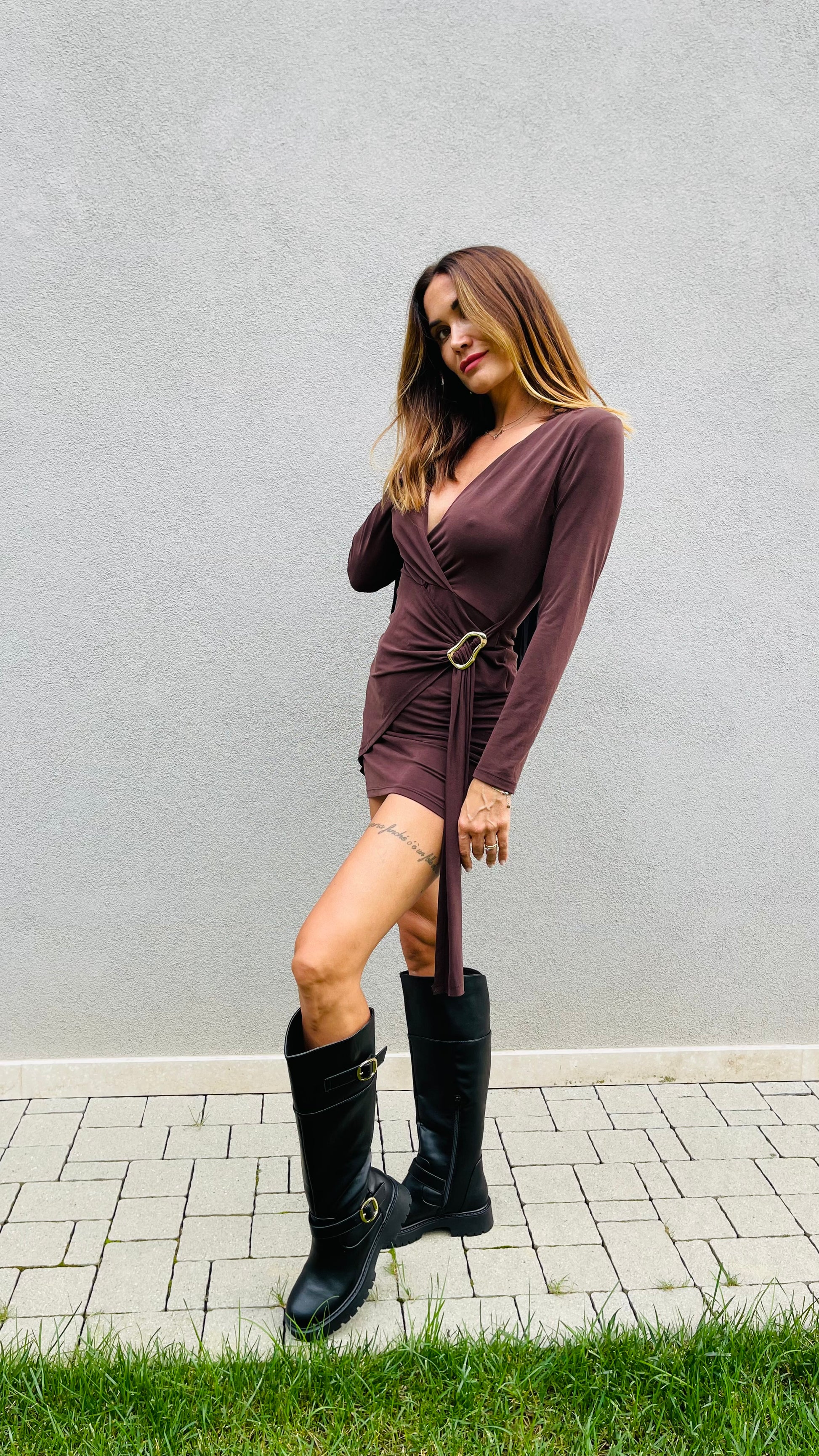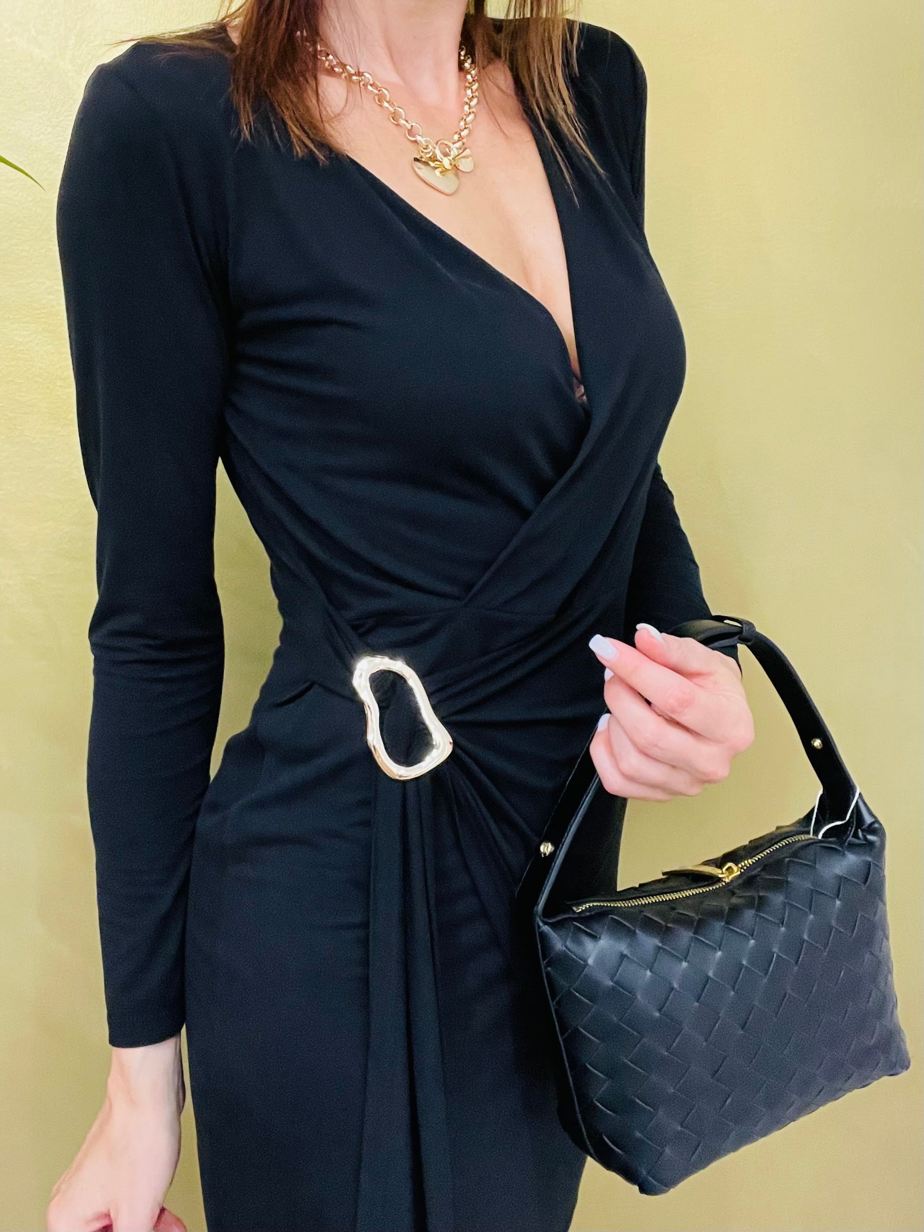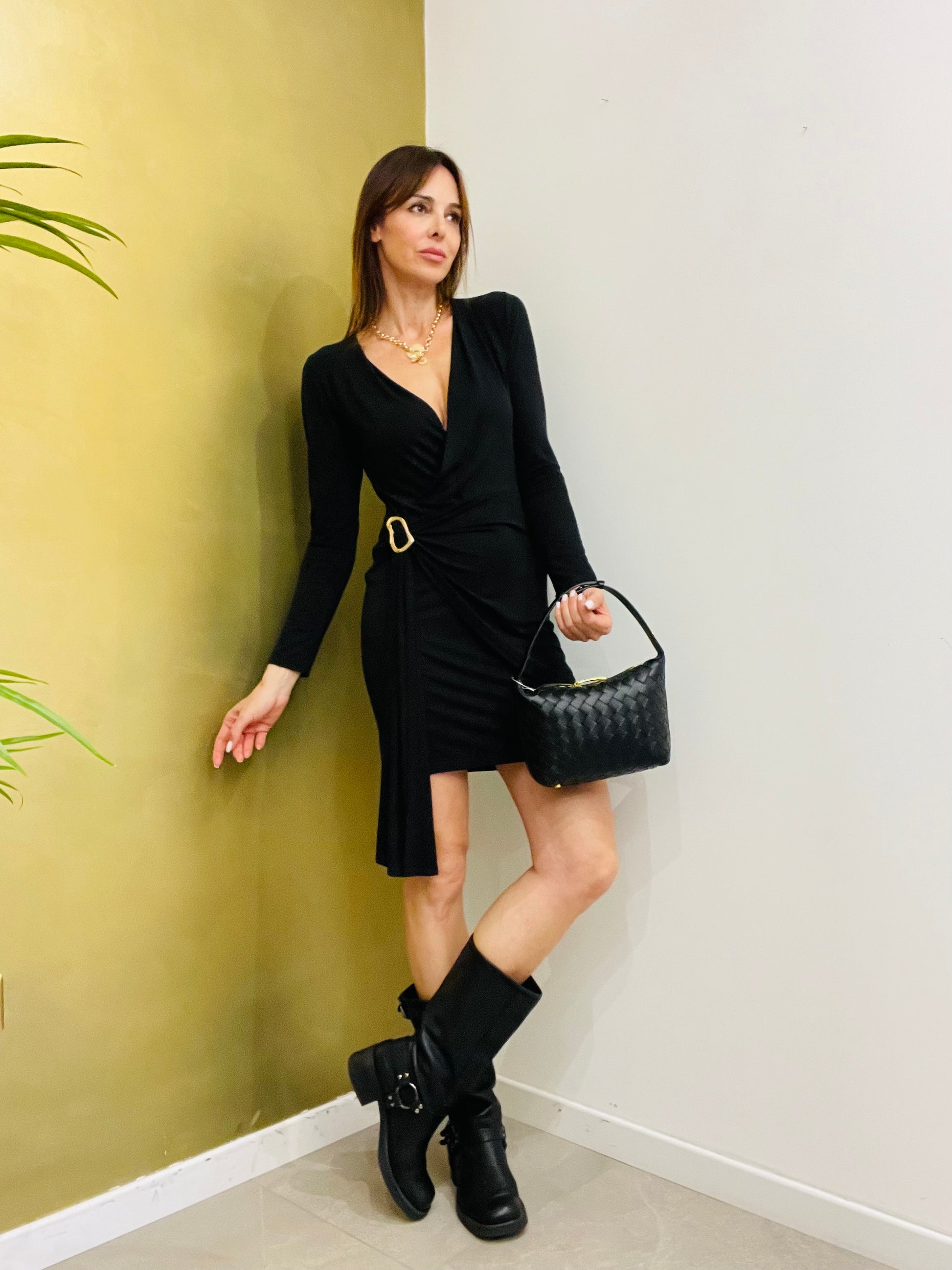 Abito corto con scollo a V, incrocio sulla parte della gonna con gioiello sulla parte sinistra indossata