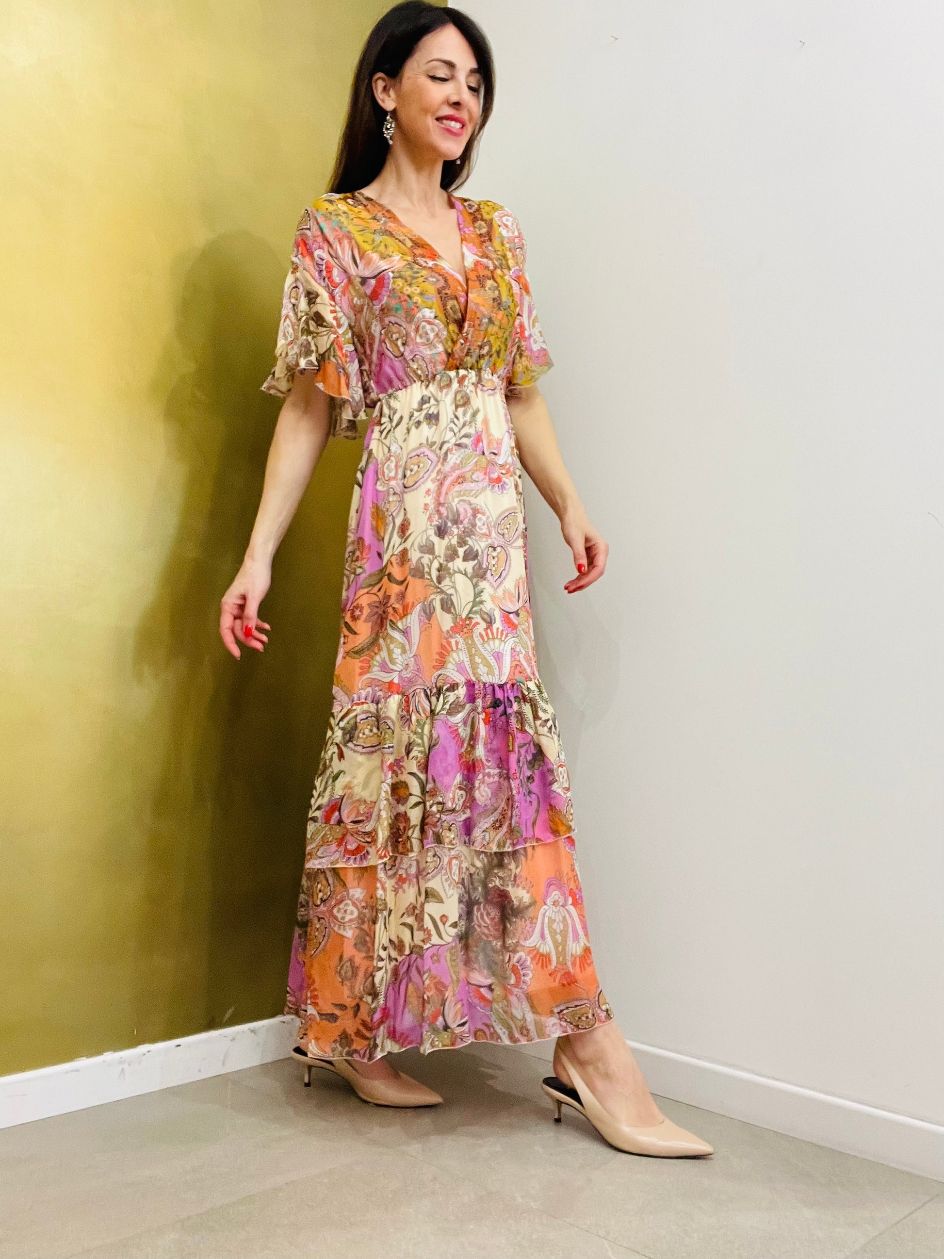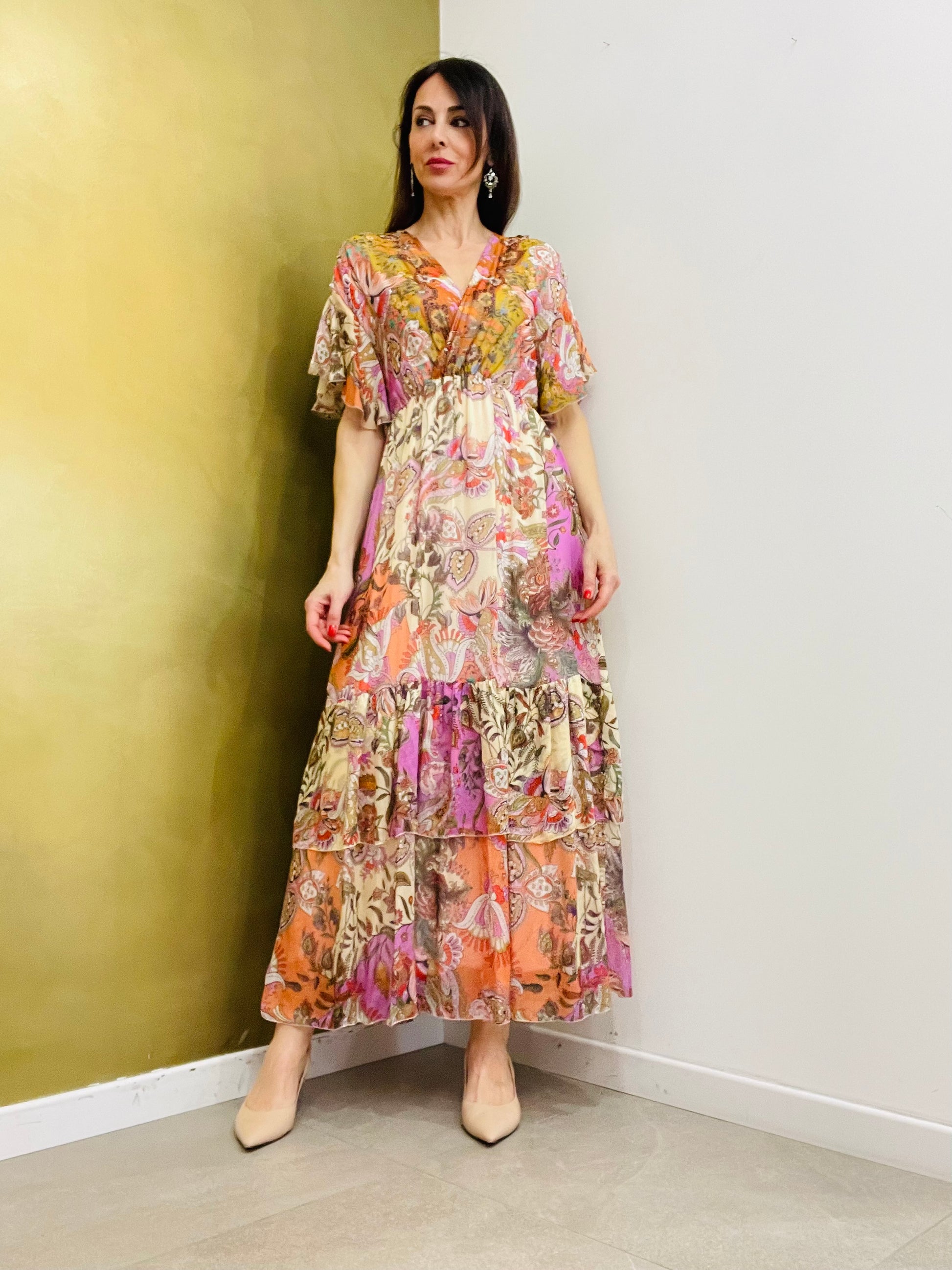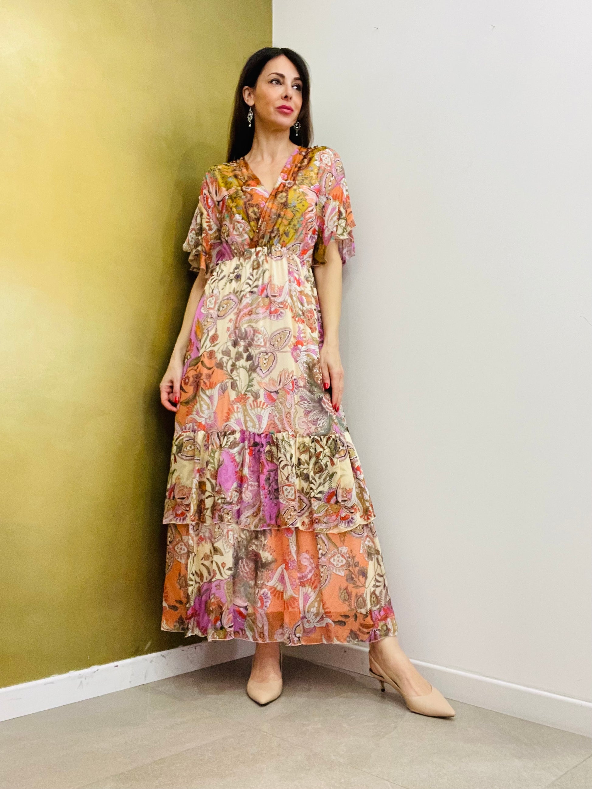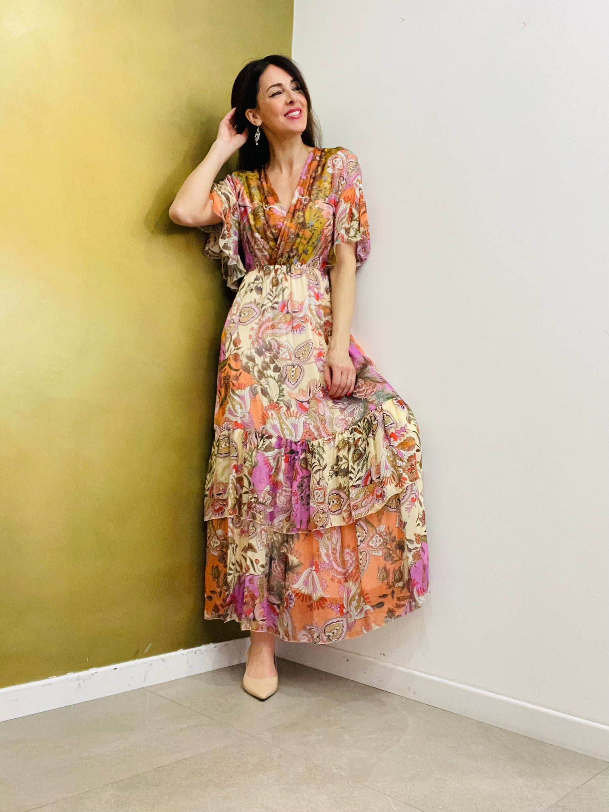 Abito lungo con scollo ad incrocio ,elastico in vita , manica a tre quarti con applicazione di volant che si ripete anche sul fondo della gonna svasata ,completamente foderato