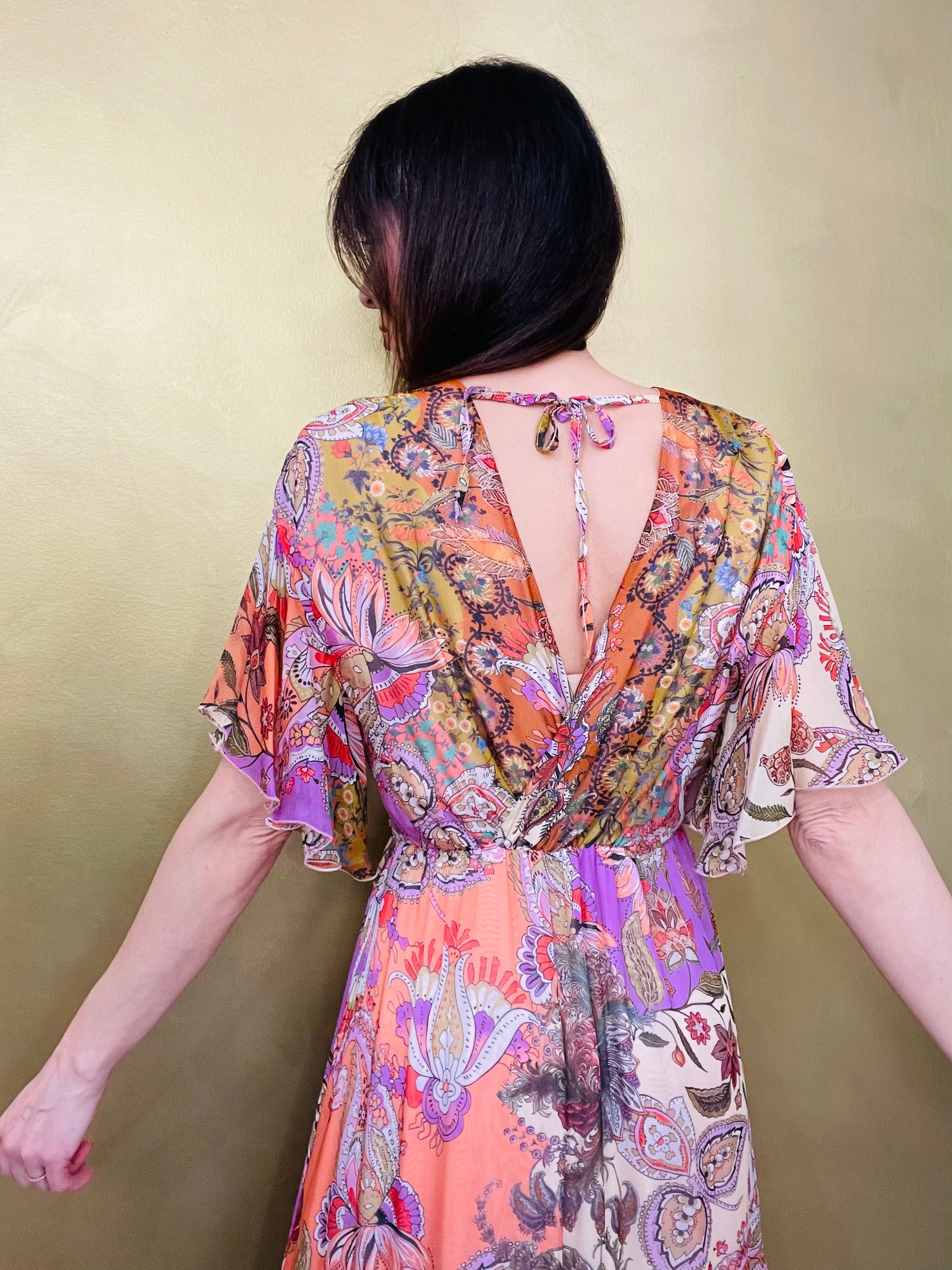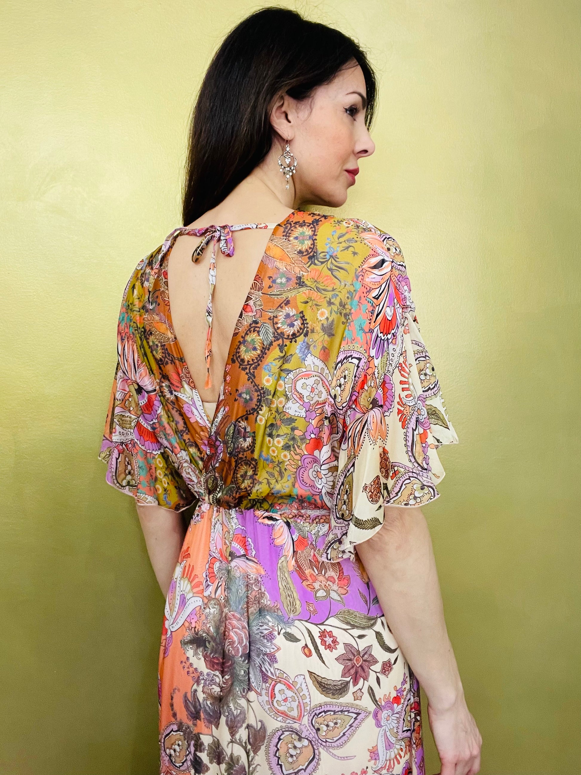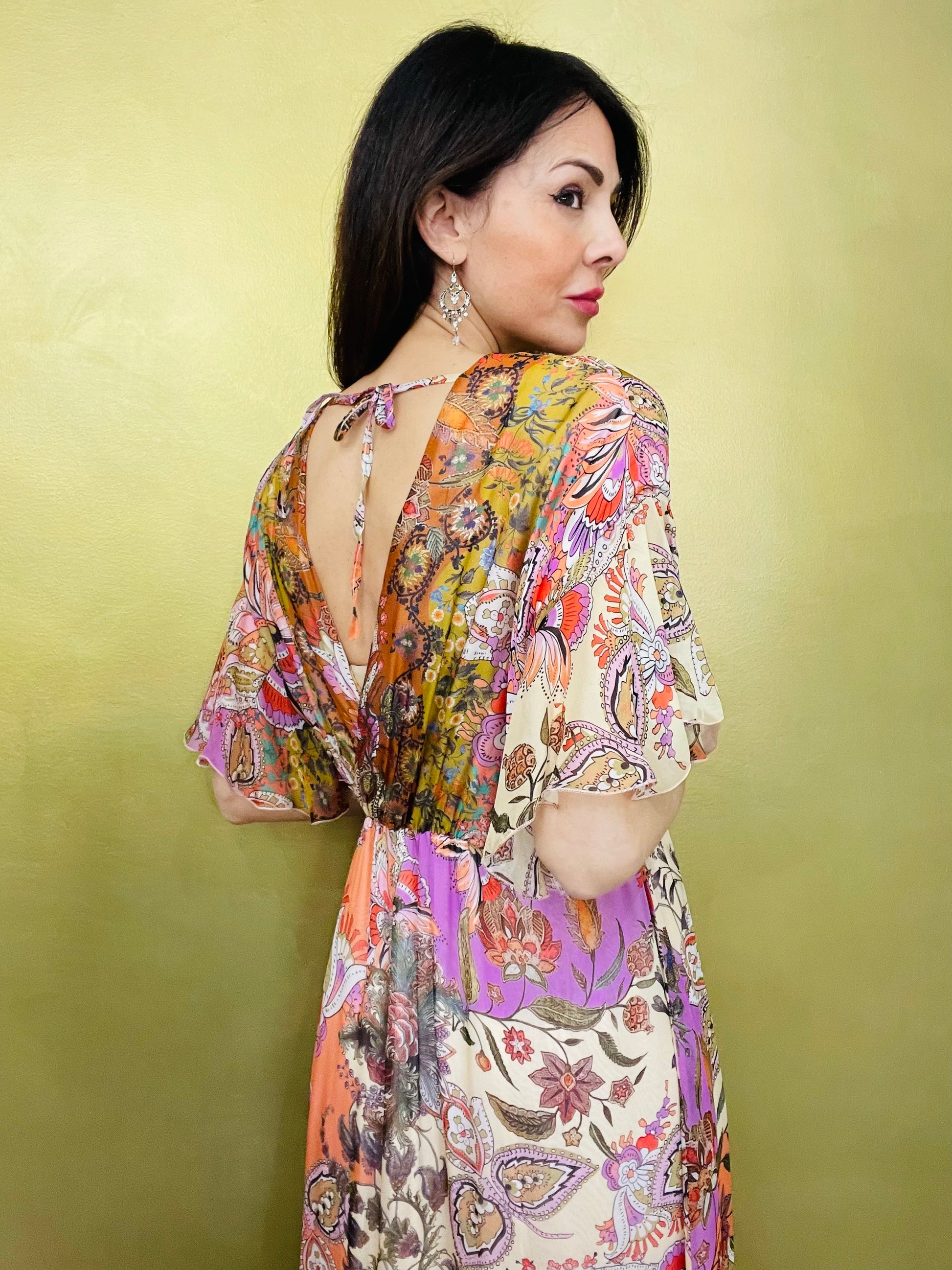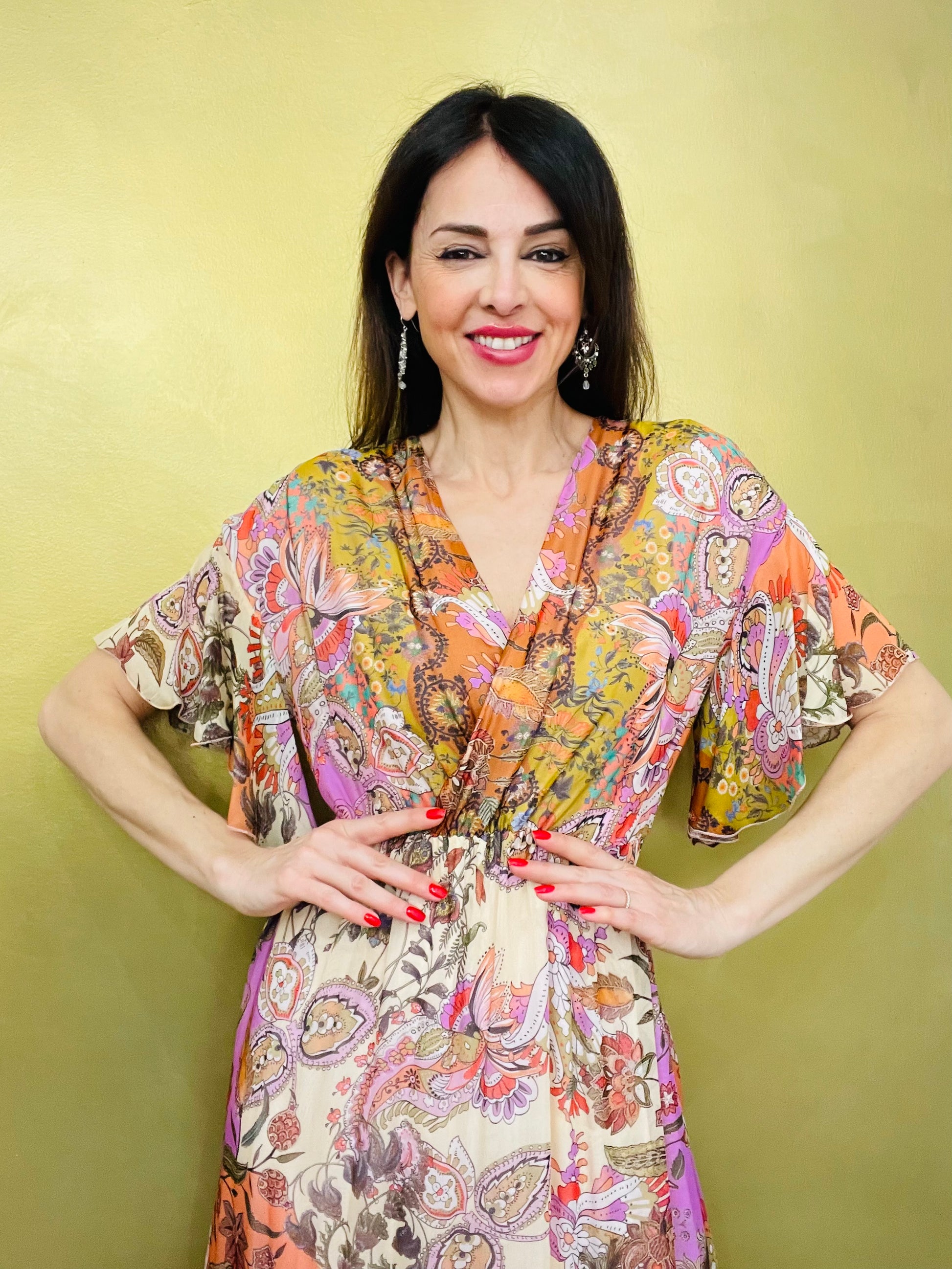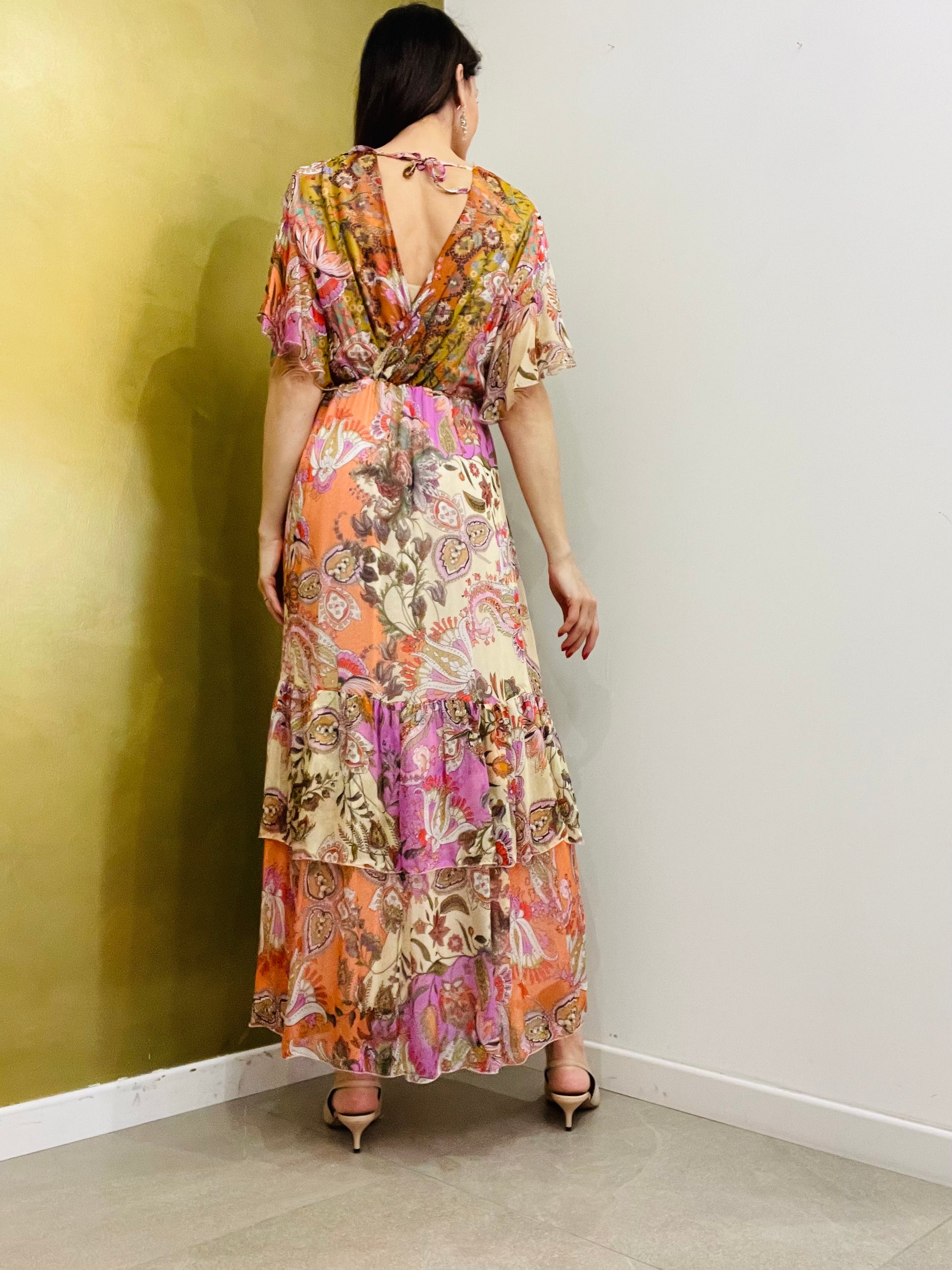 Abito lungo con scollo ad incrocio ,elastico in vita , manica a tre quarti con applicazione di volant che si ripete anche sul fondo della gonna svasata ,completamente foderato