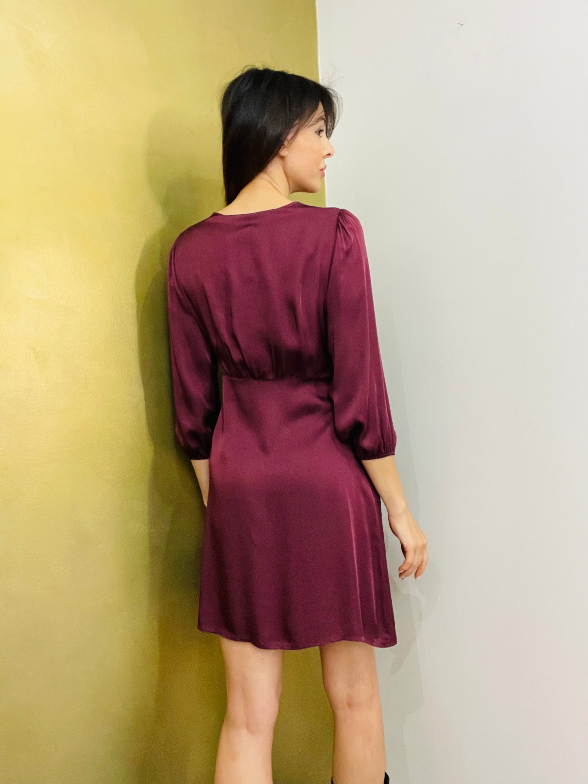Abito satin in viscosa con incrocio con fiocco sul davanti, scollo a V profondo, maniche a sbuffo con elastico sul fine manica, chiusura a portafoglio con laccetto interno