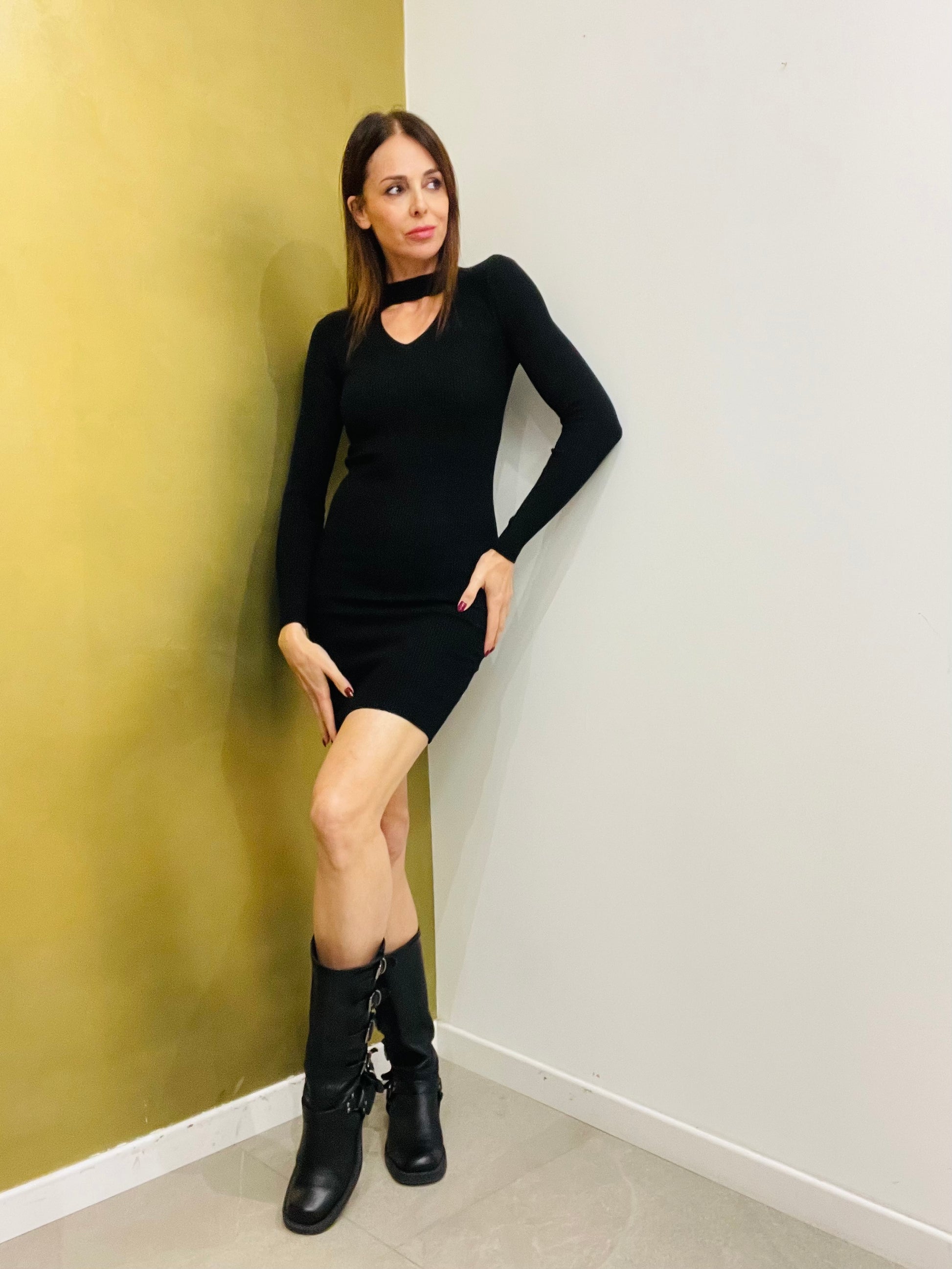 Abito a girocollo con oblò sul davanti, dettagli di costina su tutto l’abito