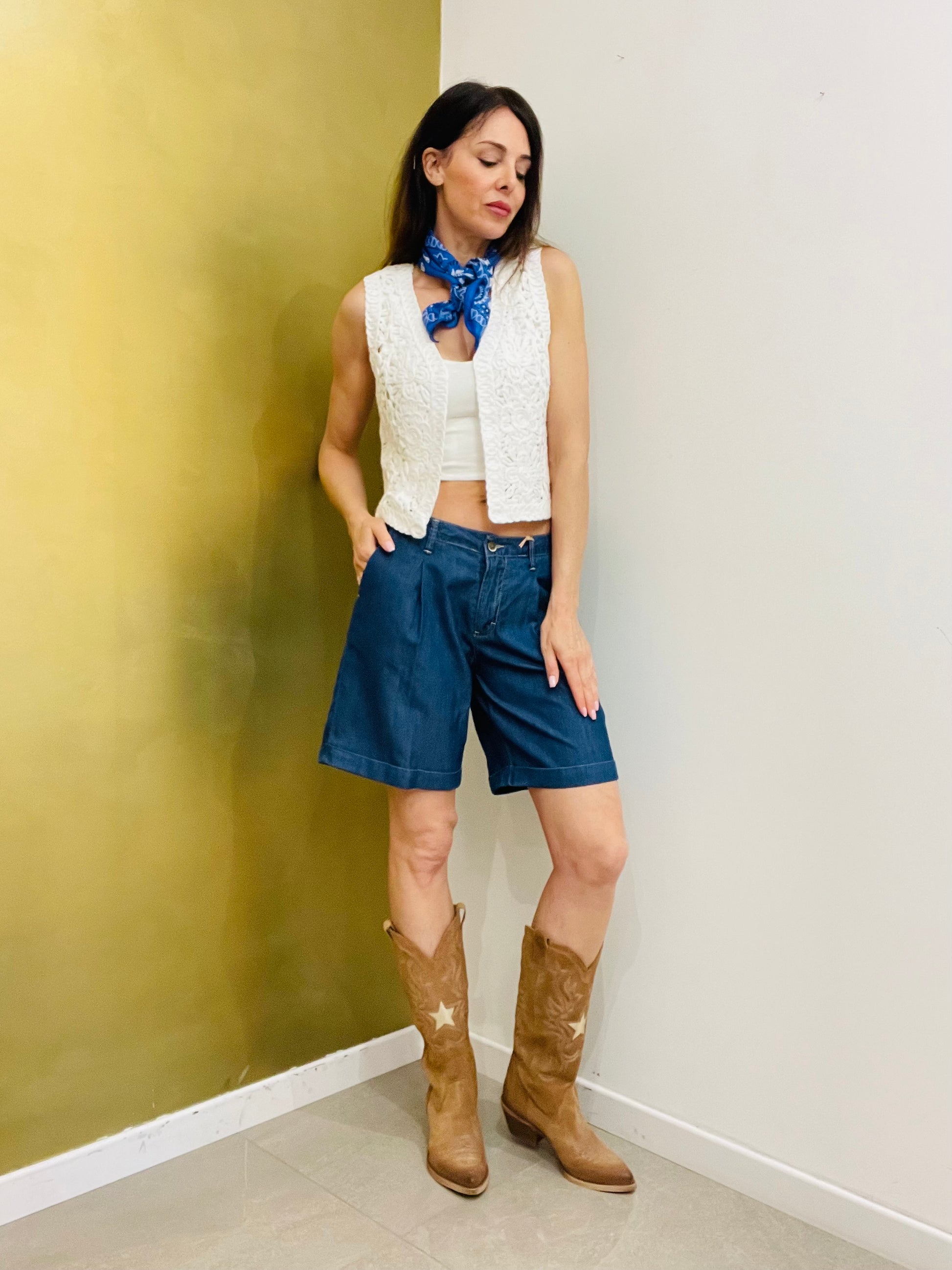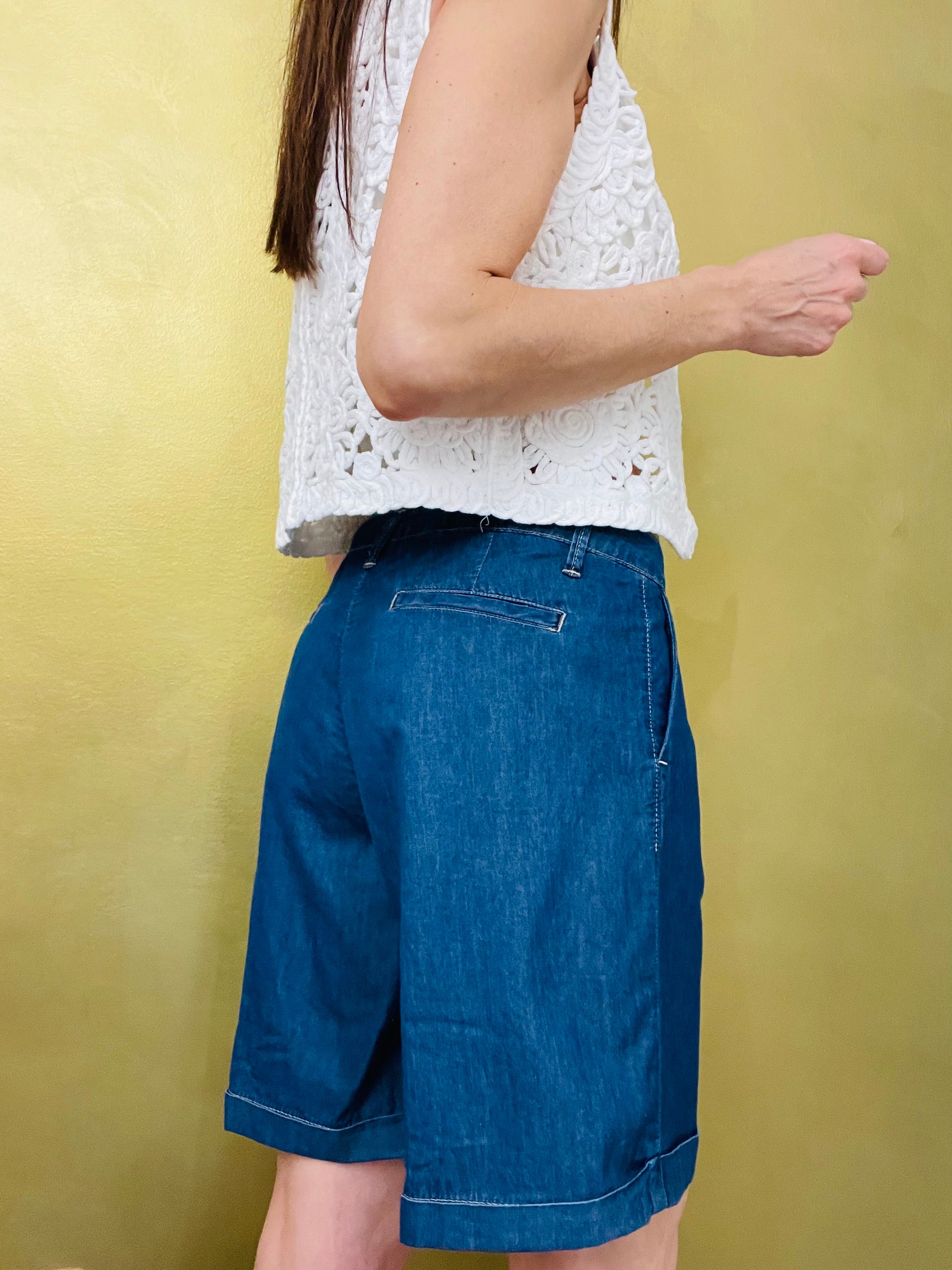 Bermuda in jeans, tessuto chambrey, leggero e morbido in cotone, con tasche alla francese laterali e tasche a filetto nella parte dietro, chiusura con zip, bottone passanti in vita