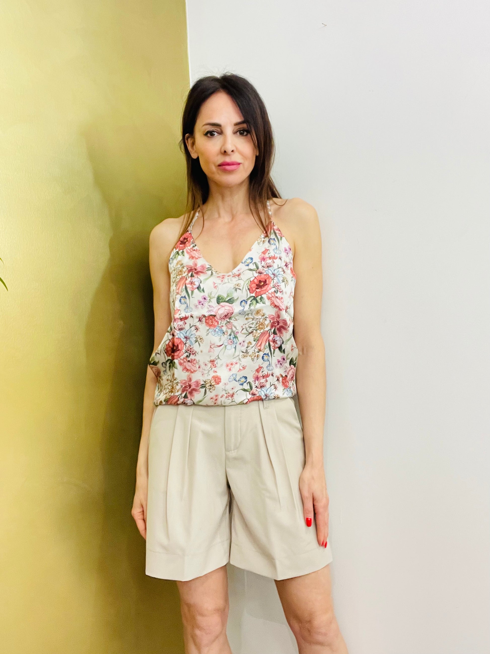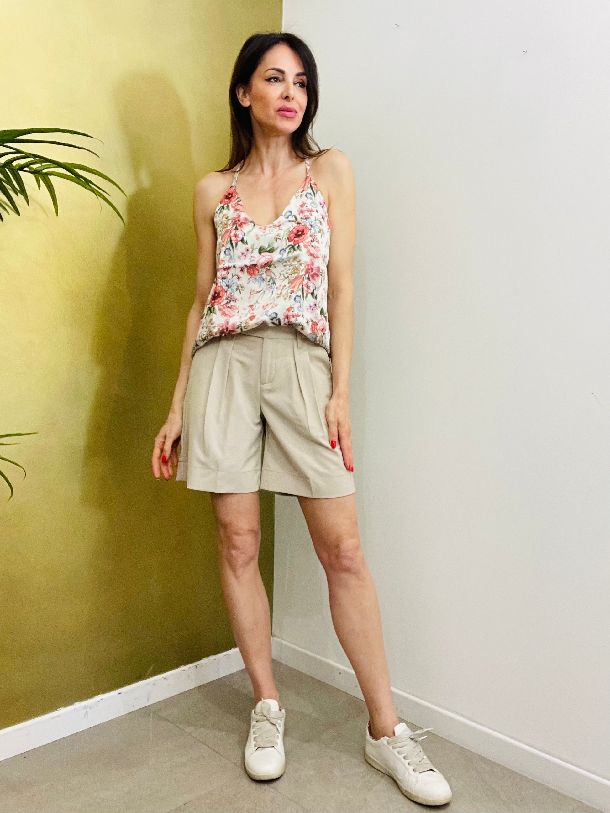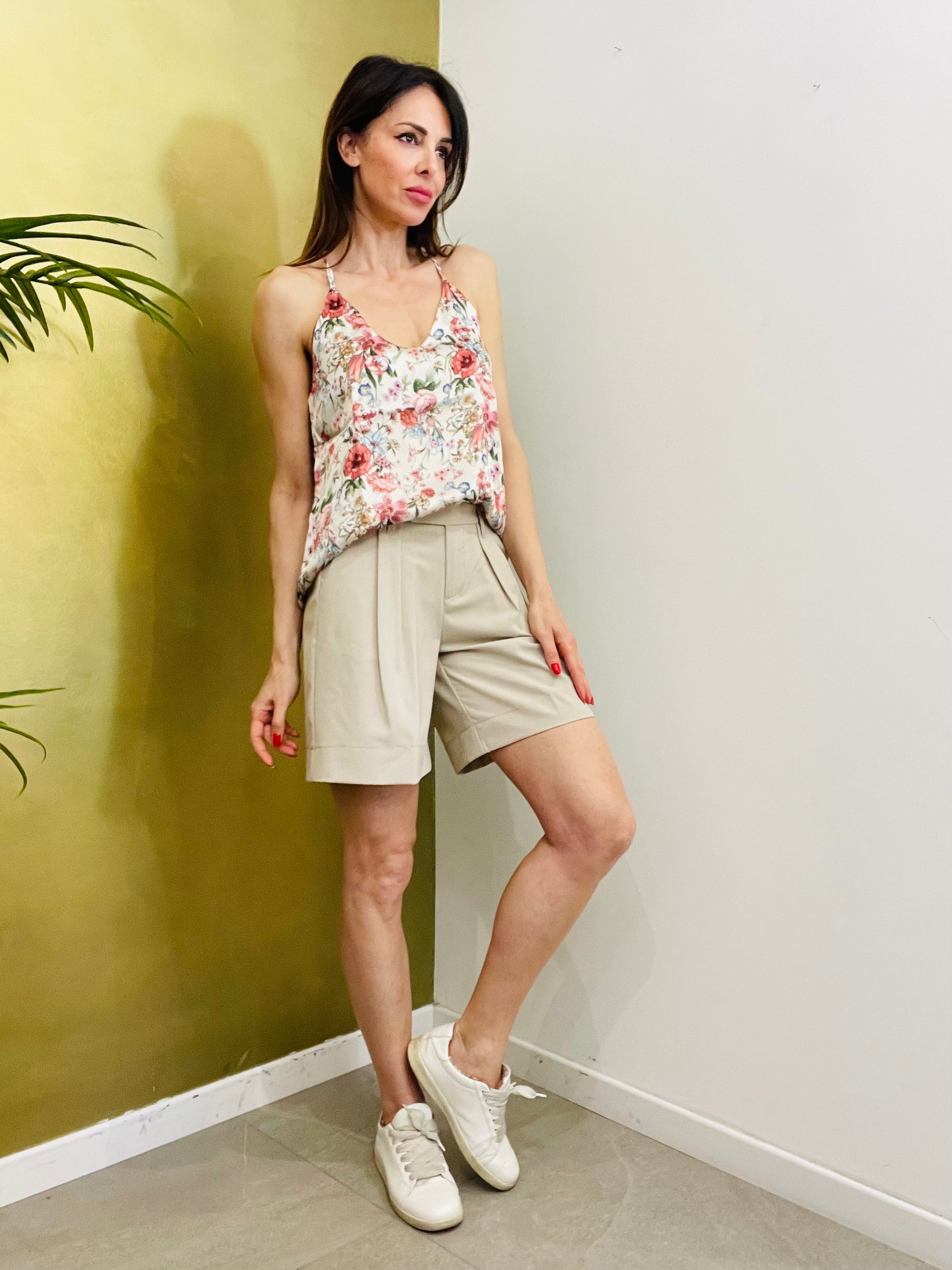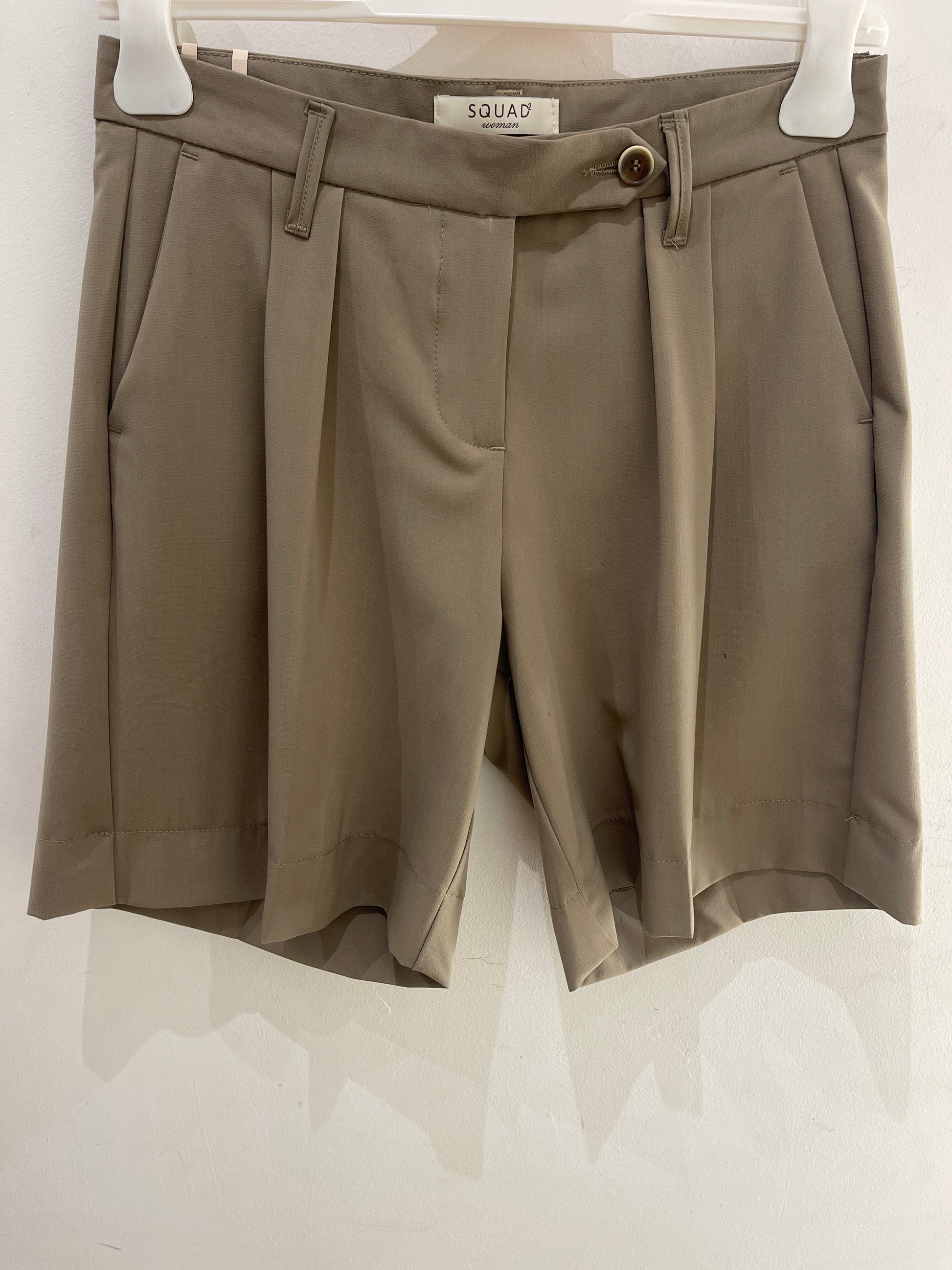 Bermuda con tasche laterali con pence sul davanti tasche a filetto sul retro pantalone, passanti per cintura chiusura con zip e bottone con gancio