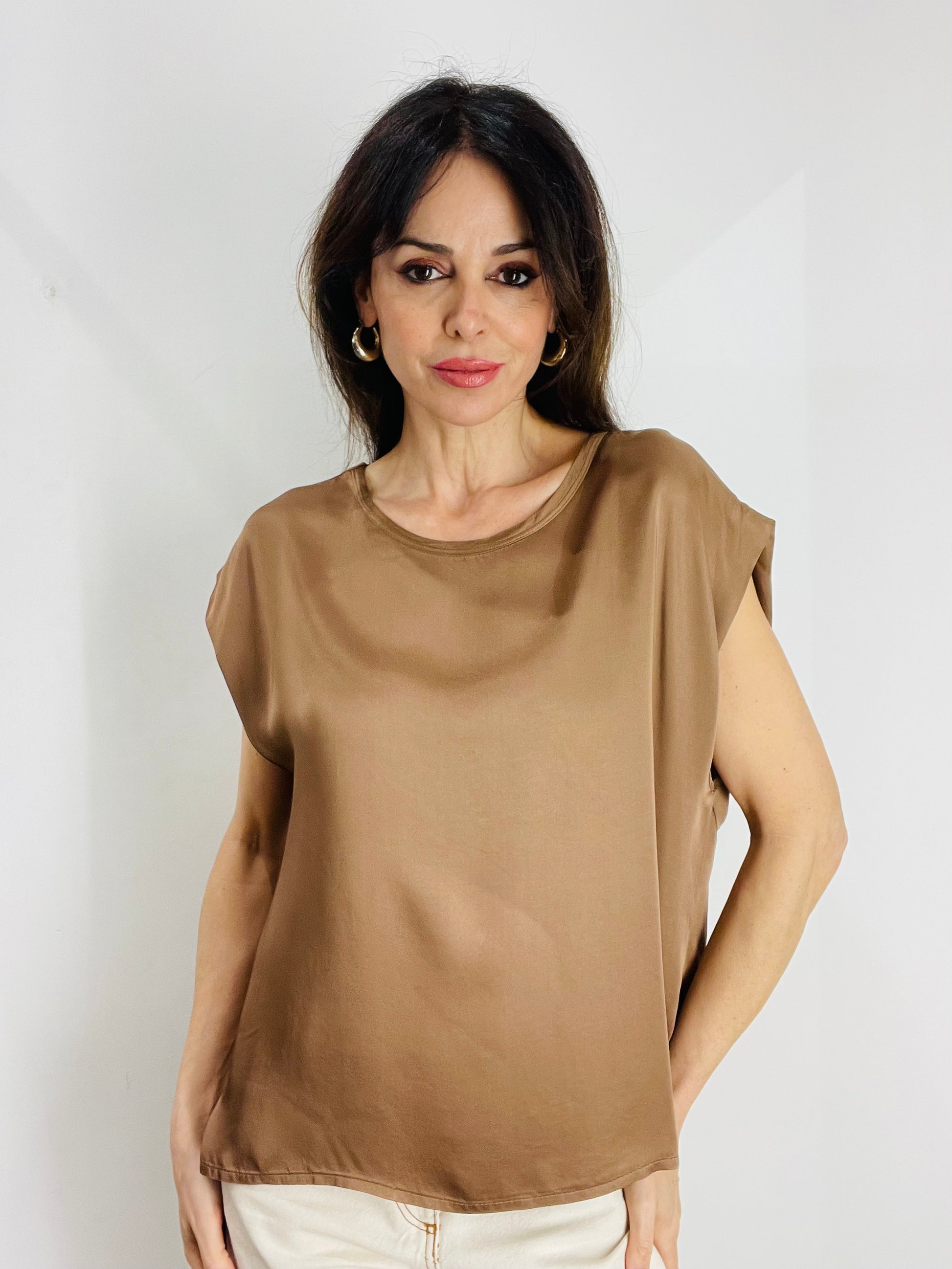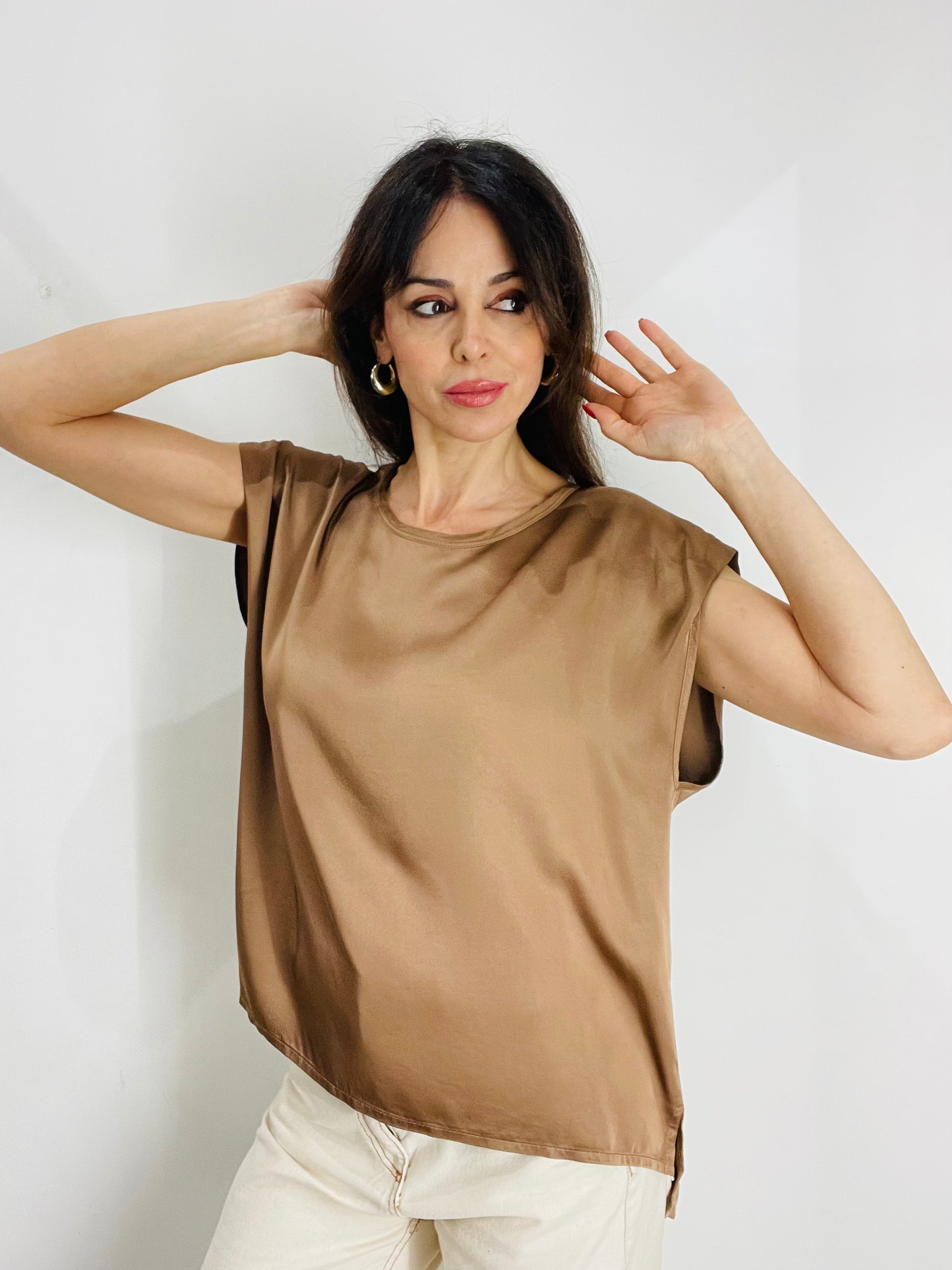 Blusa girocollo in viscosa a mezza manica sfuggente con giro manica ampio, leggermente più lunga sul retro con leggeri spacchi laterali sul fondo maglia