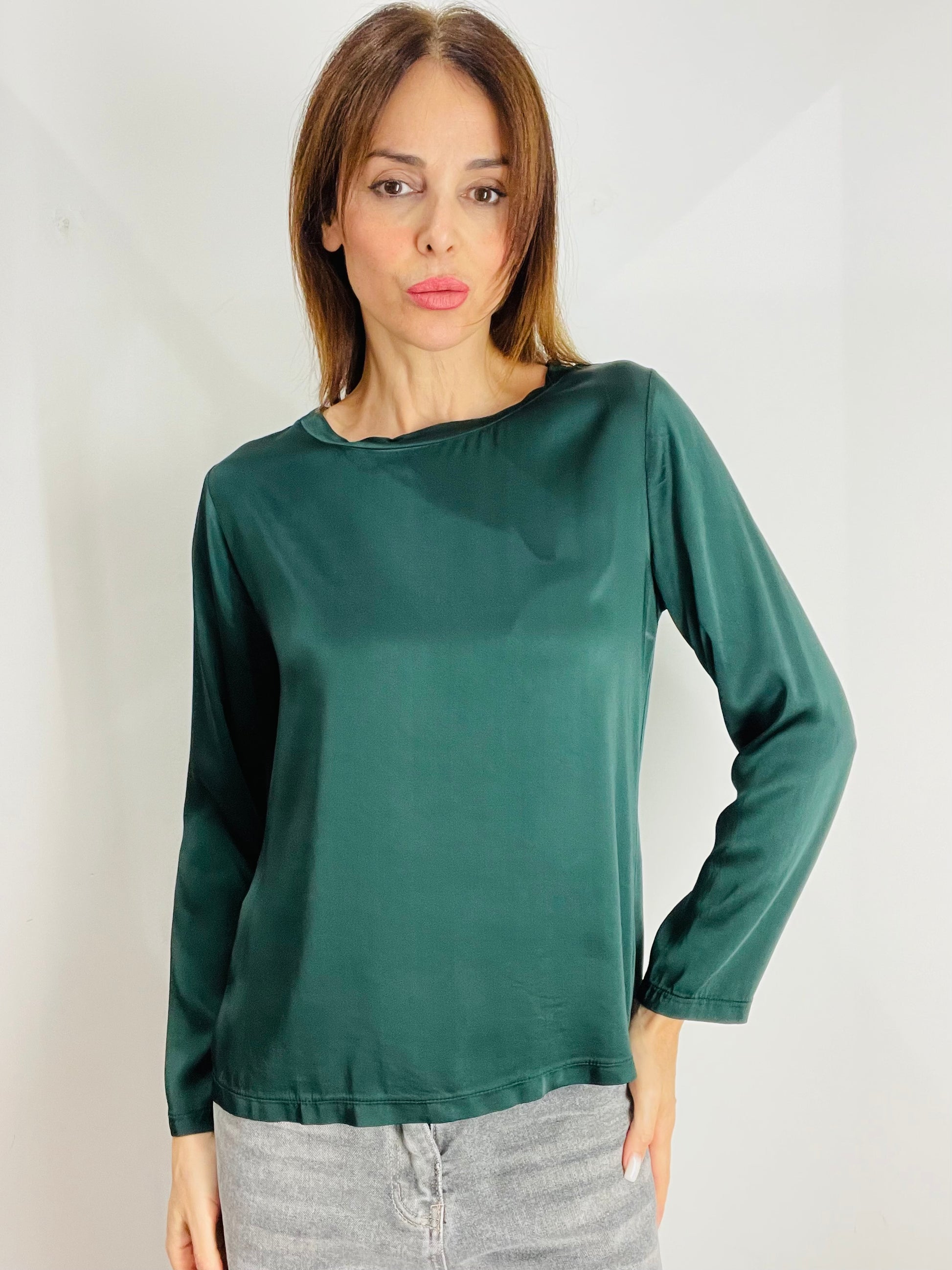 Blusa in Satin lucida a girocollo con manica lunga, leggermente elasticizzata, Vestibilità regolare