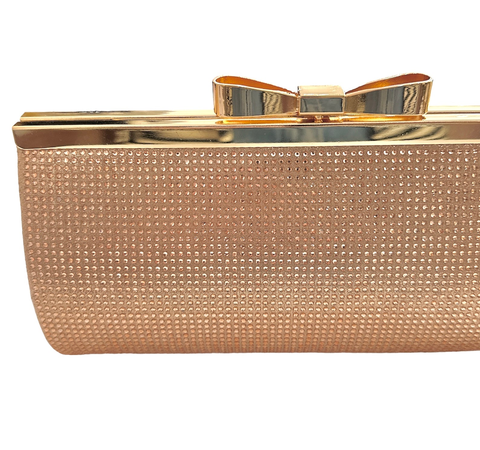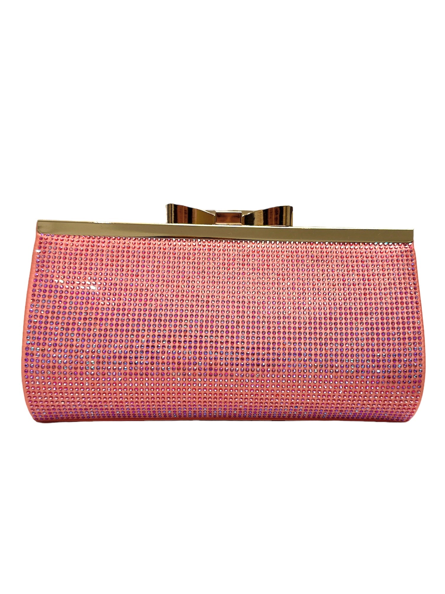 Borsa clutch con dettagli di strass applicati su tutta la parte frontale, il retro rimane liscio.