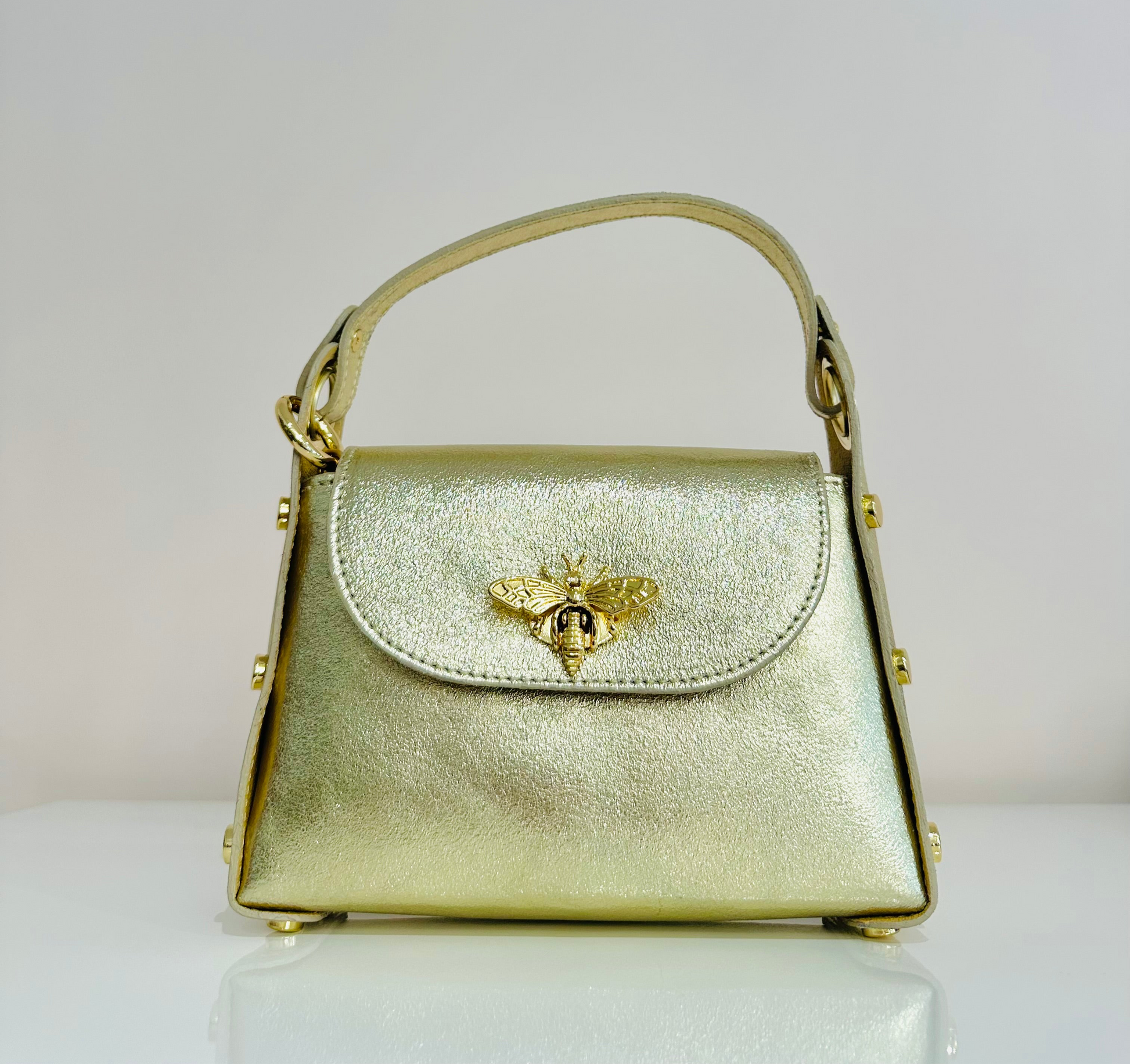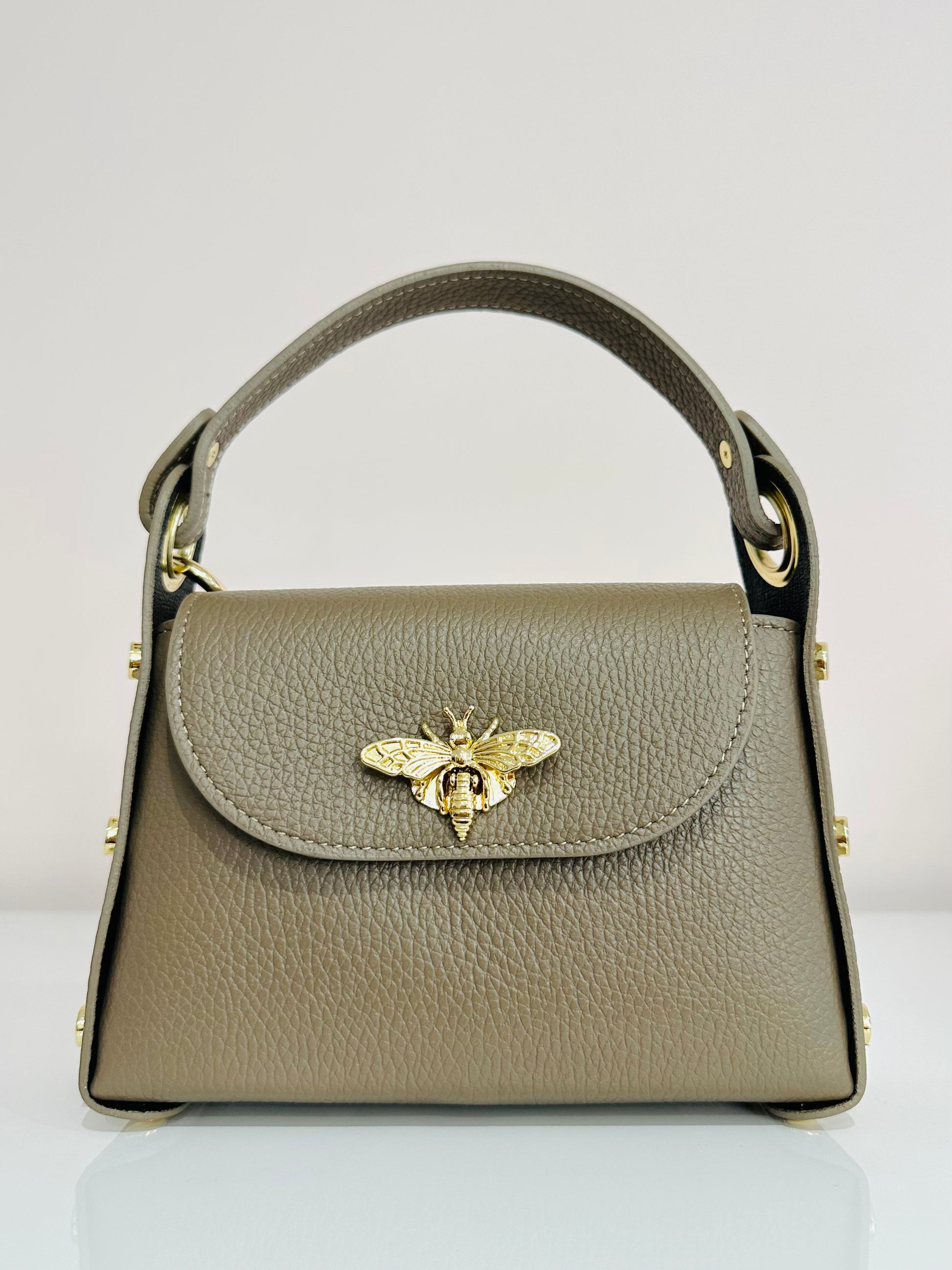 Borsa in vera pelle con dettaglio di chiusura con ape