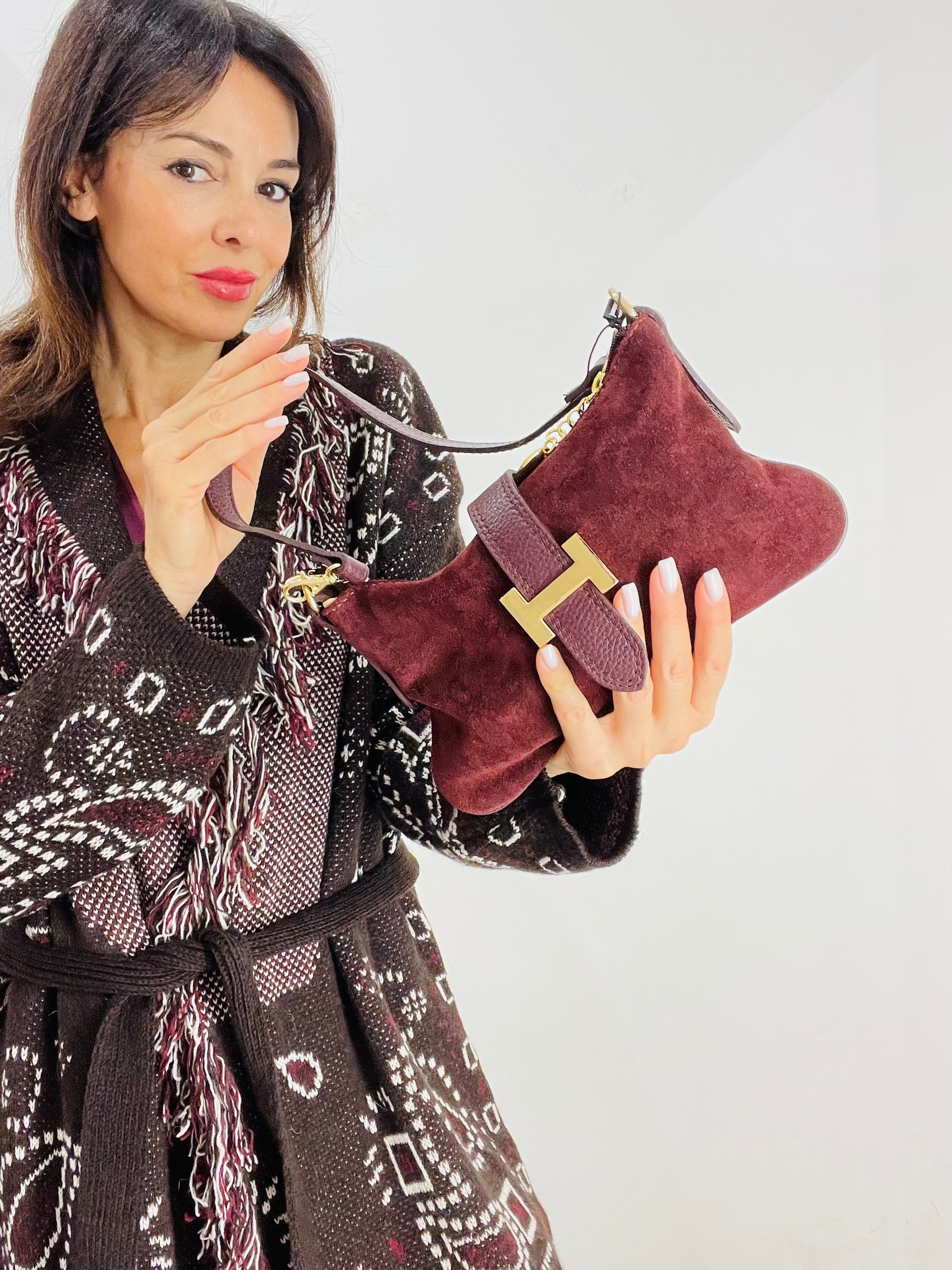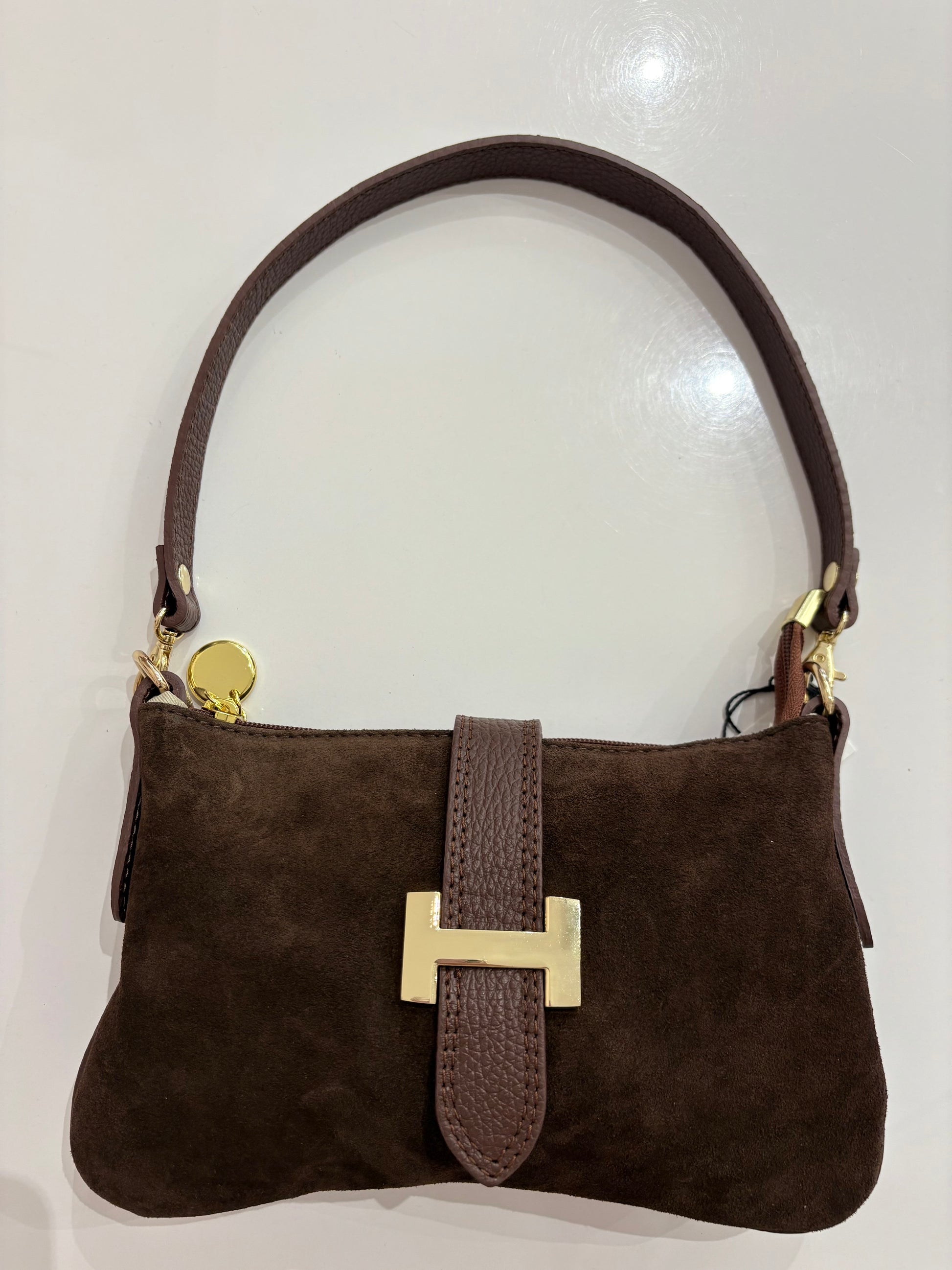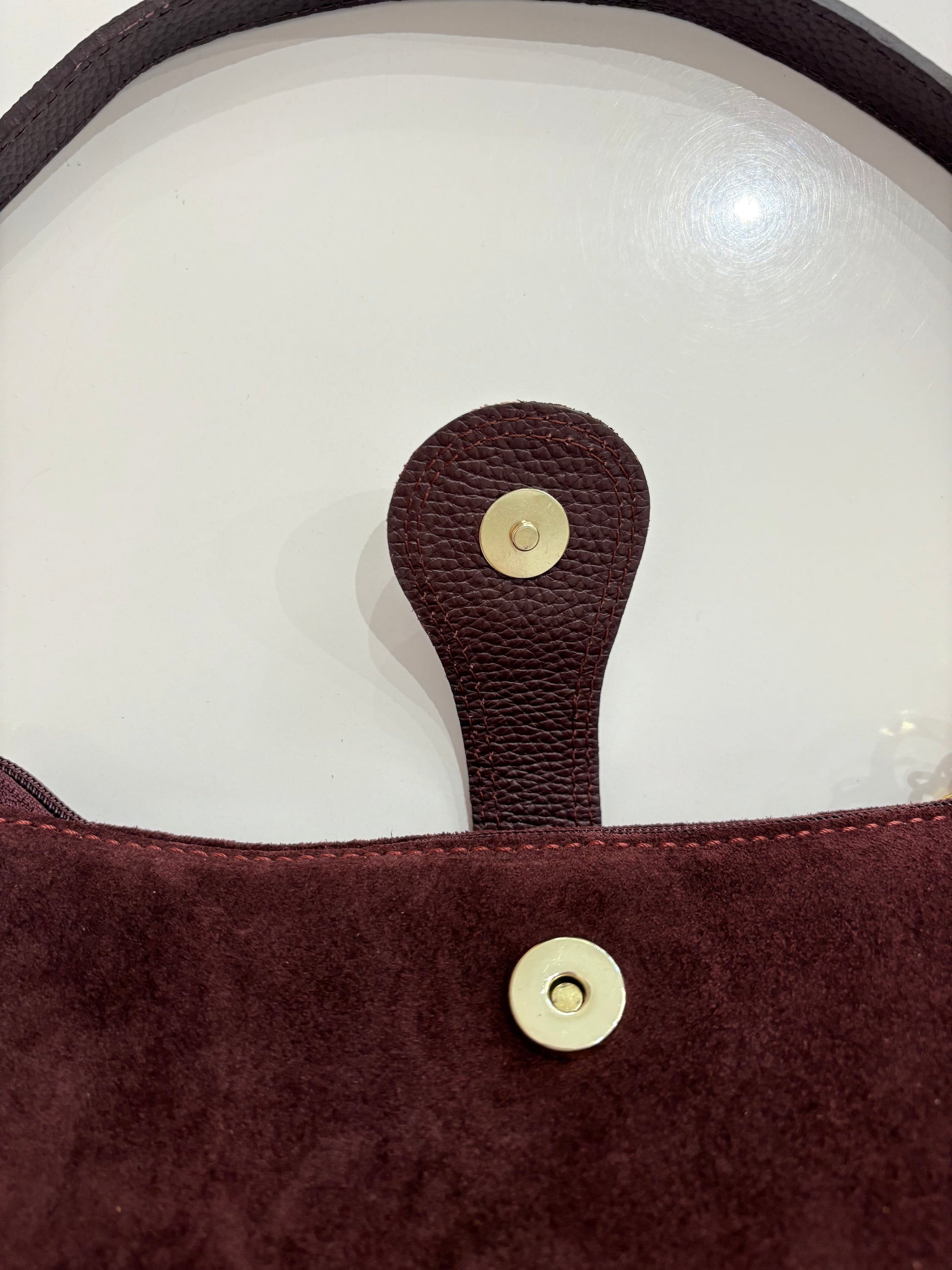 Borsa in vera pelle scamosciata, chiusura con bottone e zip, borsa con tracolla