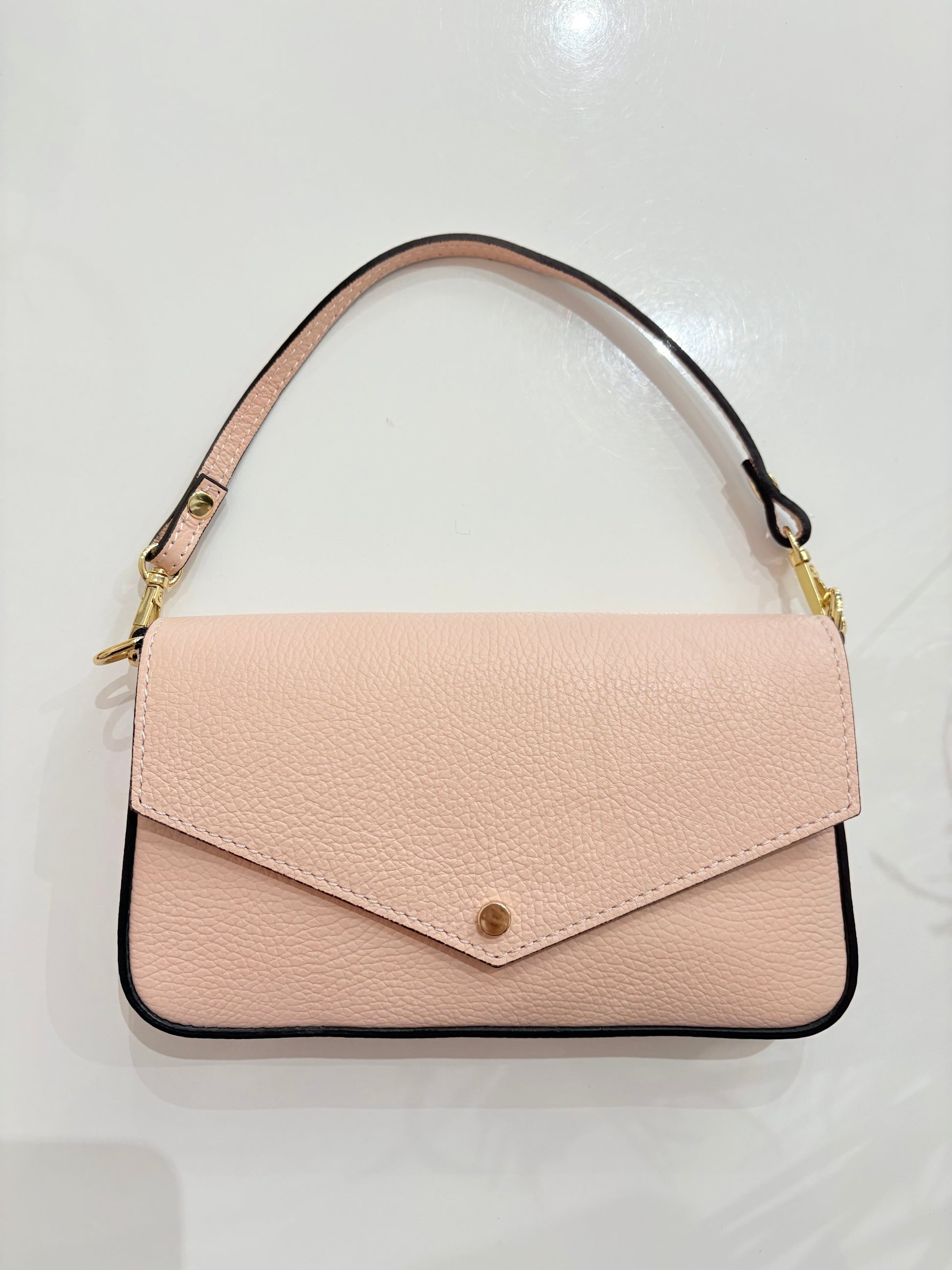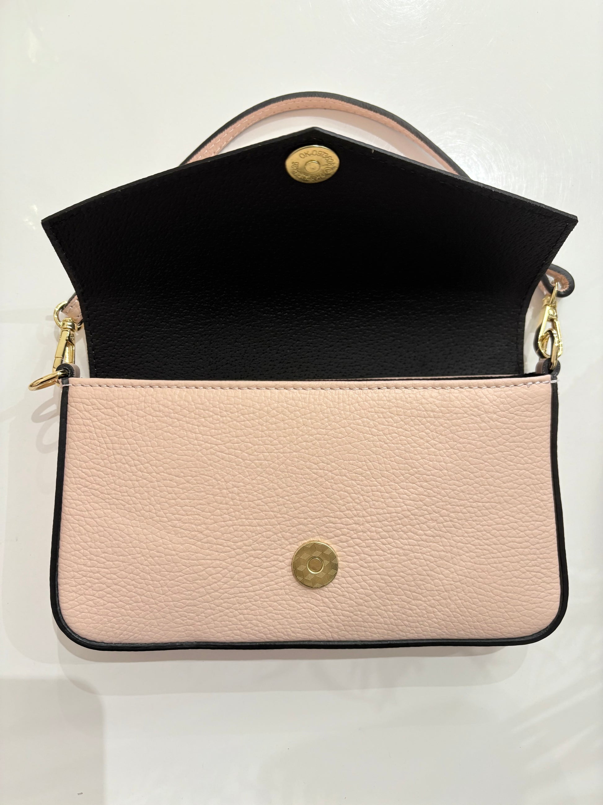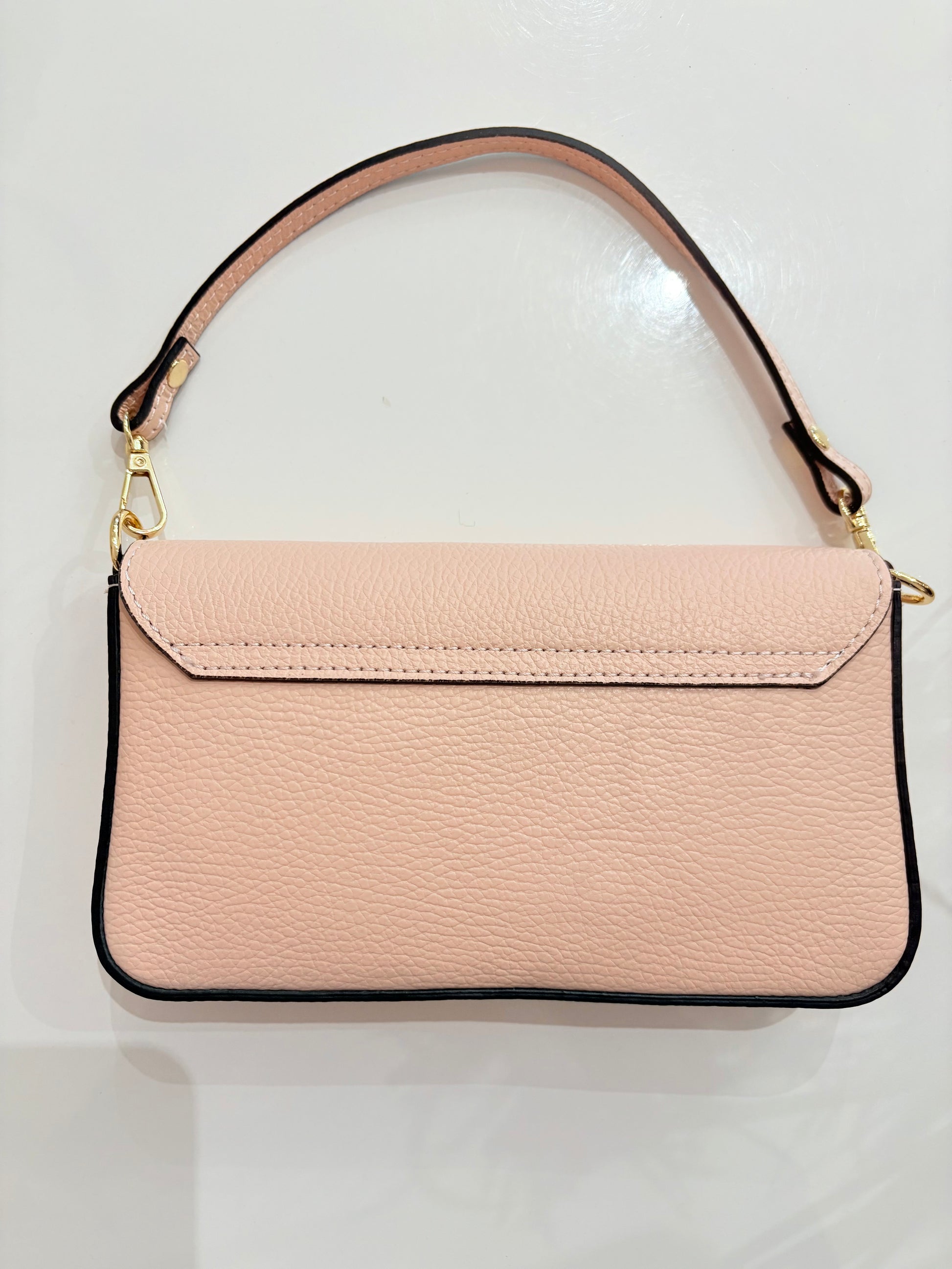 Borsa in vera pelle con manico e tracolla all’interno, rifiniture in nero, chiusura con bottone magnetico, tasca interna