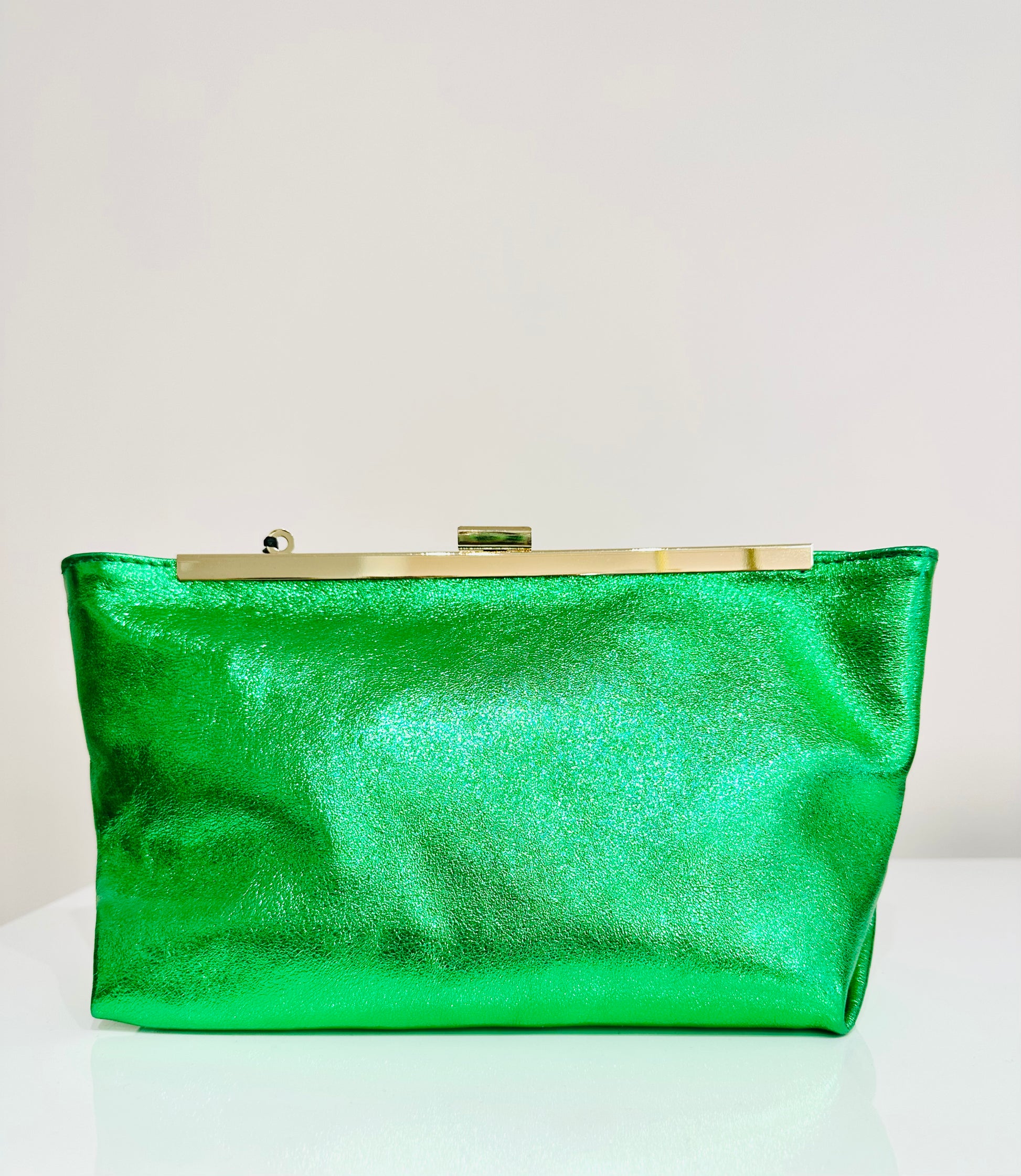 Pochette in pelle laminata con catena dorata e chiusura a clip.