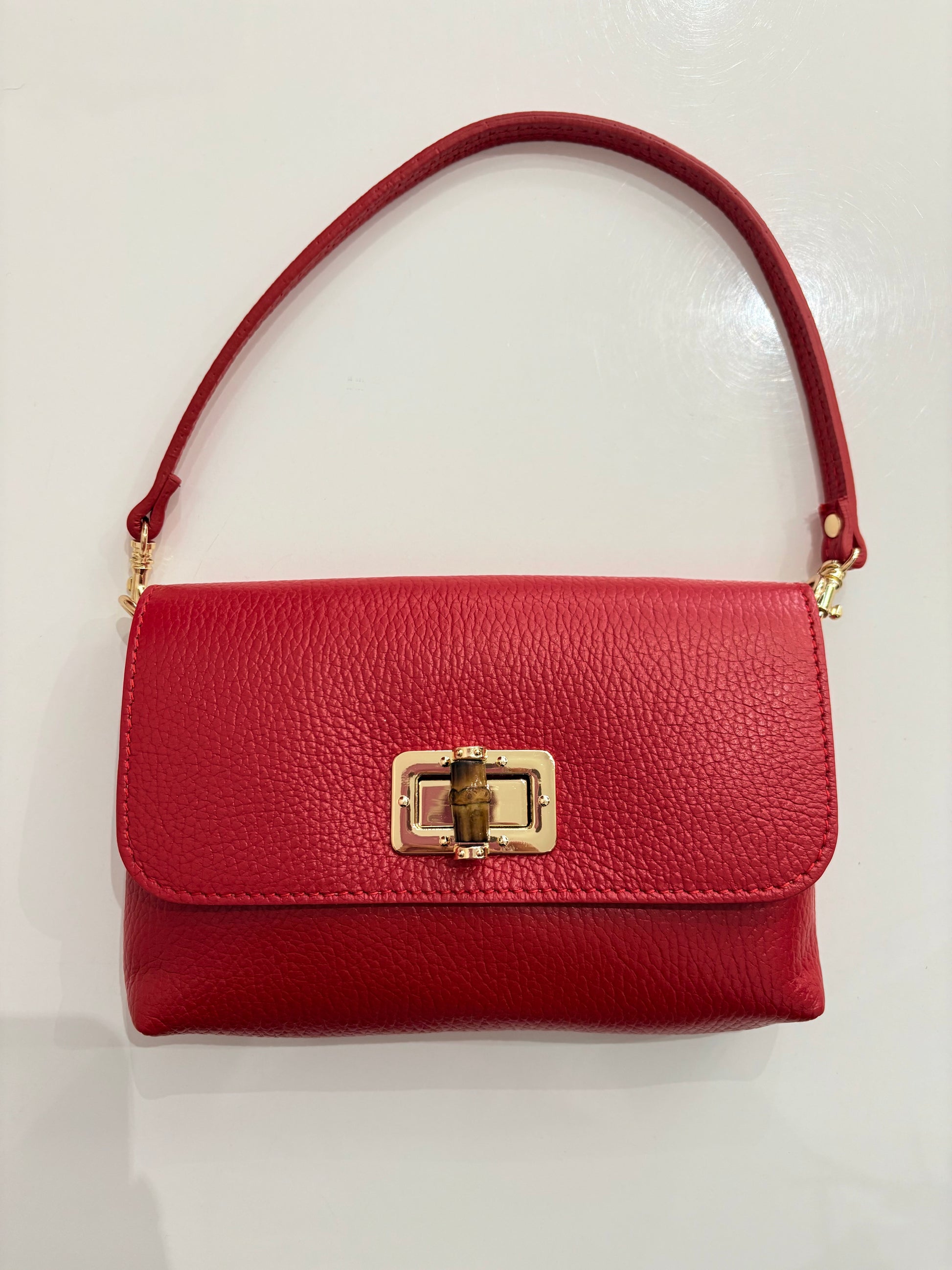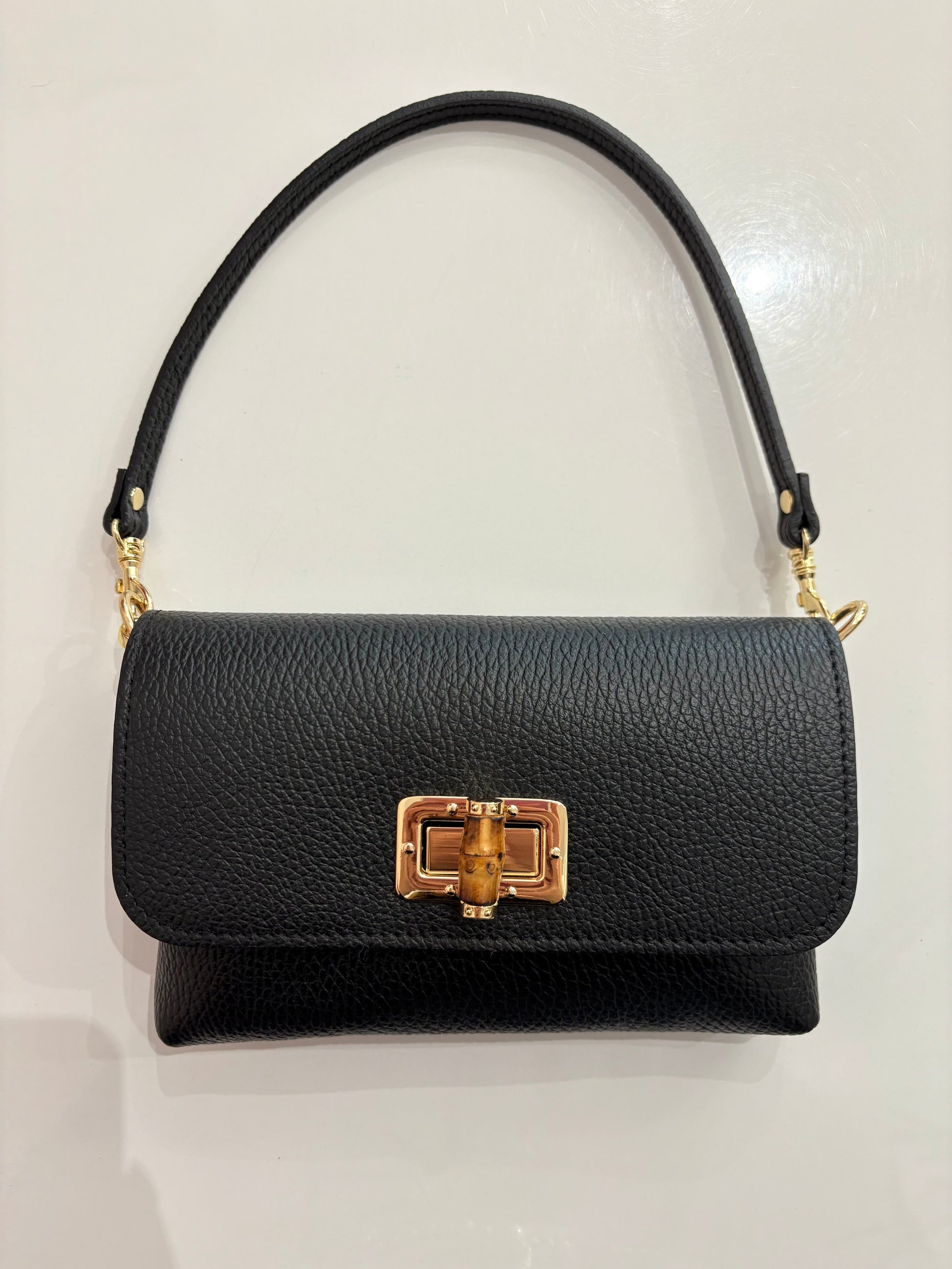 Borsetta in vera pelle con tracolla a catena e manico, chiusura con gancio