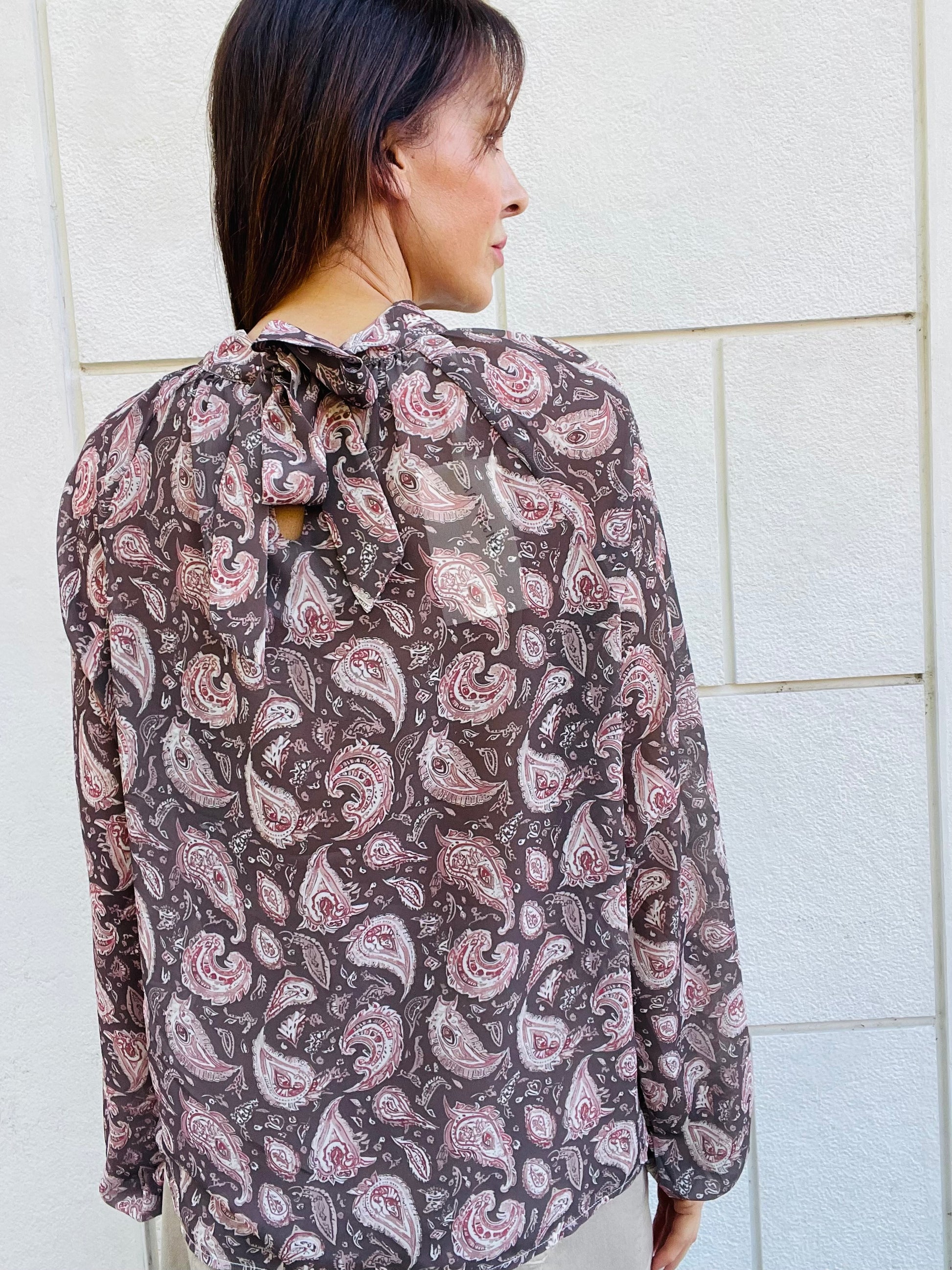 Camicia fantasia cachemire con apertura a goccia sul davanti e chiusura con nastro sul retro, manica ampia con elastico sul fondo