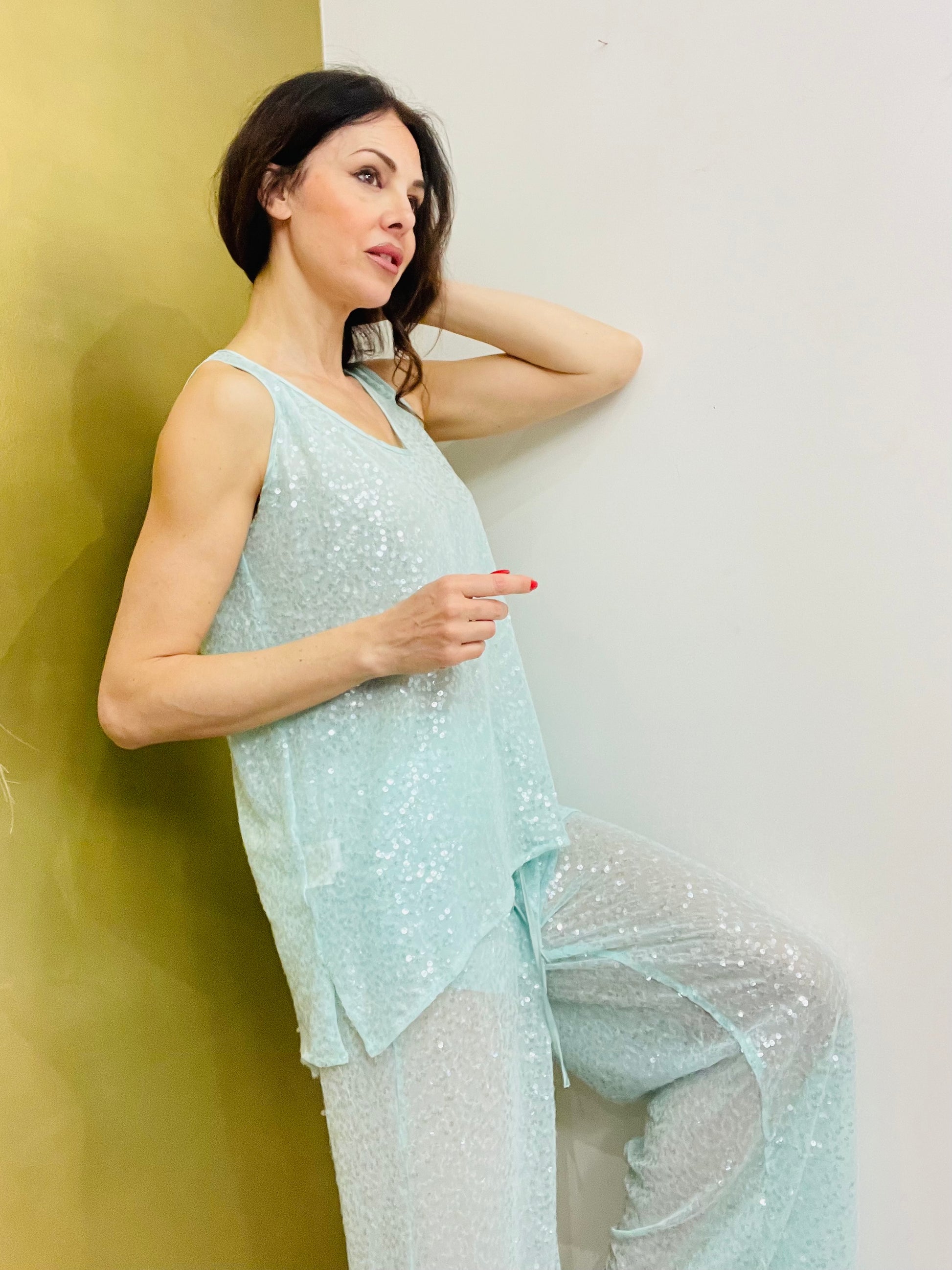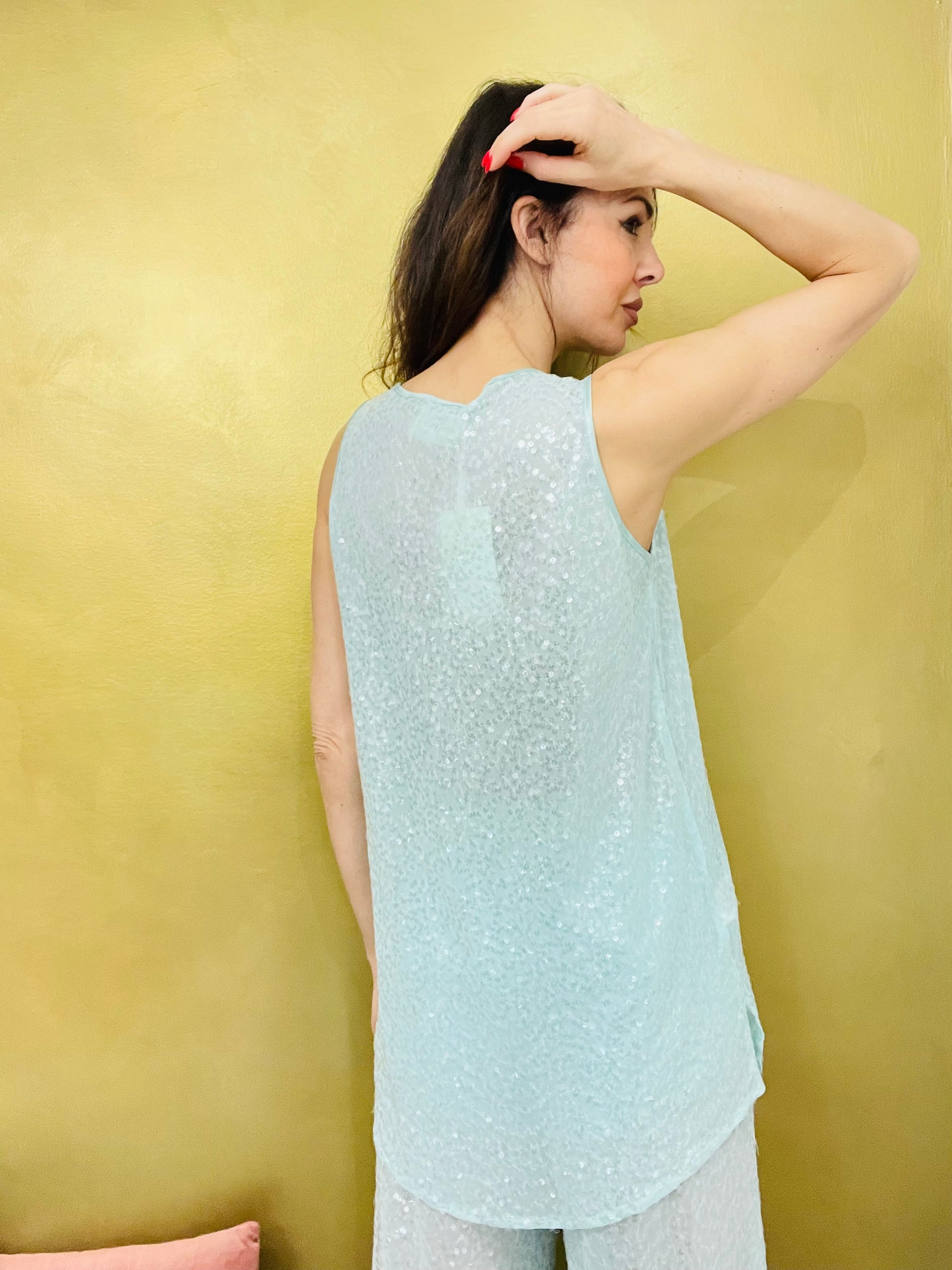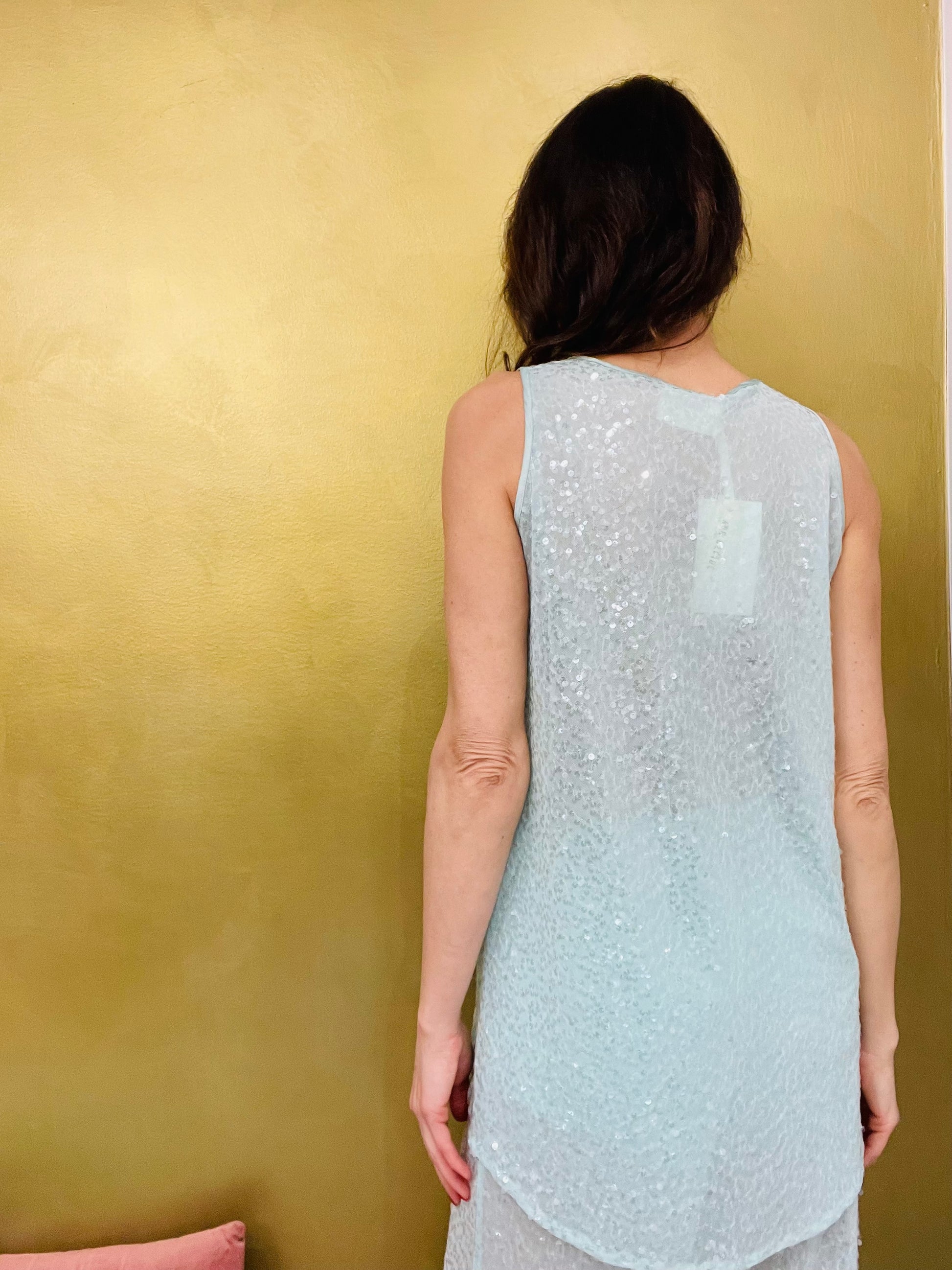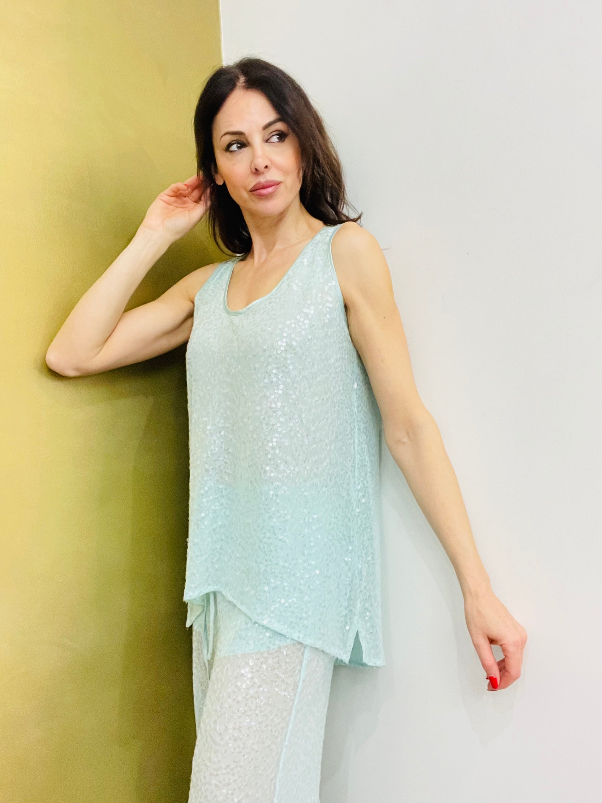Canotta lunga in paillettes con scollo a giro ampio , spacchetti laterali leggermente più lunga e stondata nella parte retro vestibilità over BORDINI in raso nel girocollo e nel giromanica