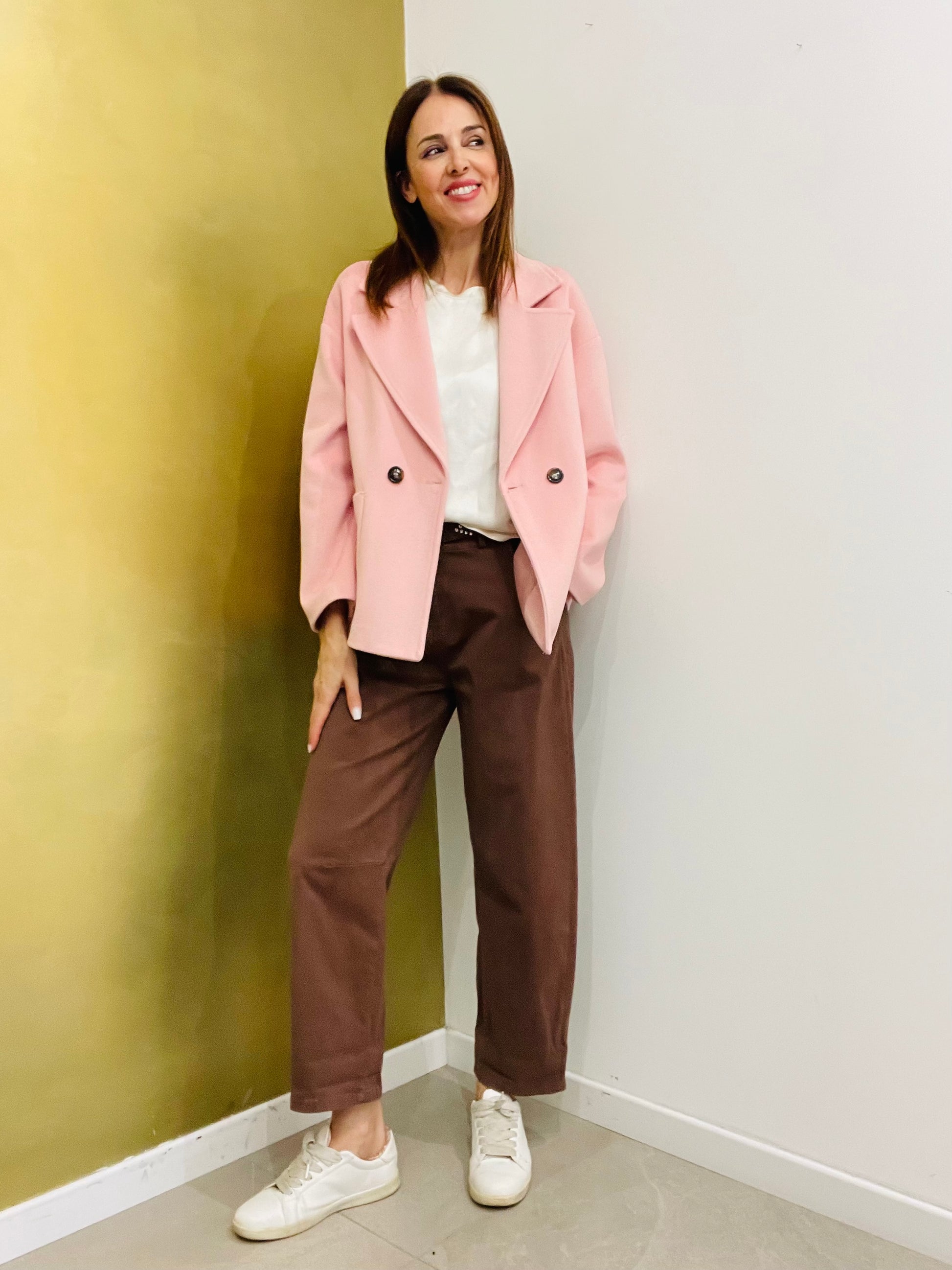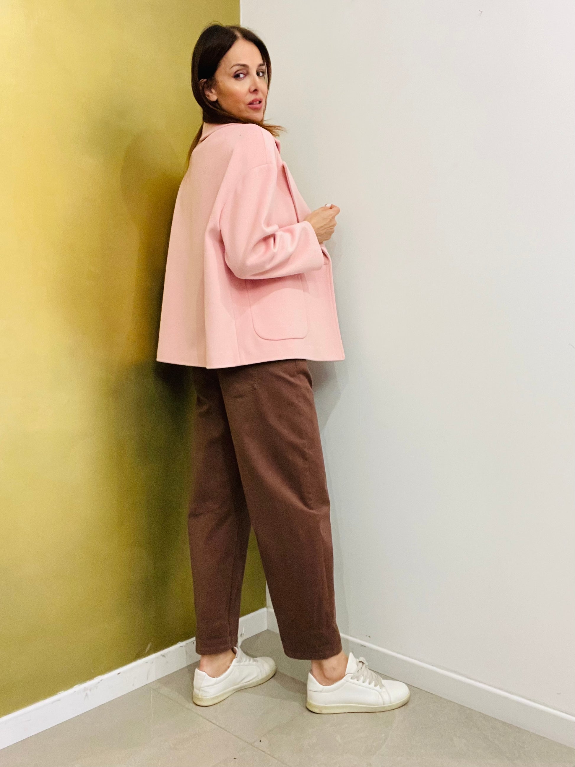 Cappotto corto a doppiopetto con tasche sul davanti, taglio raglan sulla spalla