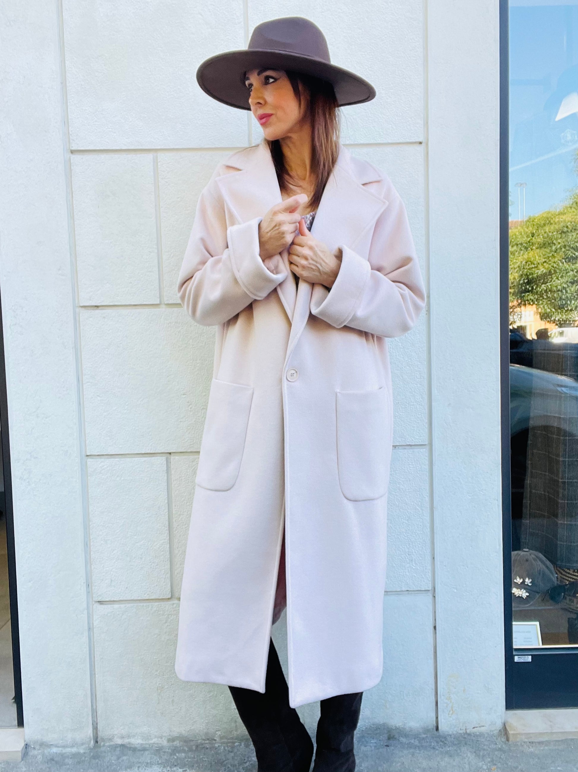 Cappotto lungo con chiusura a un bottone spalla scesa tasche applicate nella parte davanti, risvolto alto, fondo manica