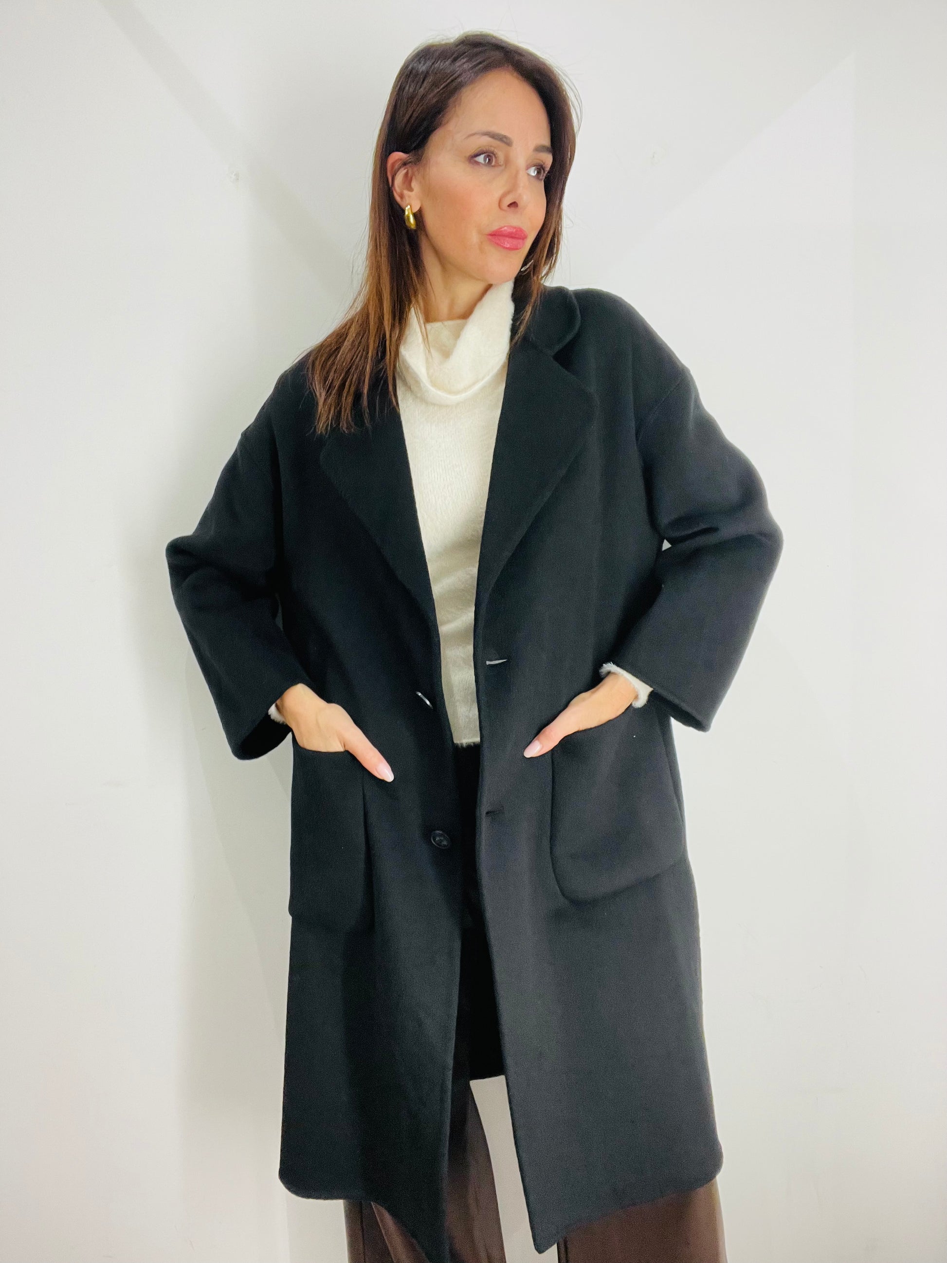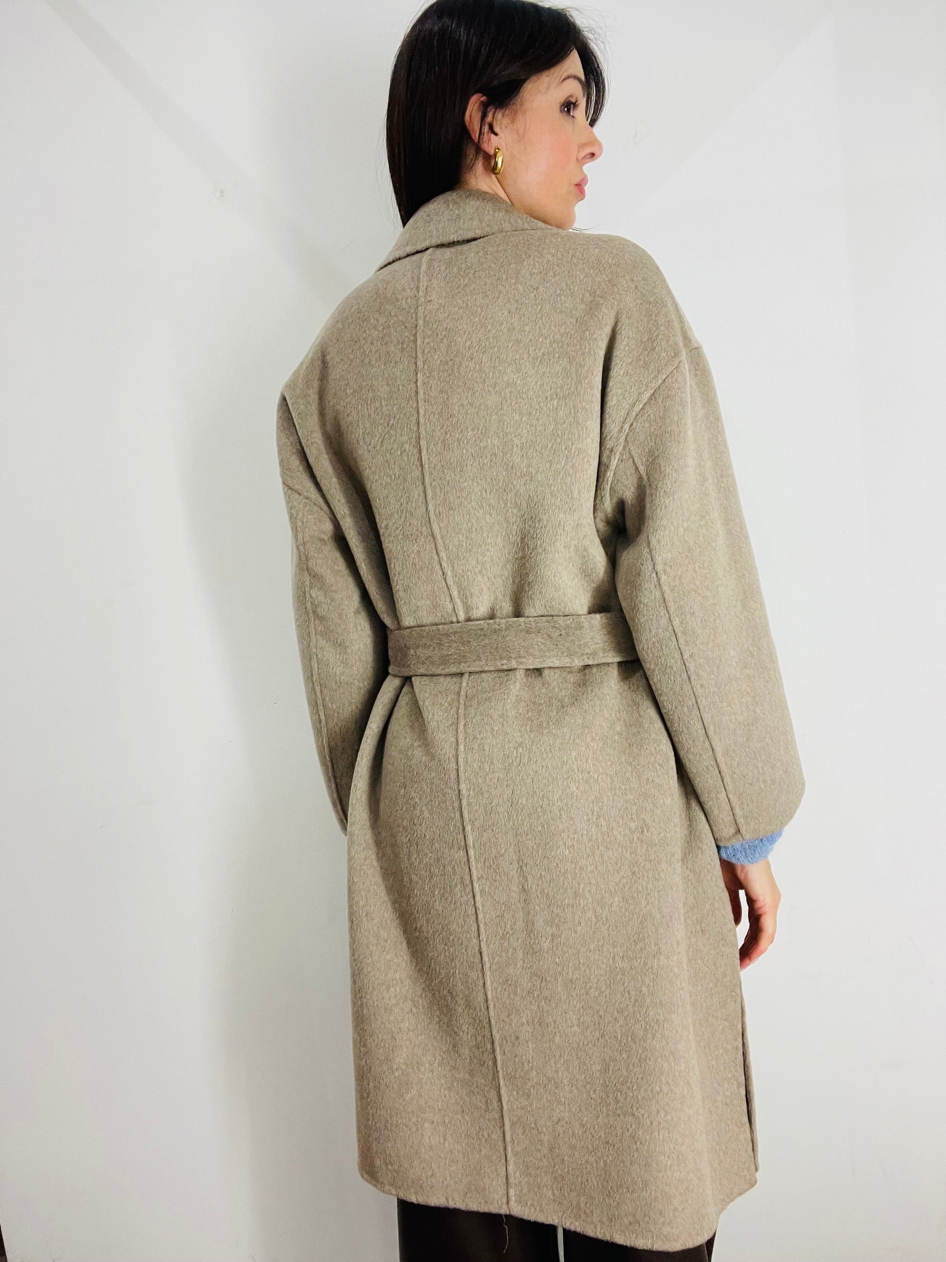 Cappotto Hand Made con taglio raglan sulla spalla e tasche laterali, spacchi sui lati del fondo cappotto, chiusura a due bottoni con cintura compresa