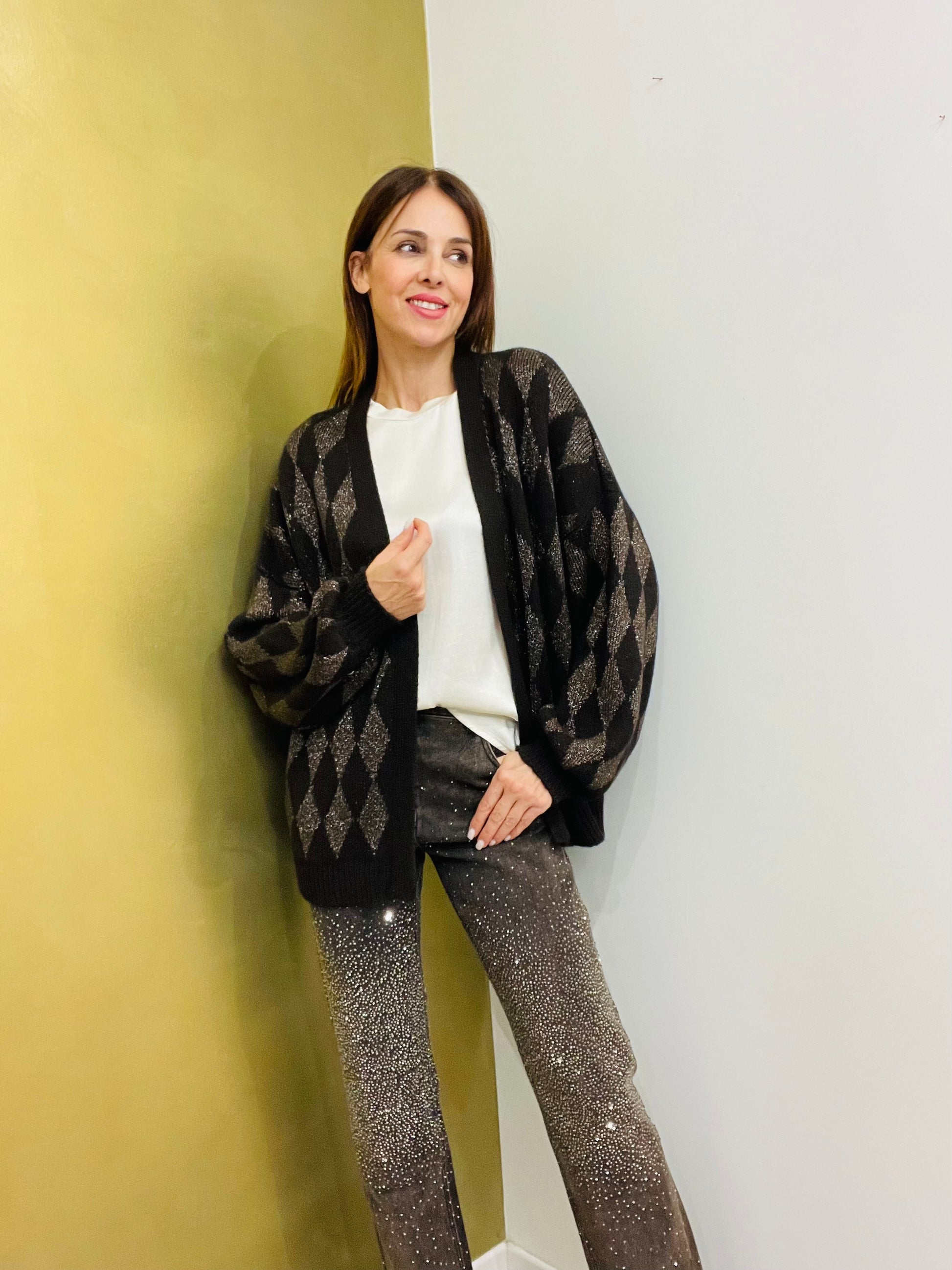 Cardigan lungo con fantasia di rombi taglia raglan sulla spalla, dettagli di costina sul fondo manica e sul fondo cardigan, con filo di lurex