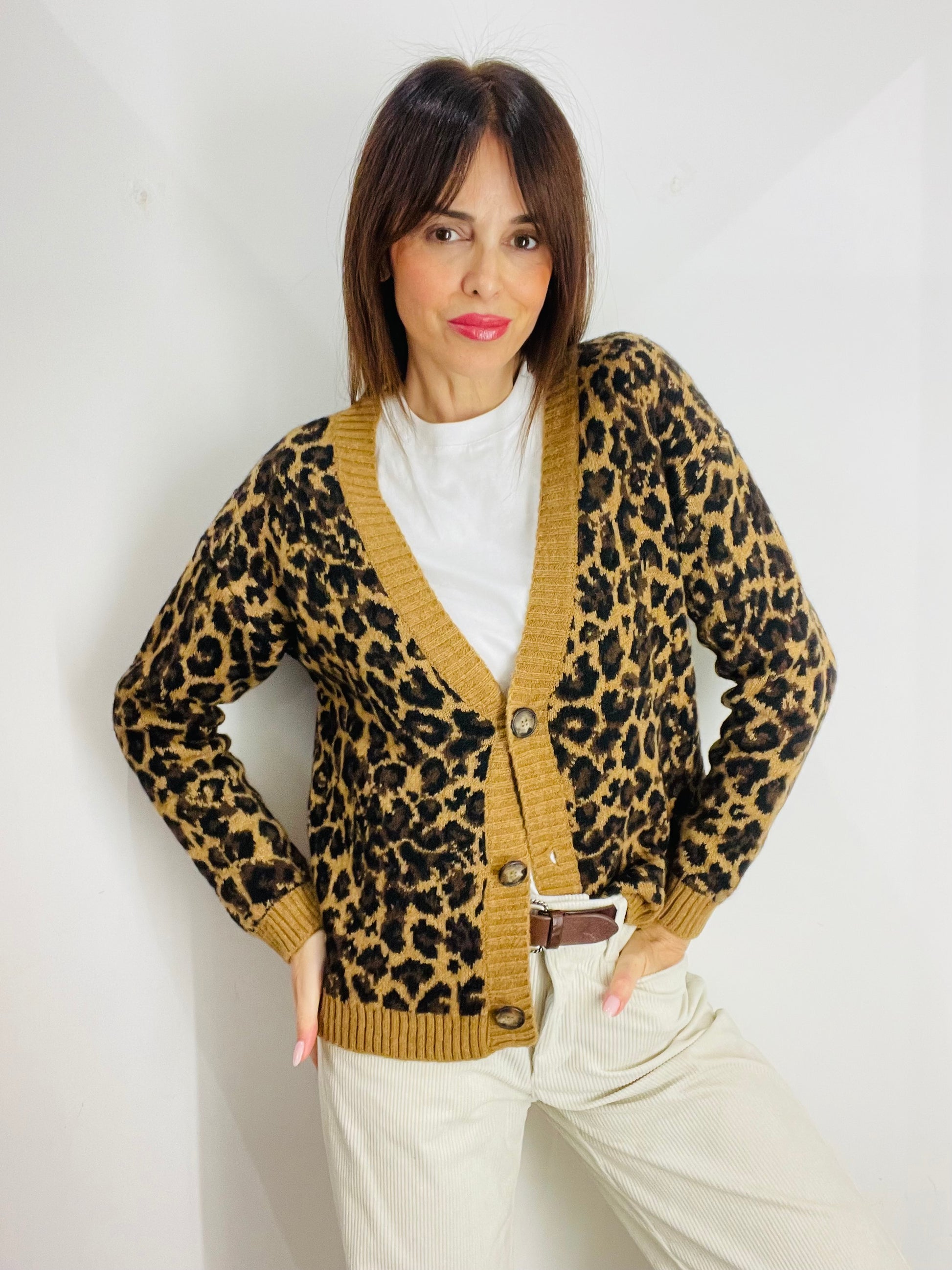 Cardigan scollo a V in fantasia maculato, dettagli di costina sul fondo manica sul fondo cardigan e sullo scollo, chiusura a tre bottoni
