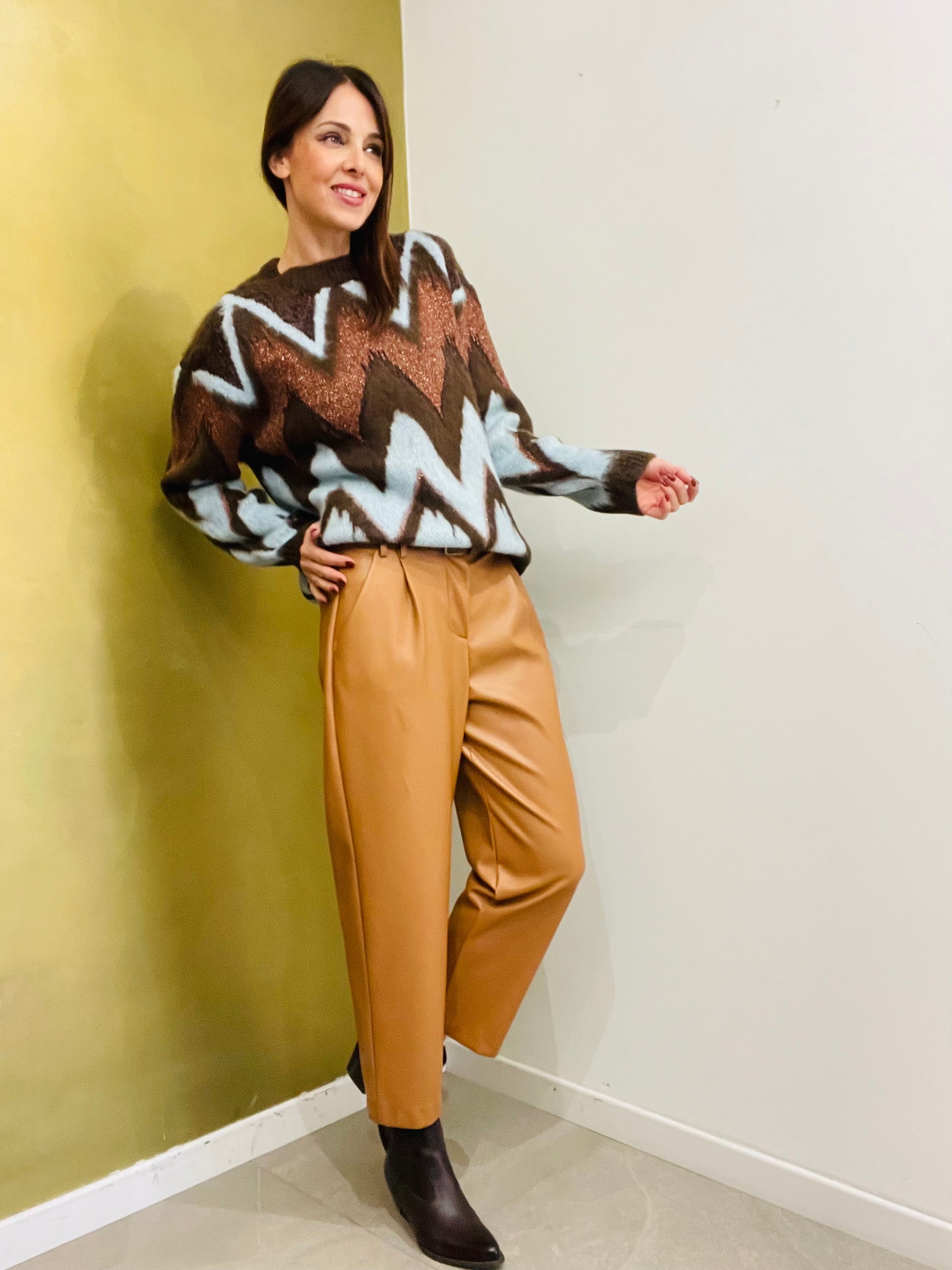 Pantalone in ecopelle dal taglio classico con pence sul davanti con tasche laterali e tasche a filetto sul retro, chiusura con zip e bottone passanti in vita con cintura compresa, elastico sul retro vita