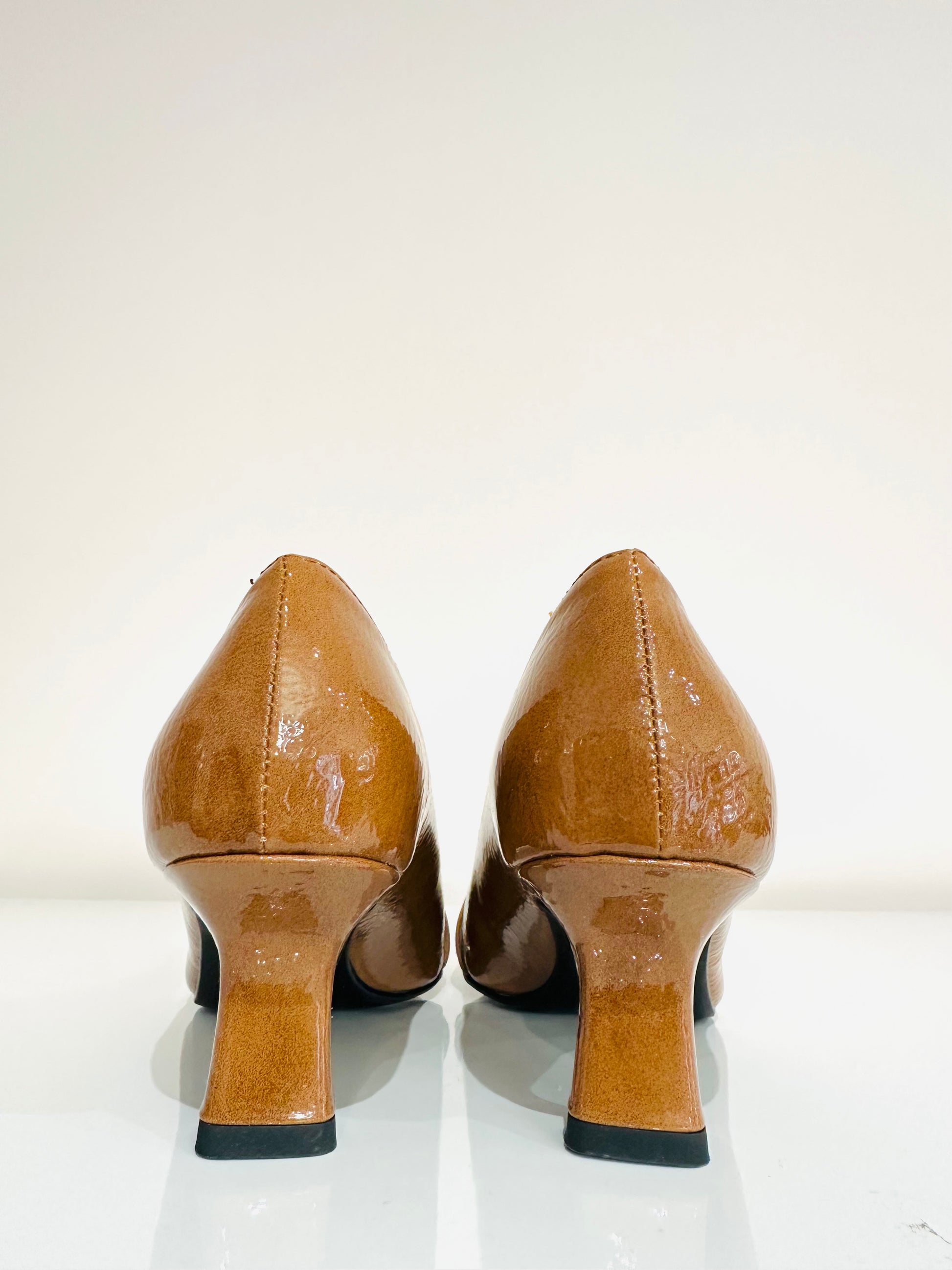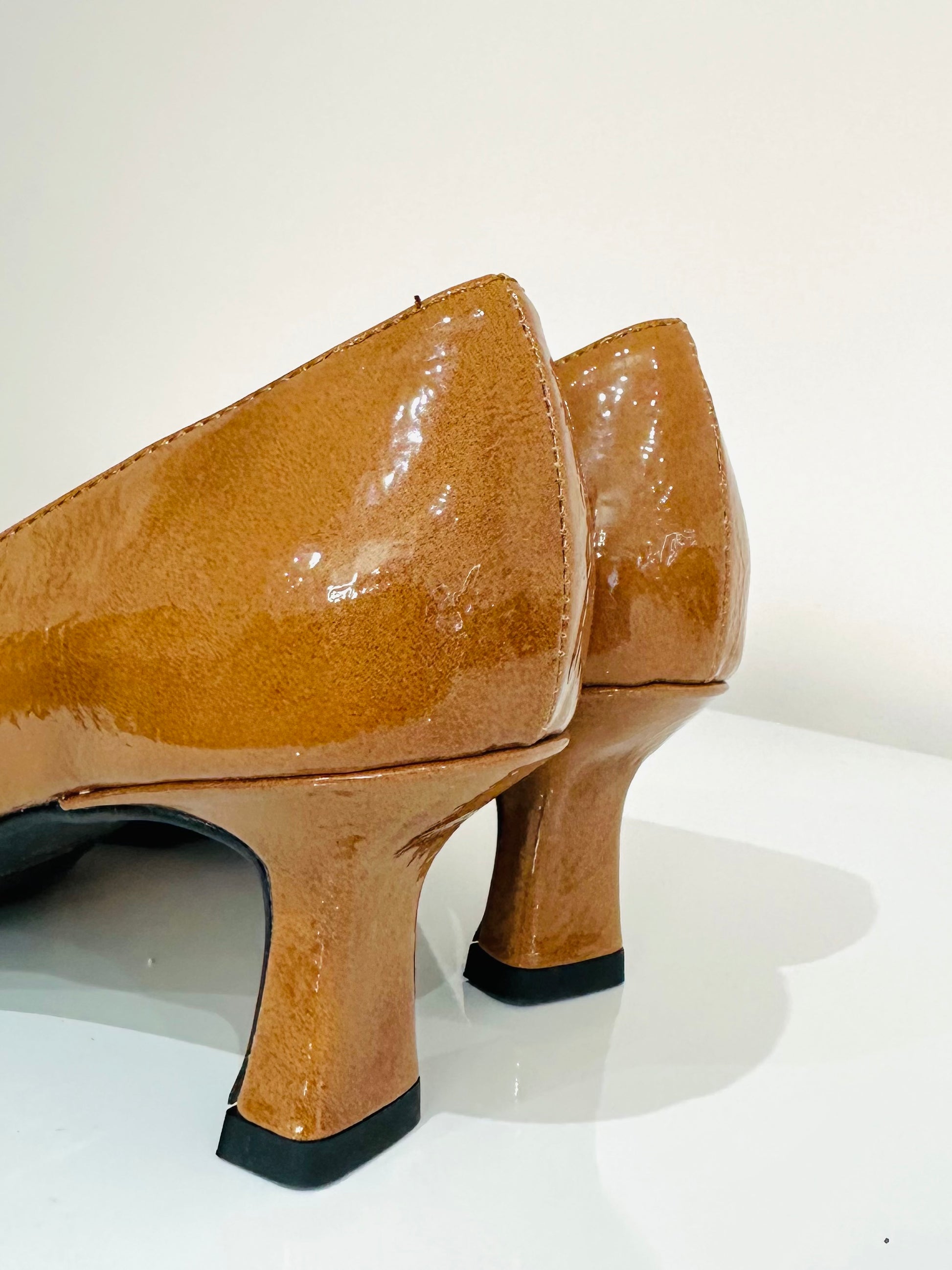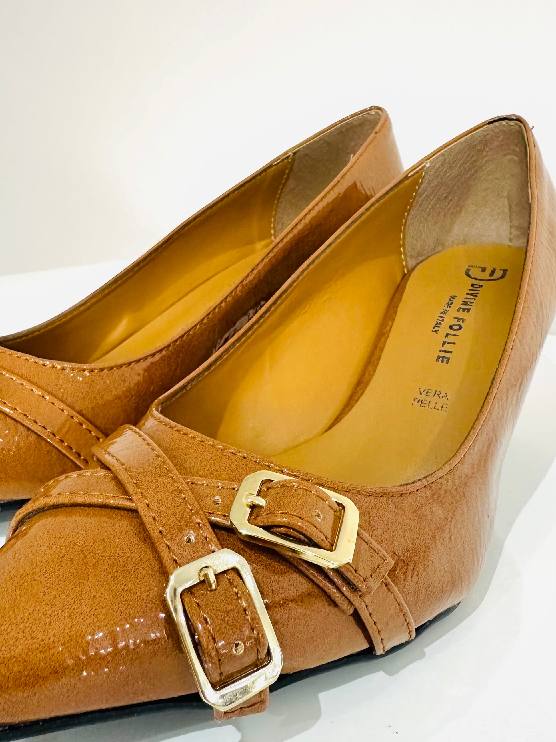 Décolleté in vernice cuoio con dettaglio di fibbie con cinturino nella parte frontale