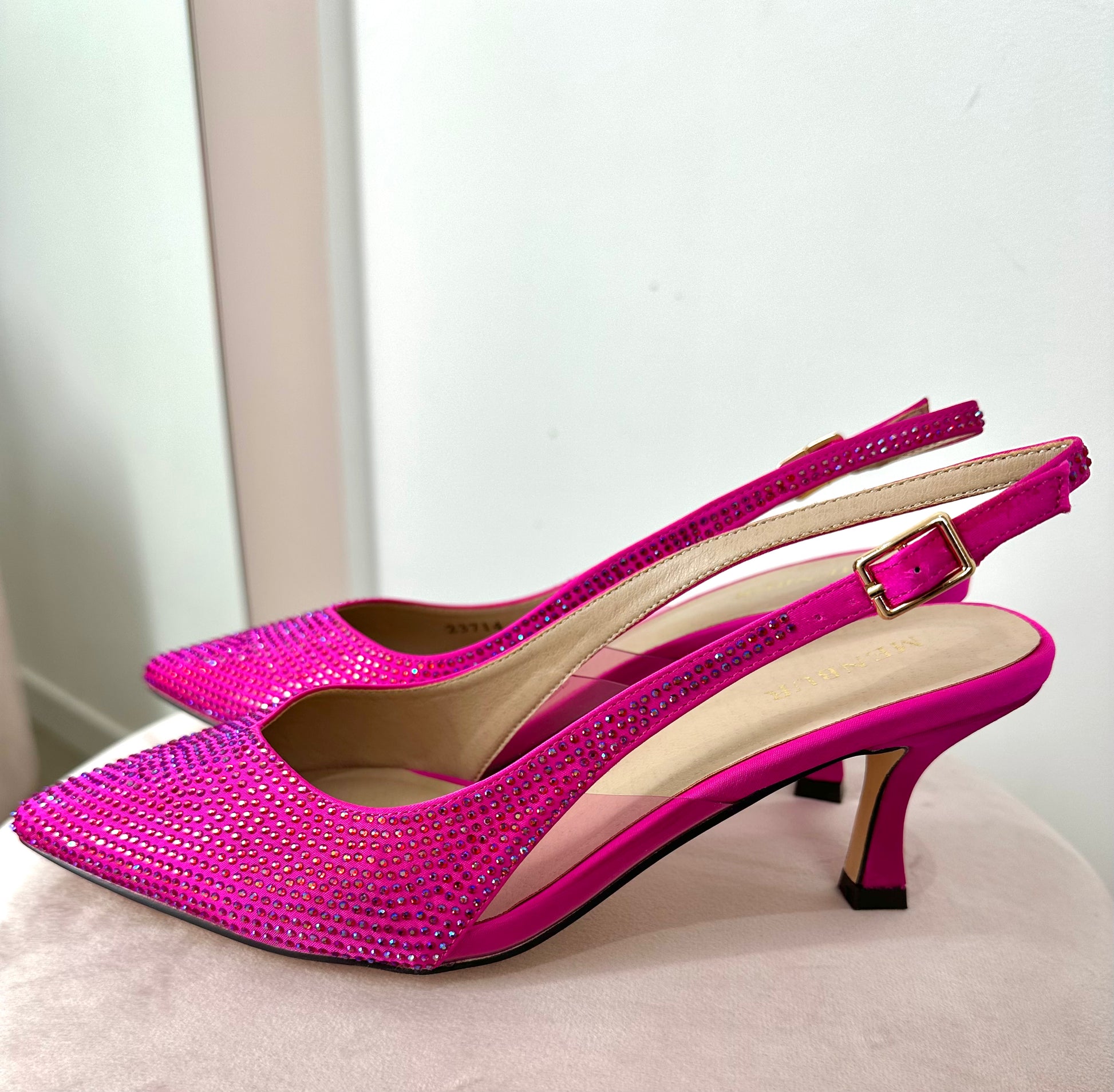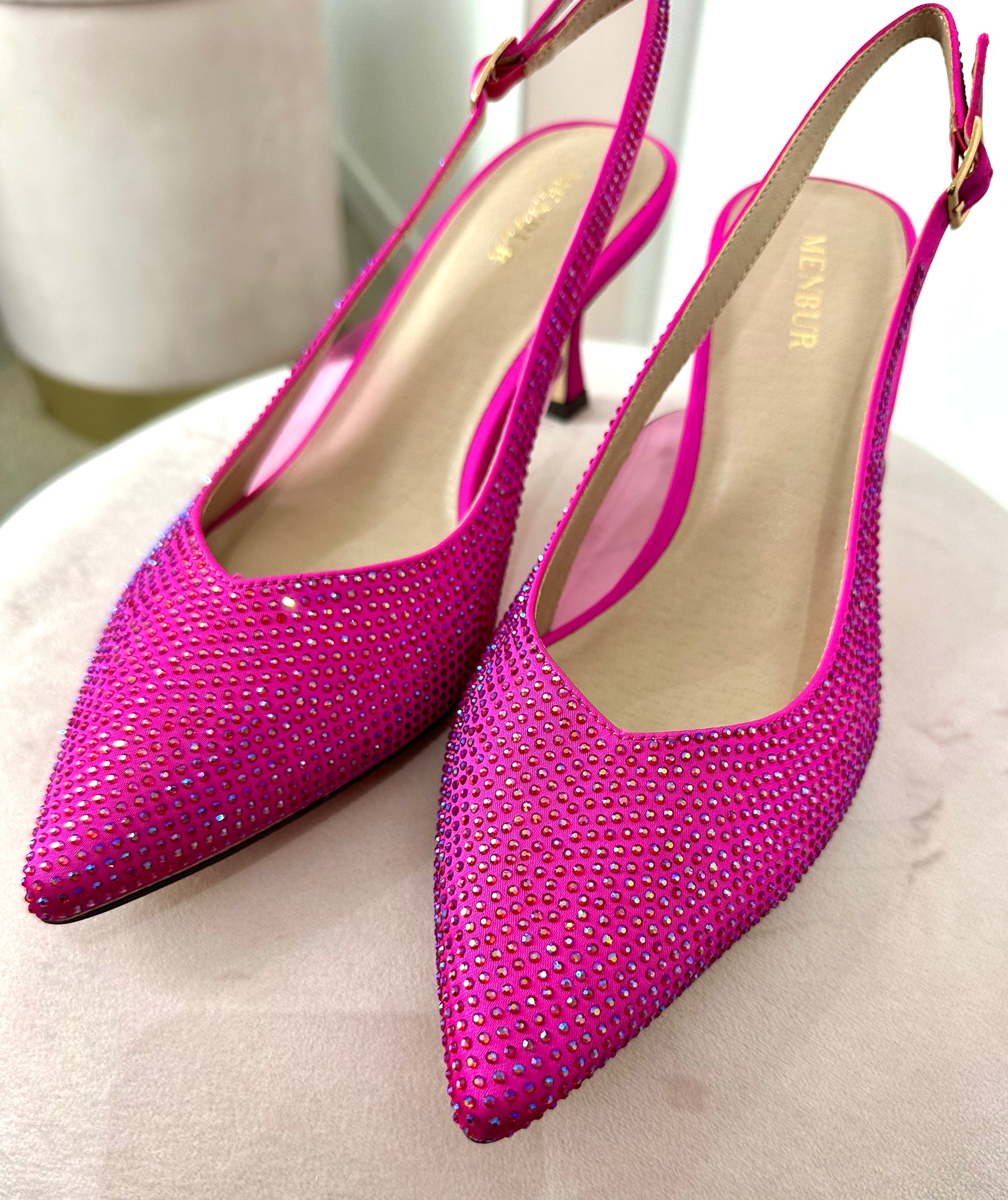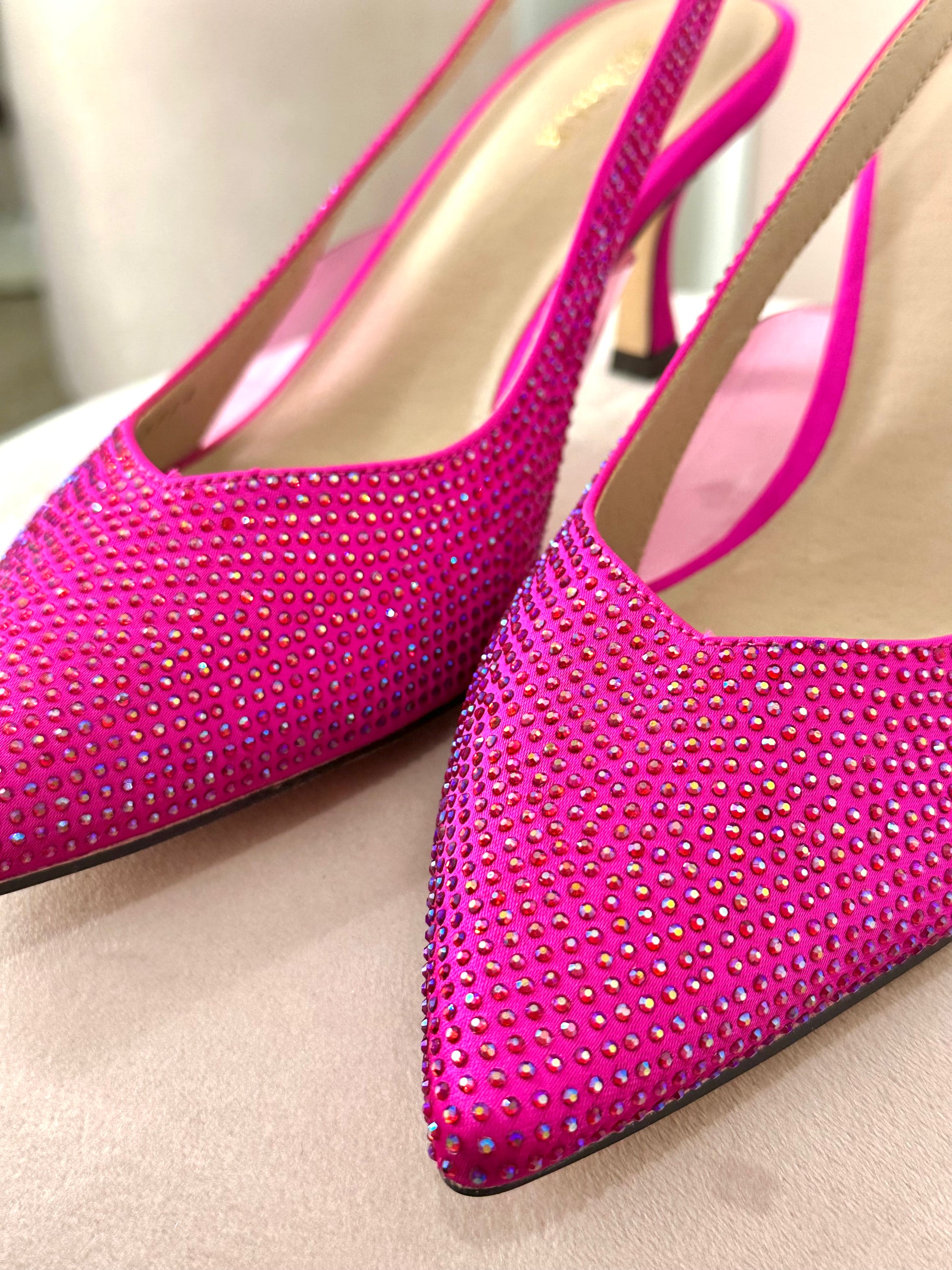 Décolleté slingback con inserti in materiale polimerico trasparente e interamente ricoperto di strass .