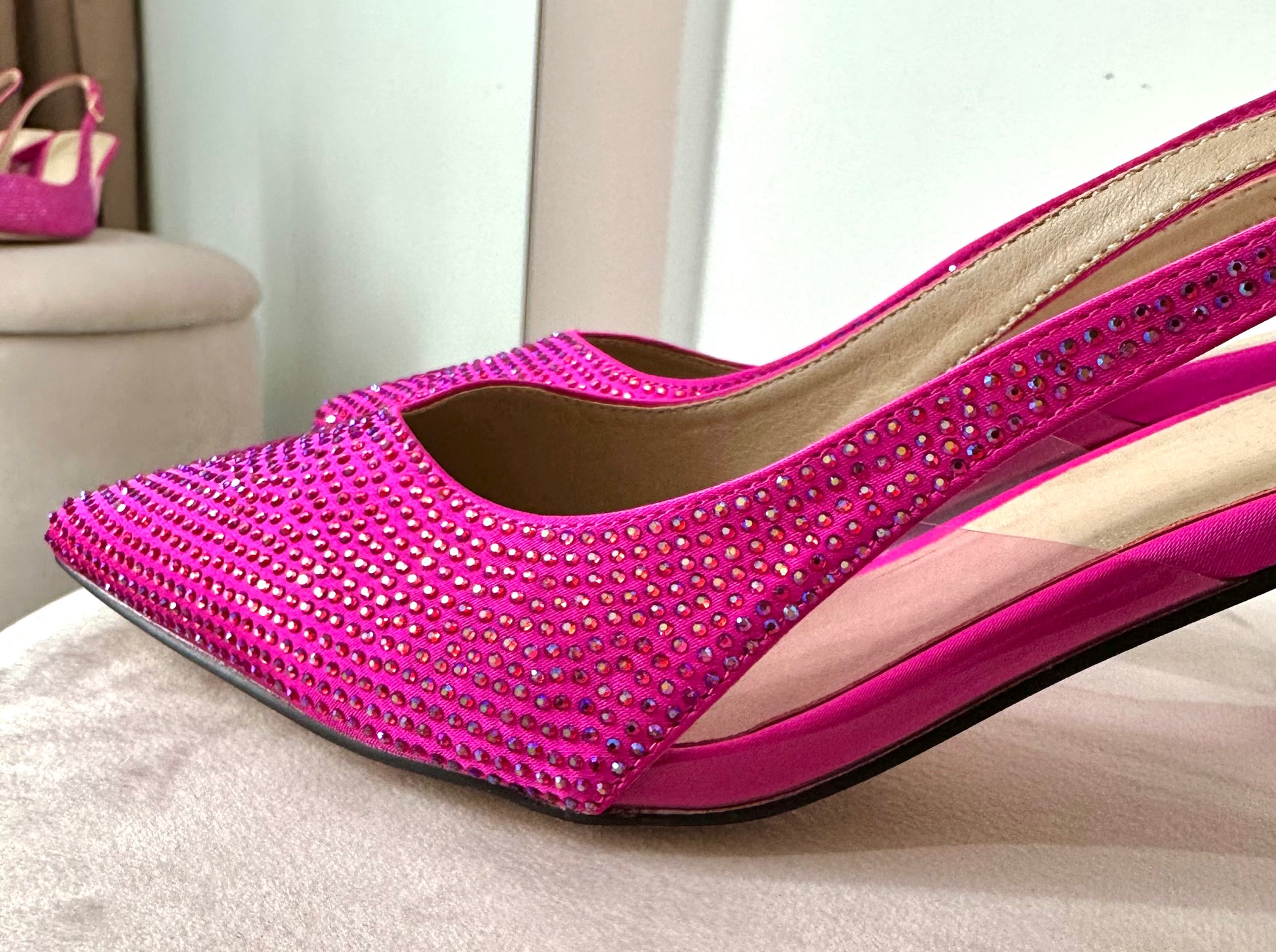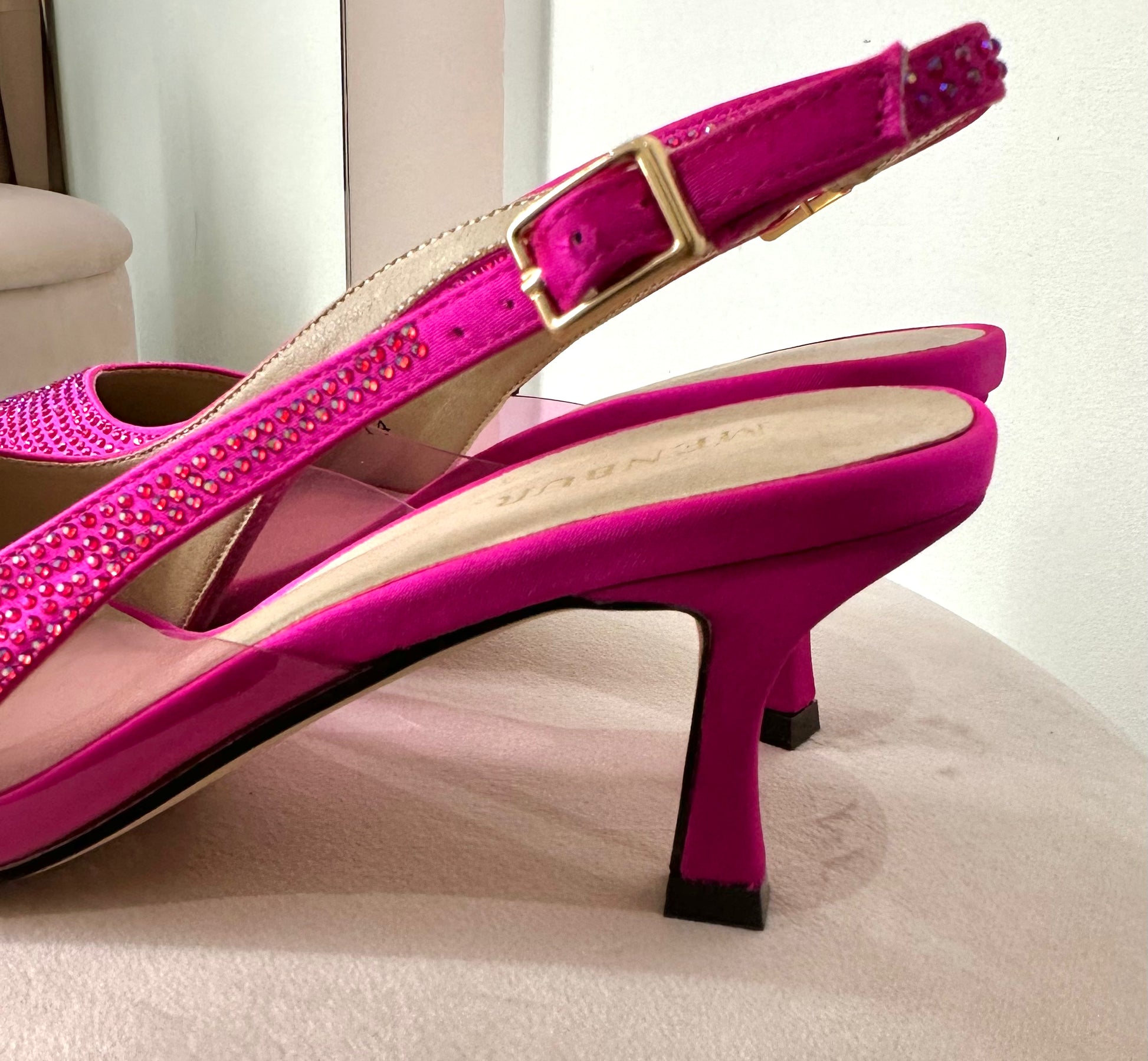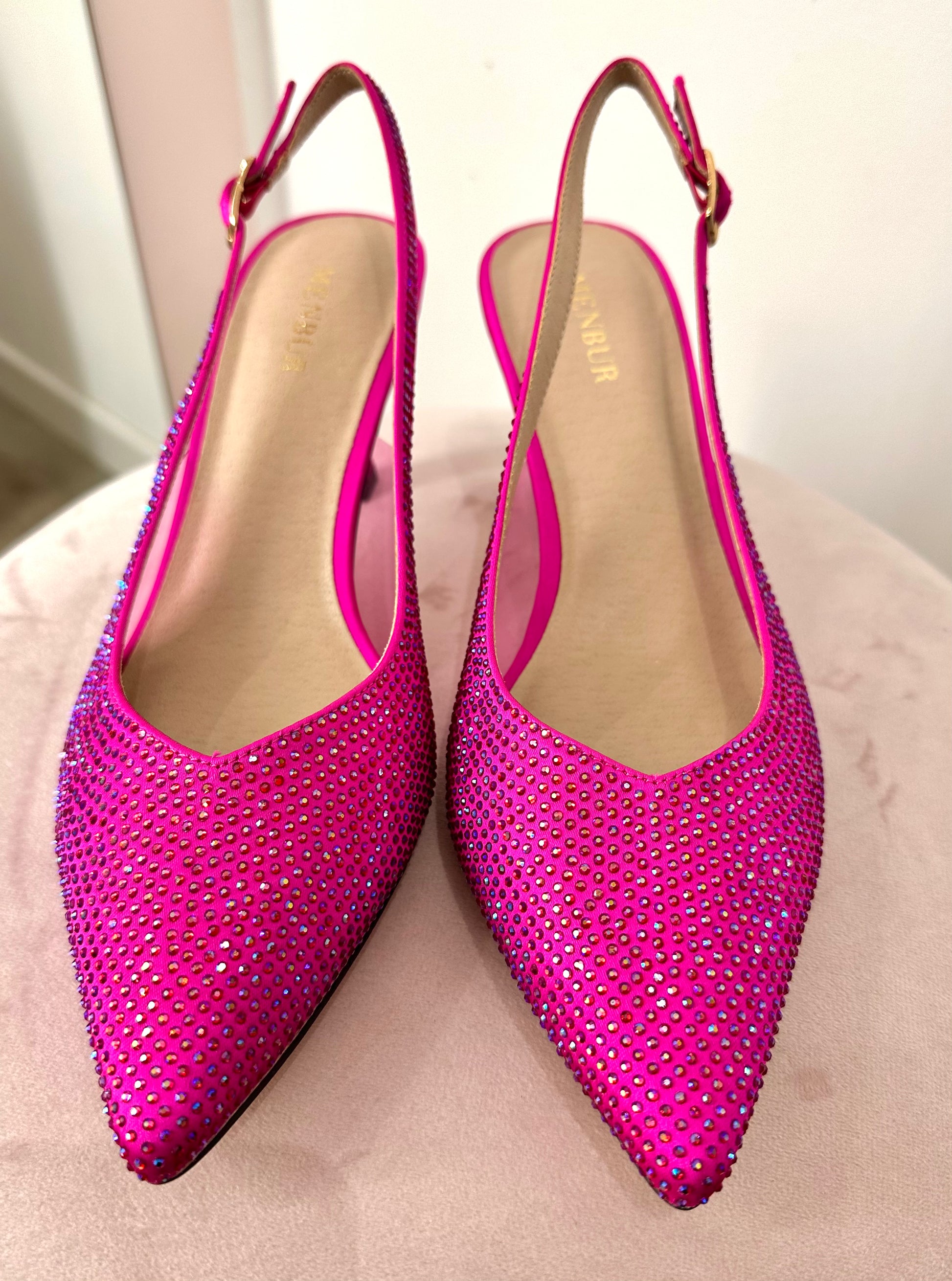 Décolleté slingback con inserti in materiale polimerico trasparente e interamente ricoperto di strass .