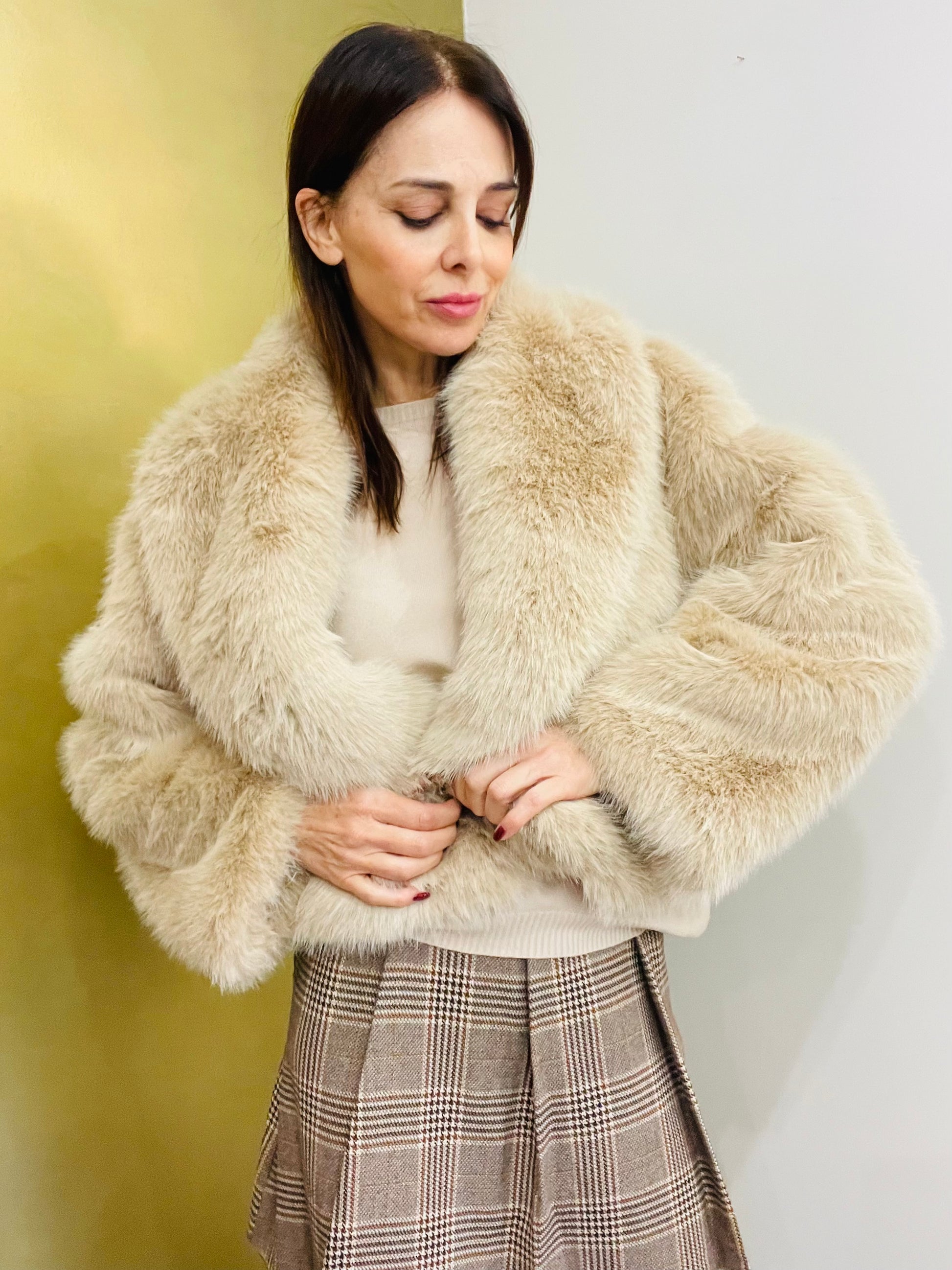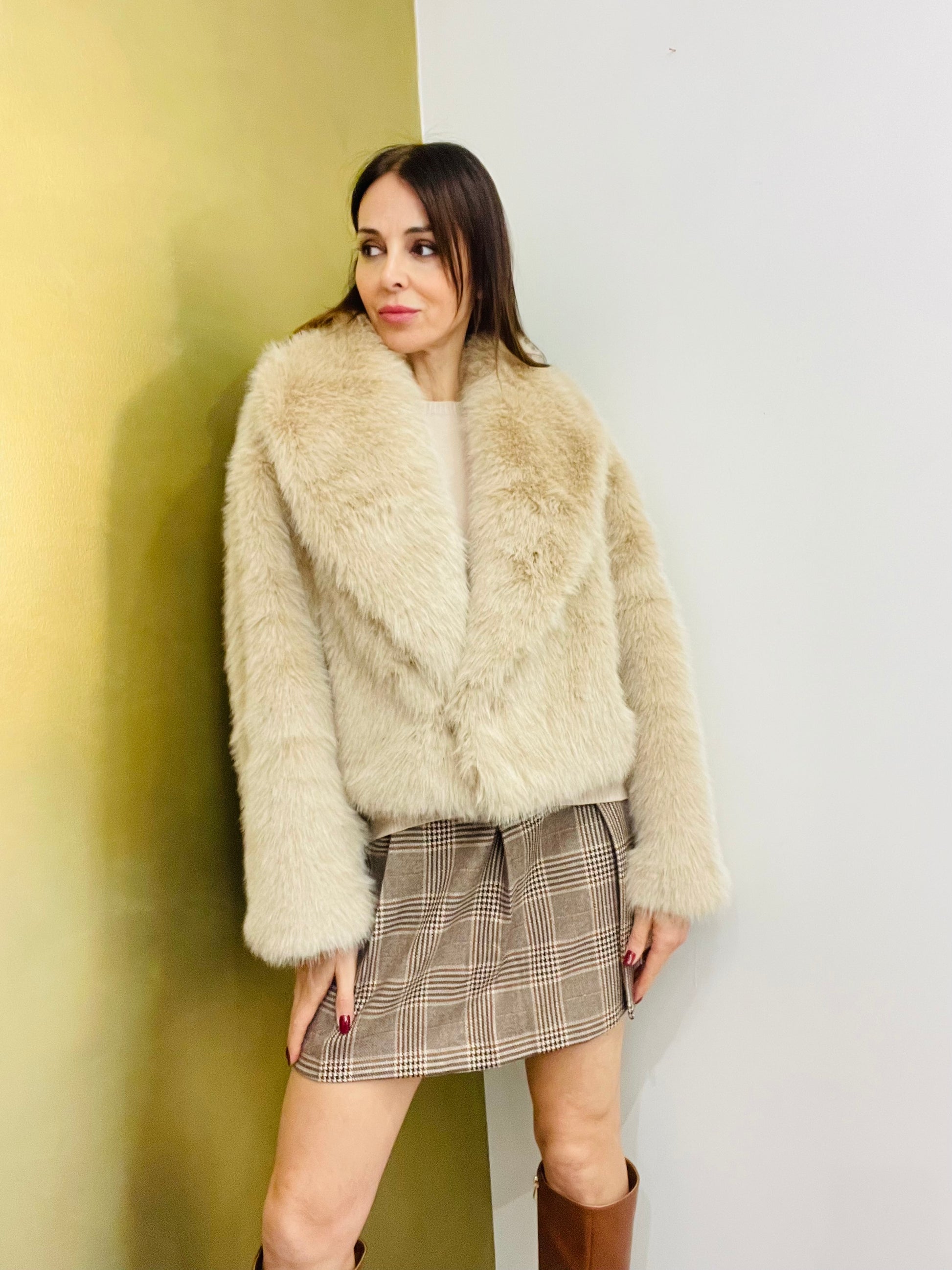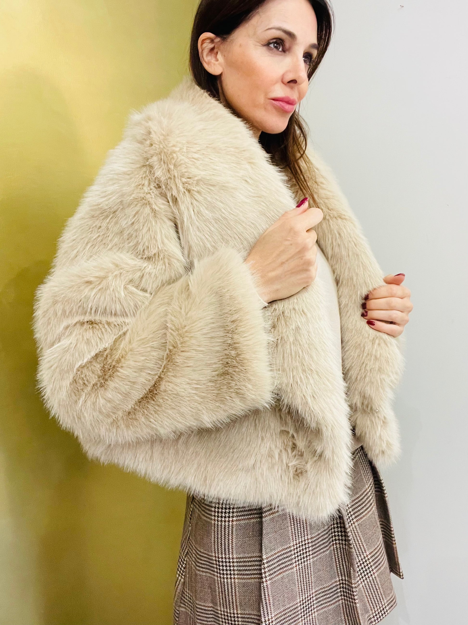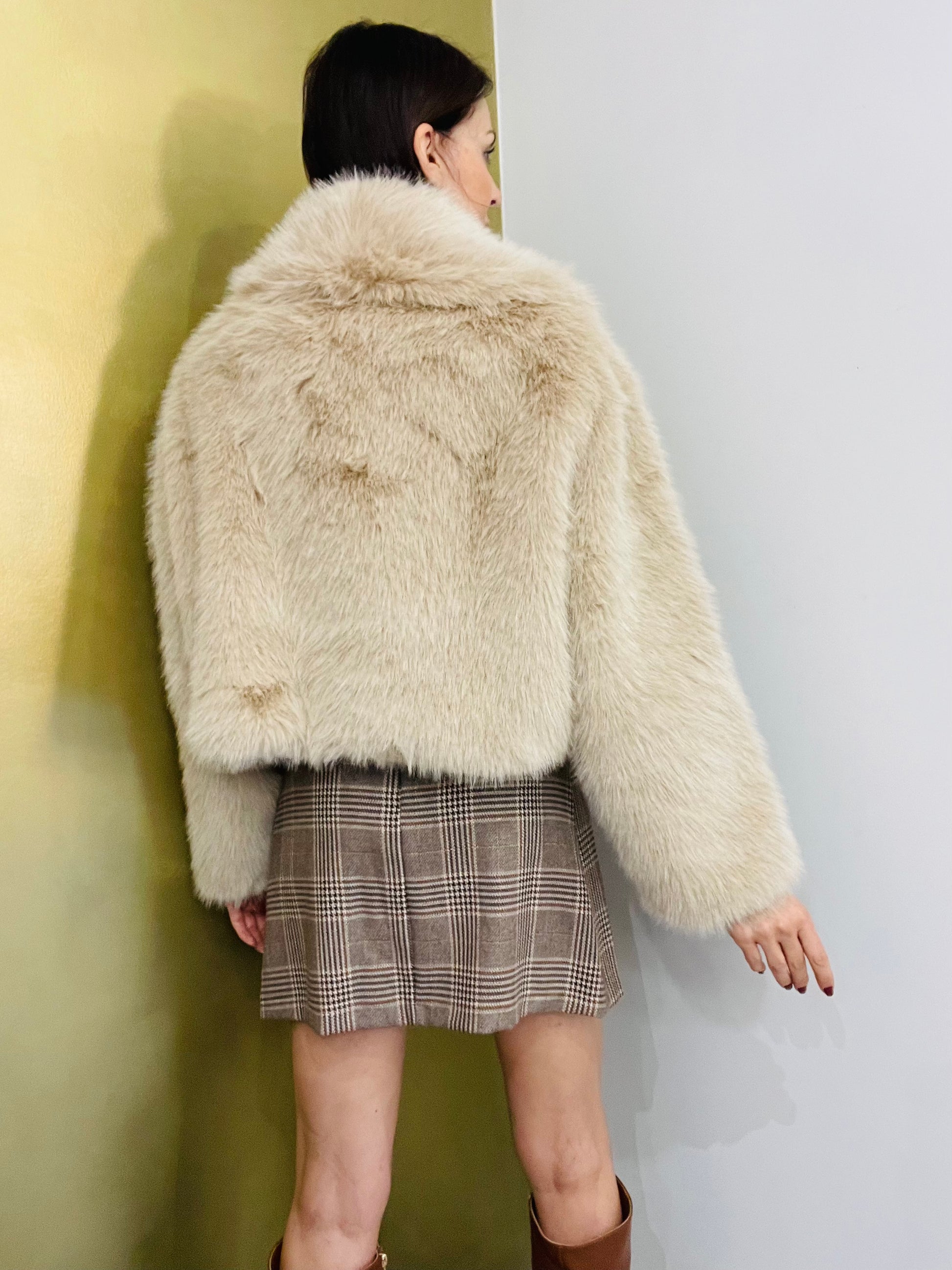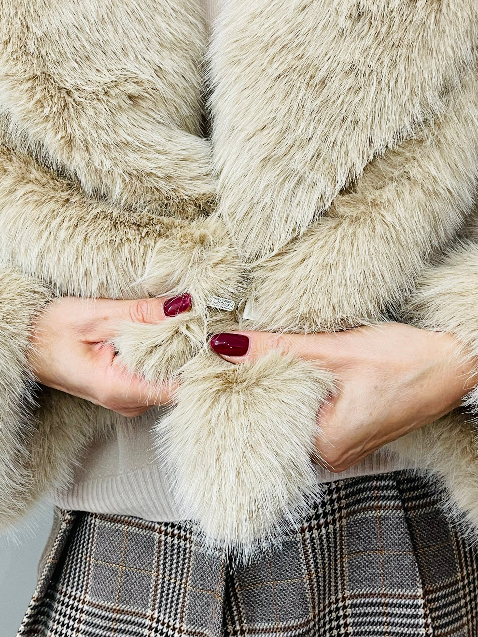 Eco pelliccia corta con tasche laterali, chiusura nascosta con un gancio per pelliccia ricoperta di strass nascosto dal montante