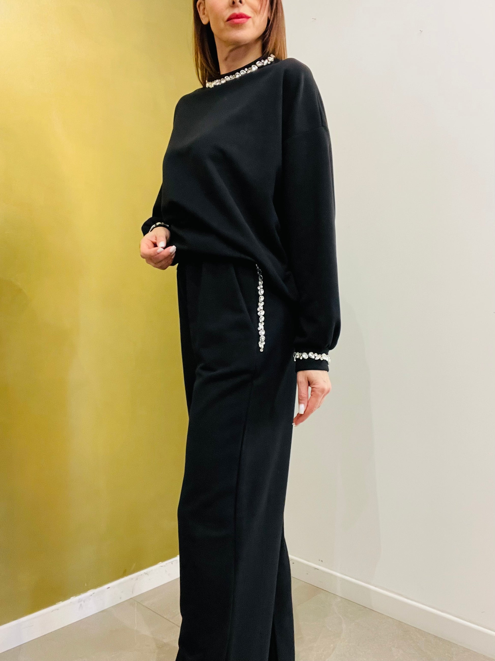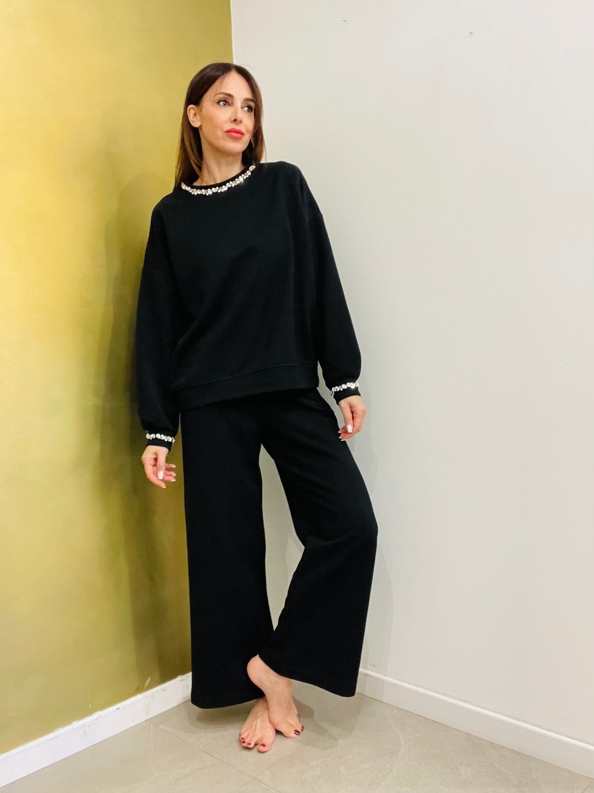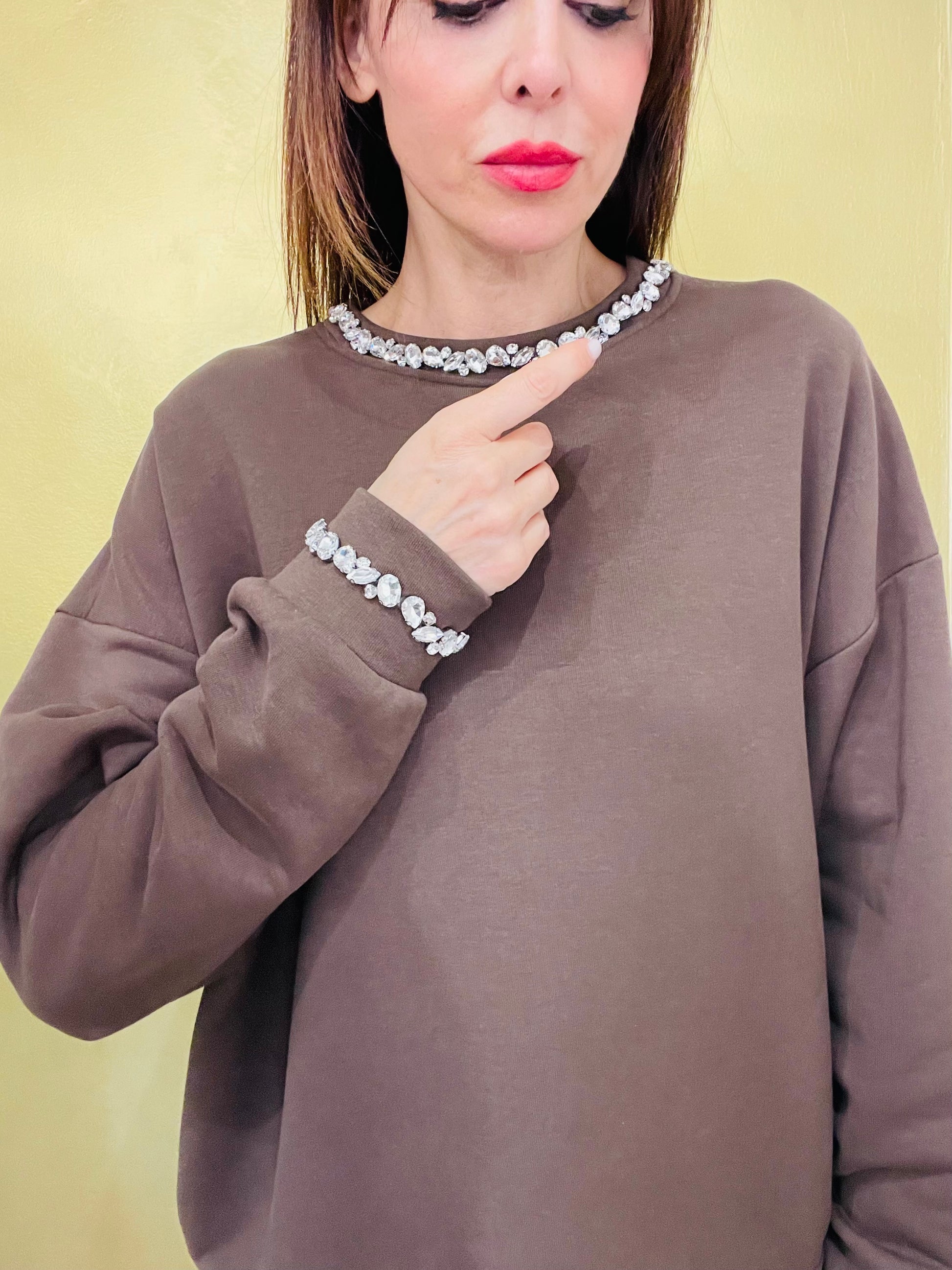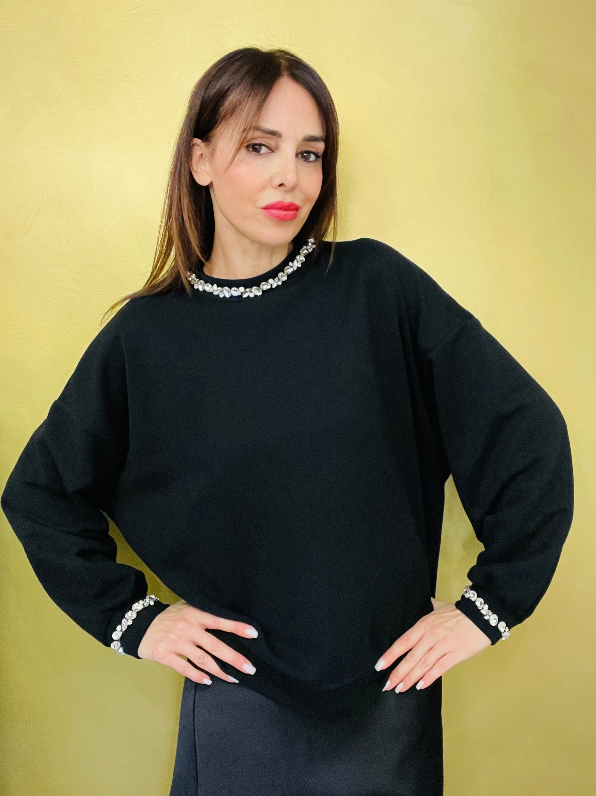 Felpa over con applicazione di strass sul girocollo e sul fine manica, taglio raglan sulla spalla