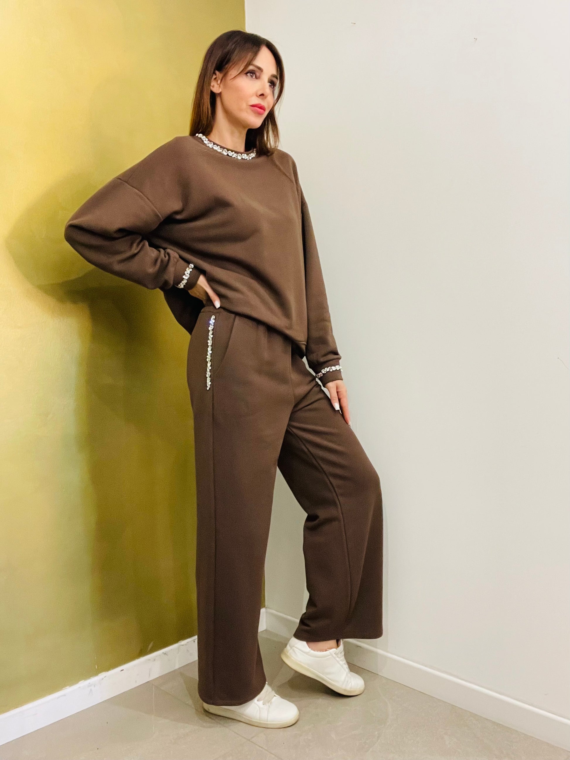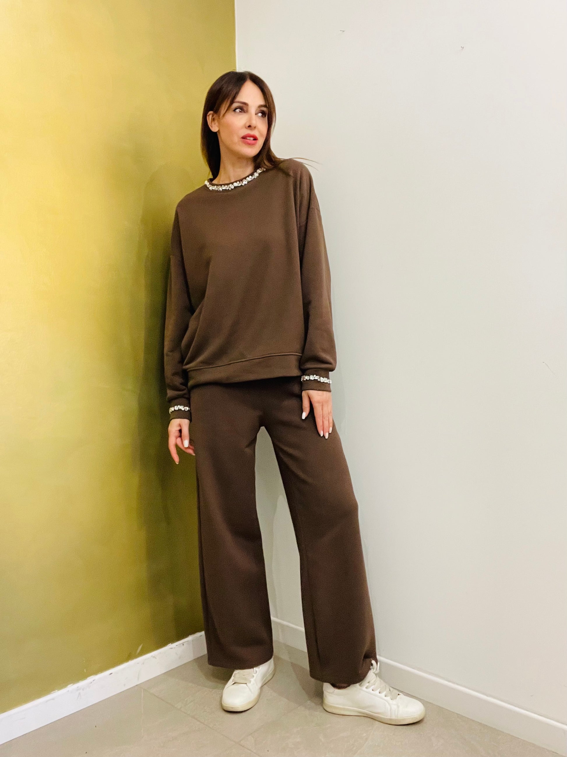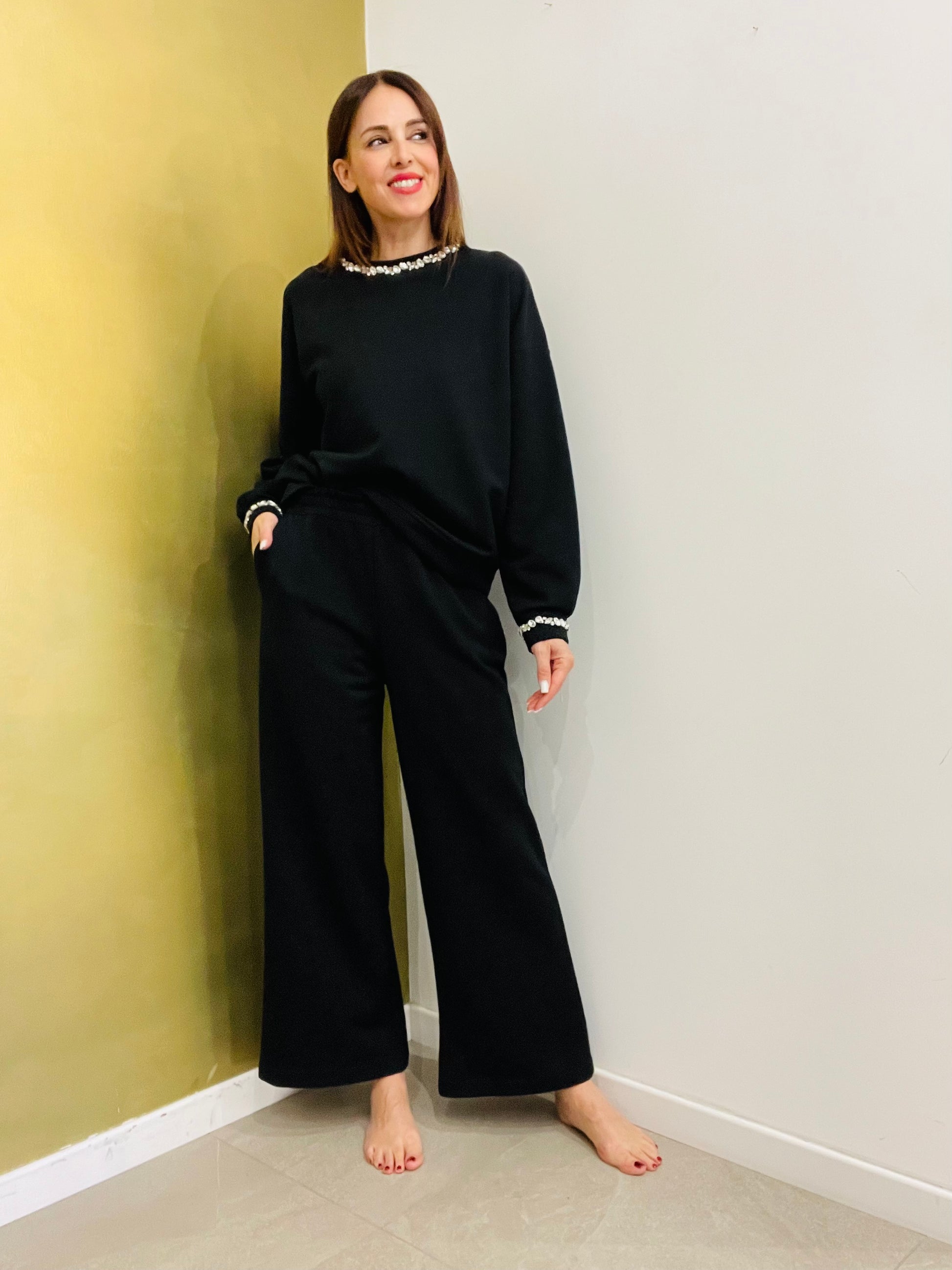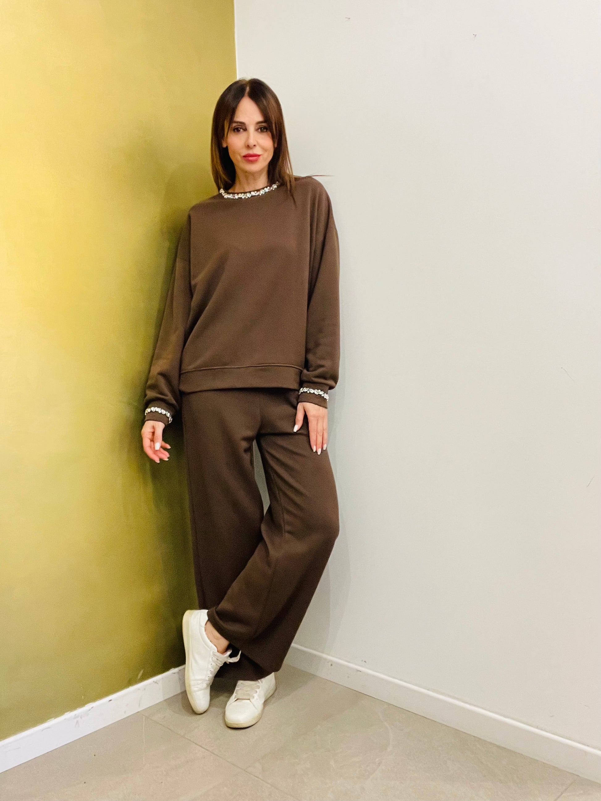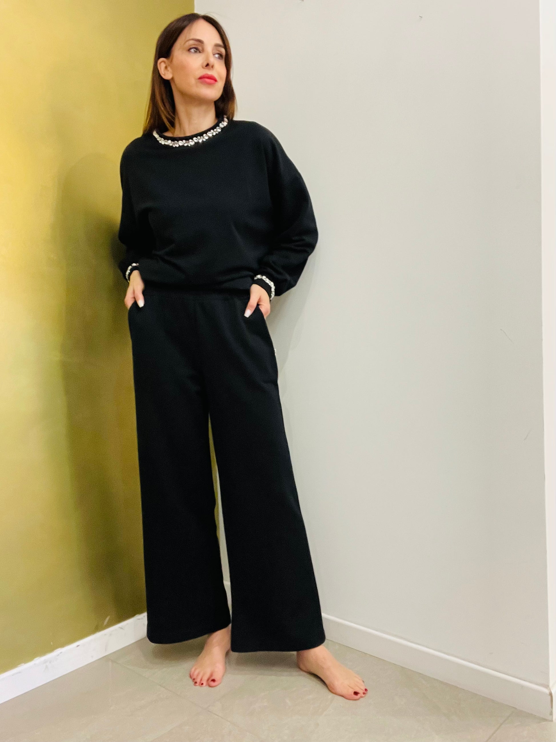 Felpa over con applicazione di strass sul girocollo e sul fine manica, taglio raglan sulla spalla