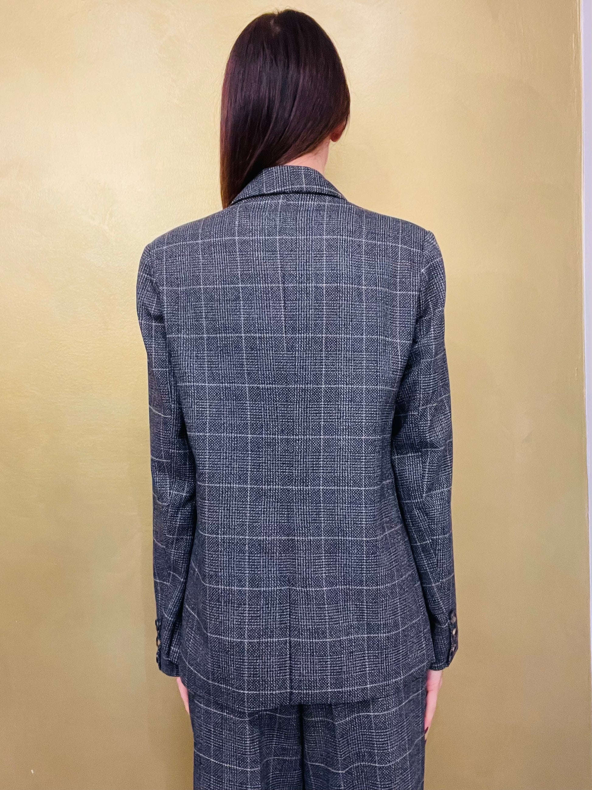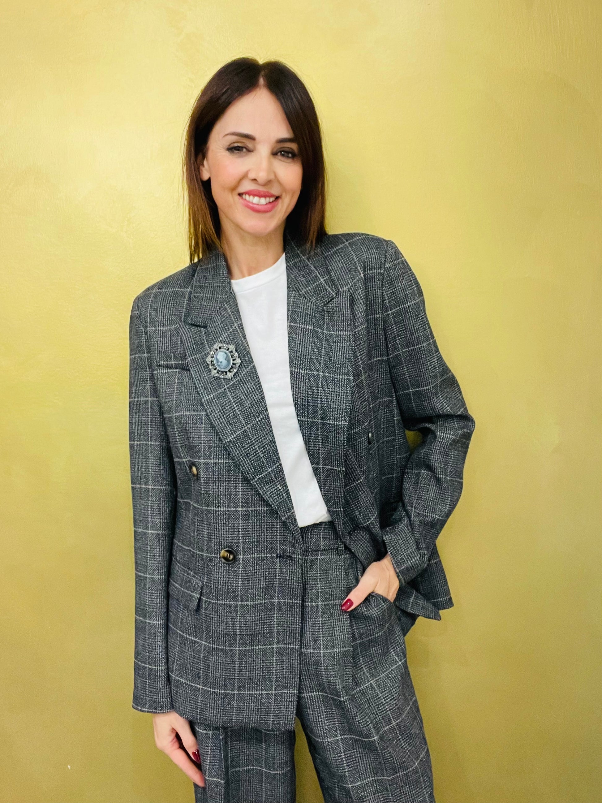 Giacca doppio petto in fantasia check con collo a Lancia, tasche con pattine e spilla applicata sul rever della giacca, vestibilità morbida