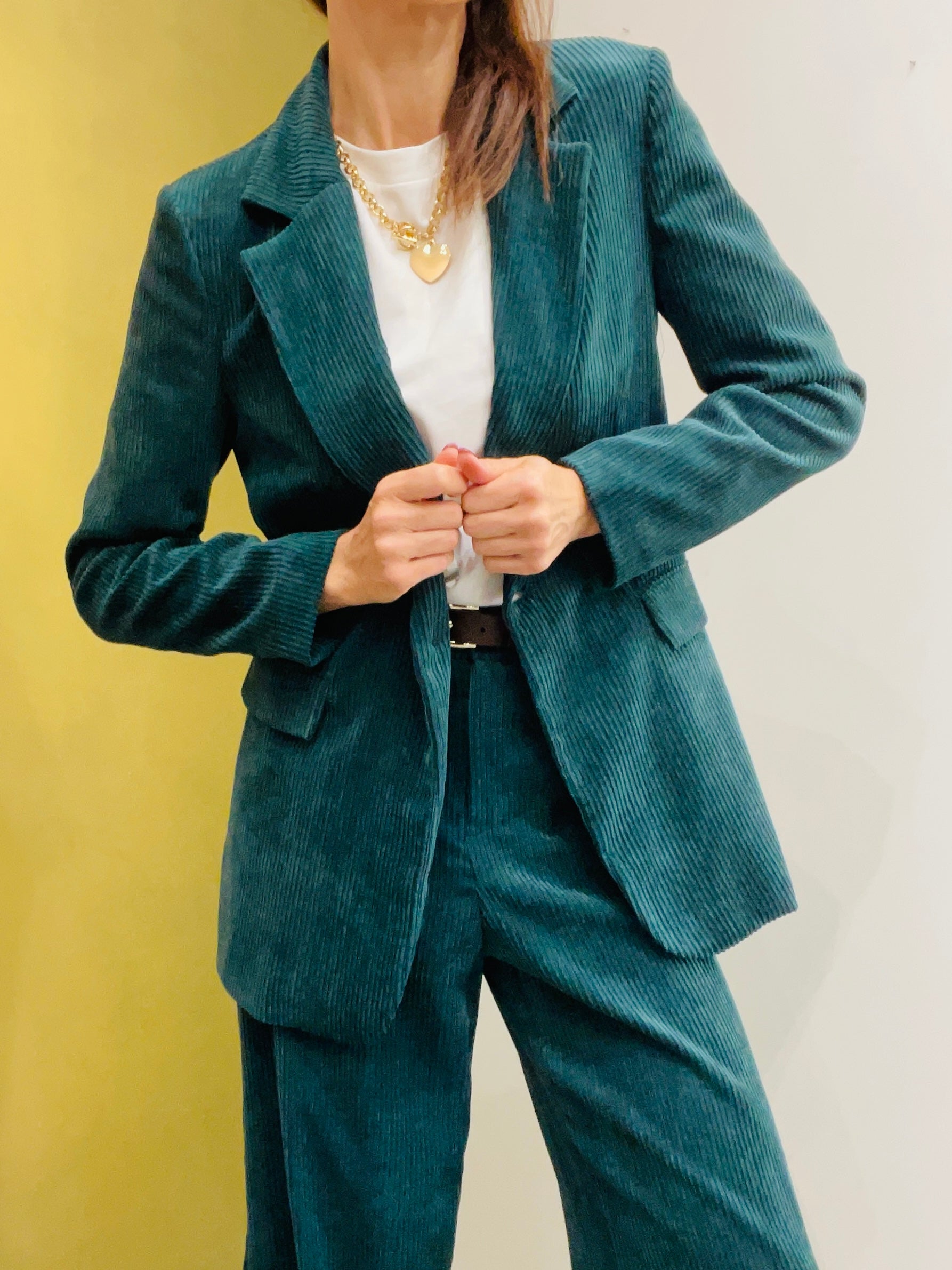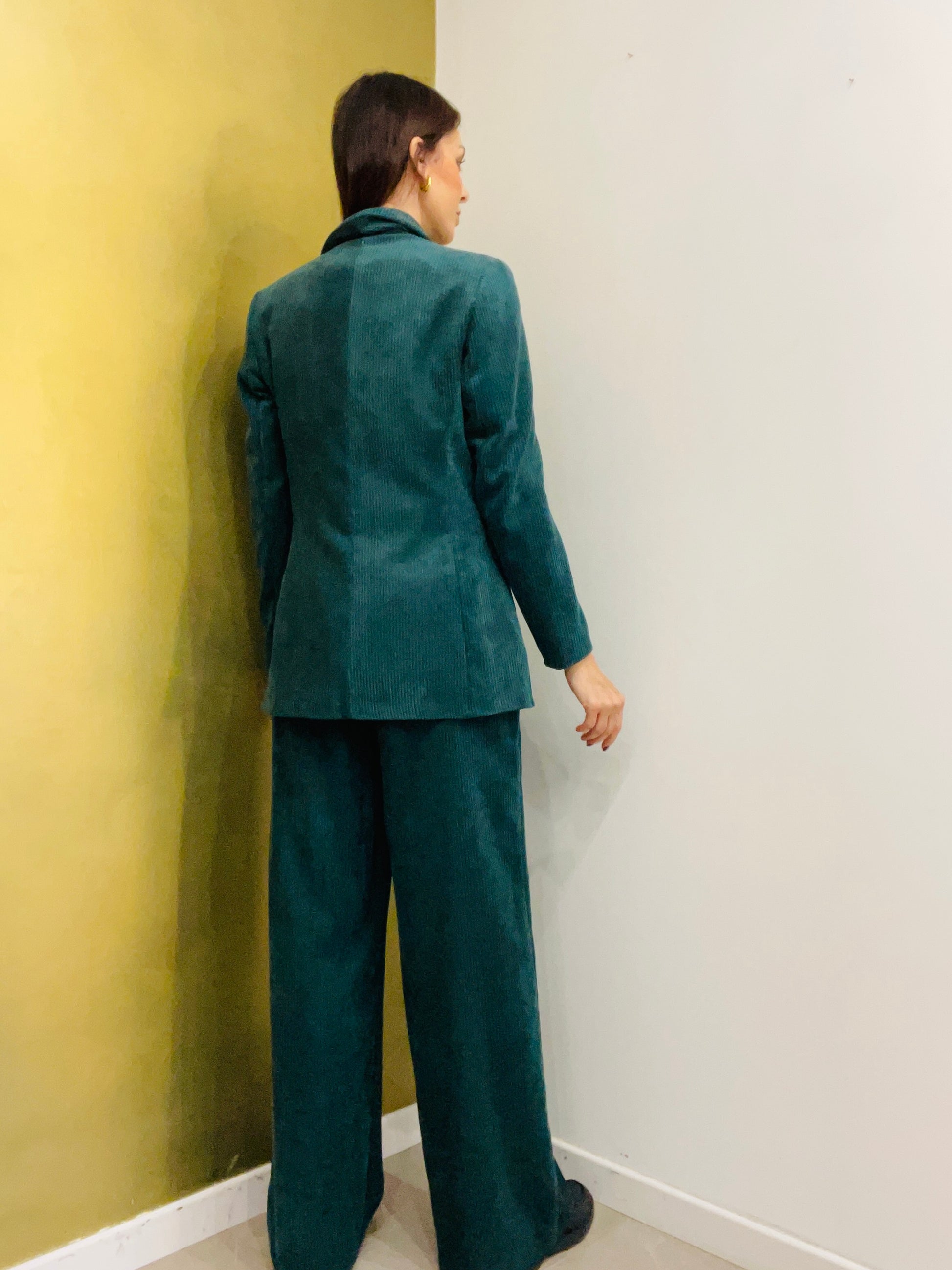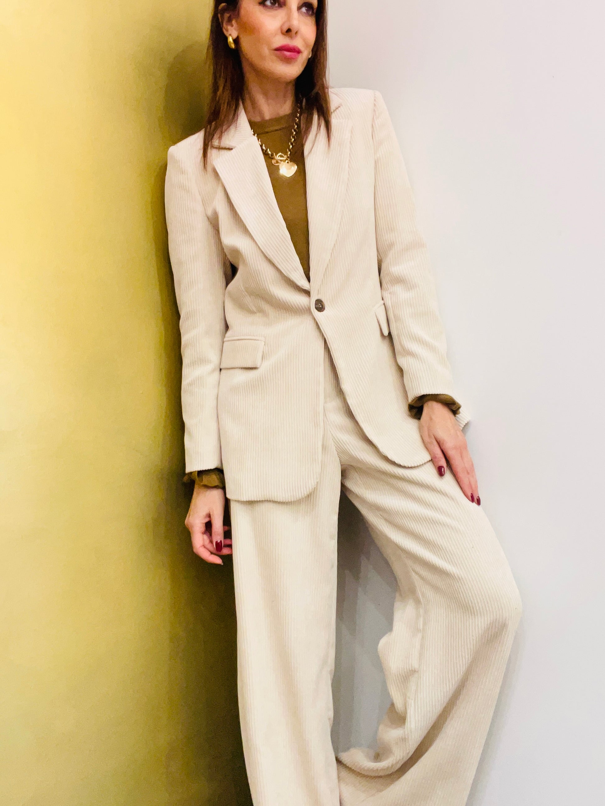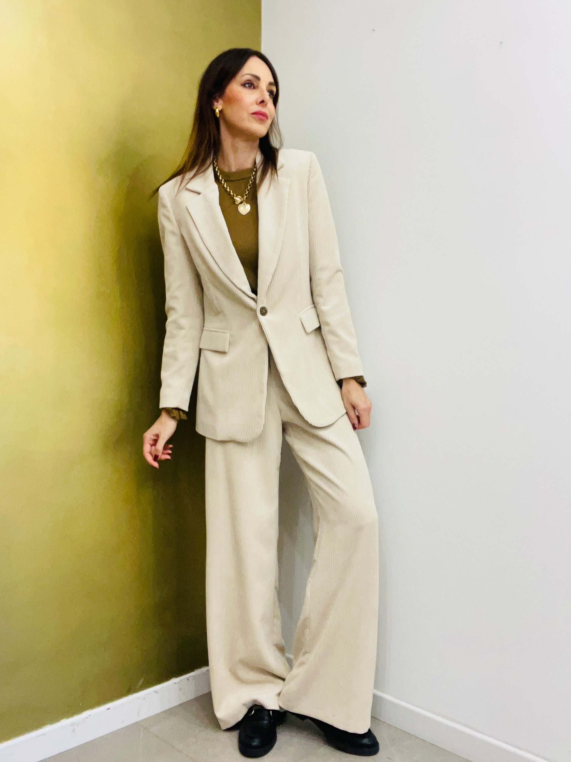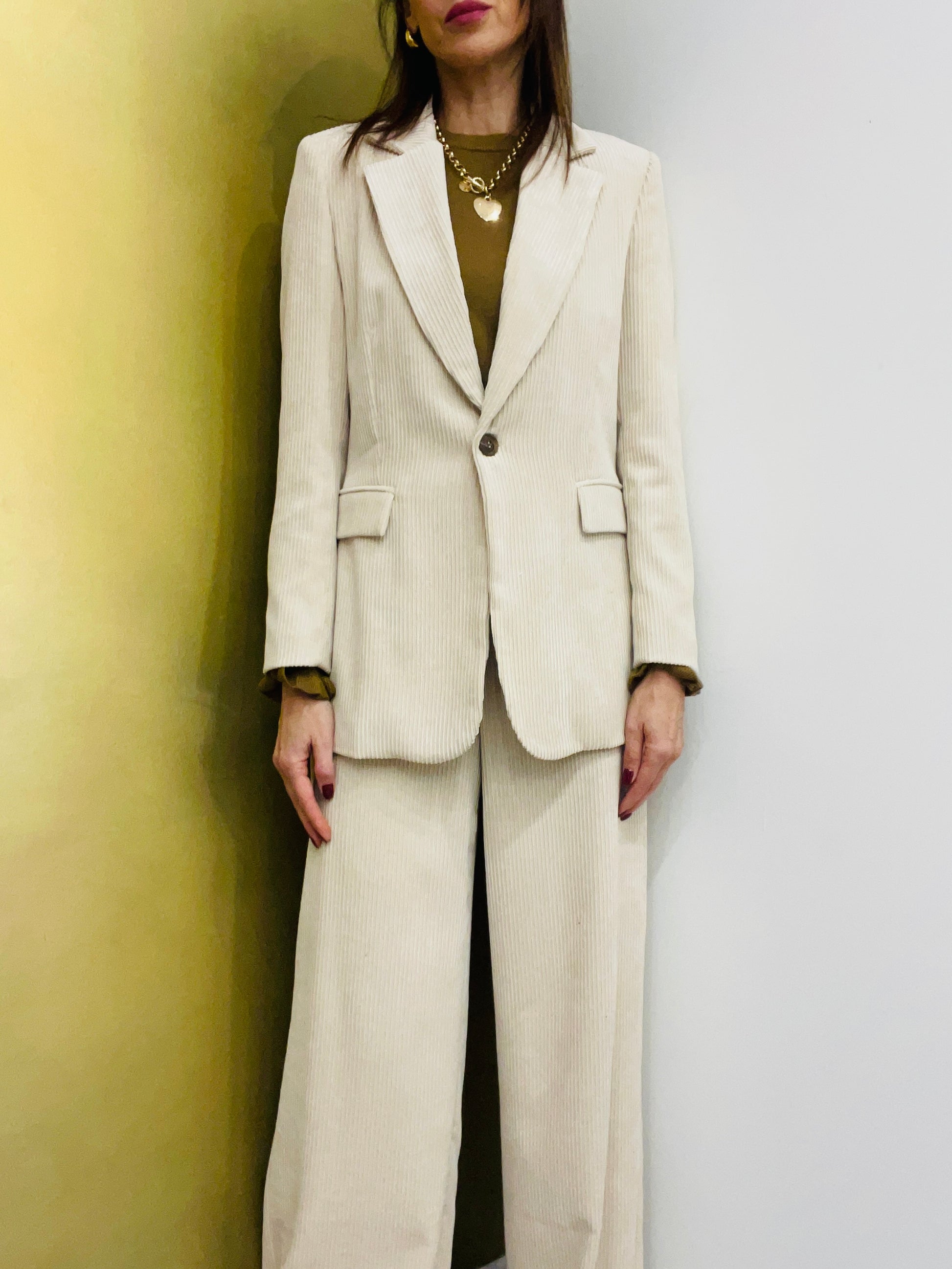 Giacca a cinquecento righe con fodera al suo interno, pattine sul davanti e chiusura a bottone