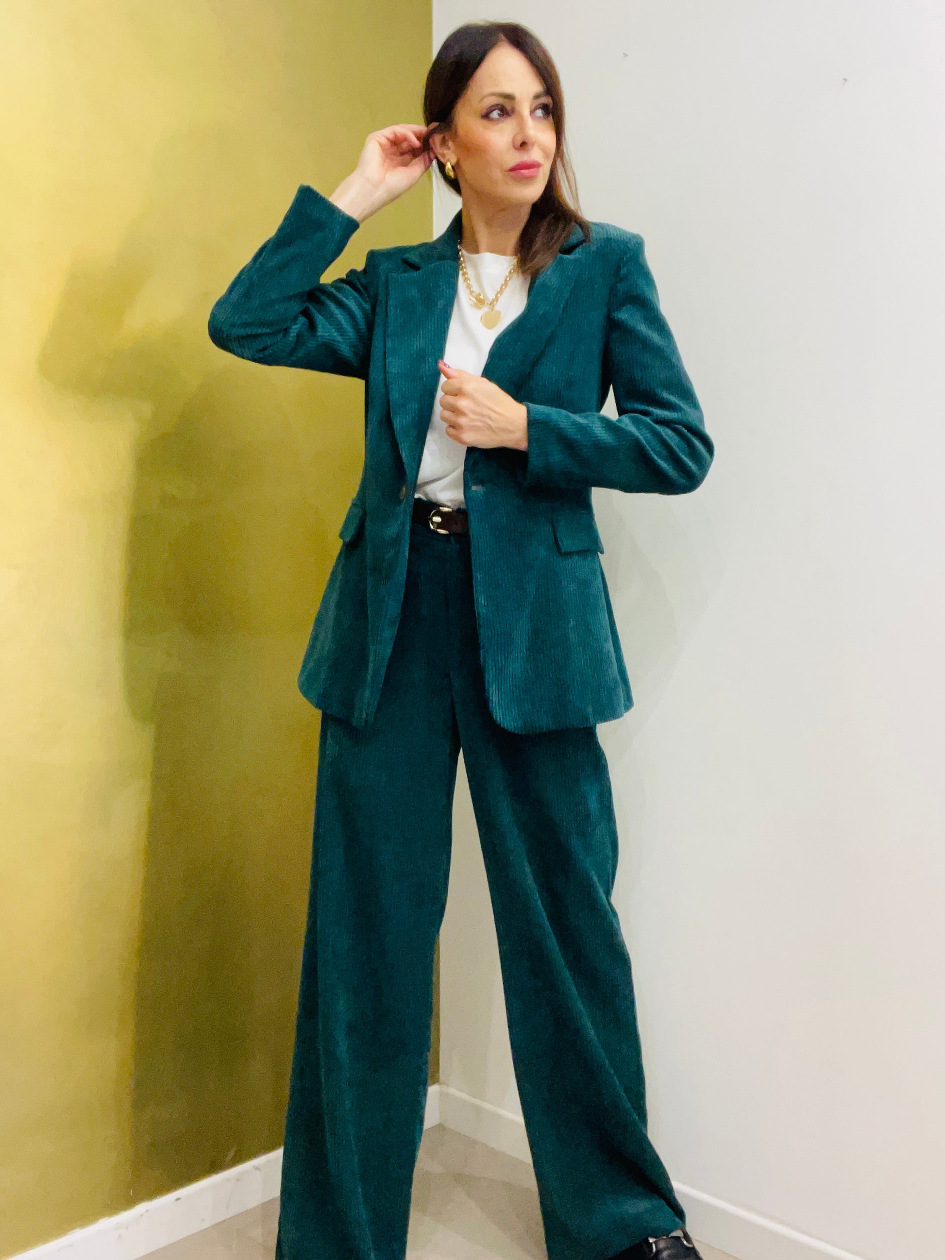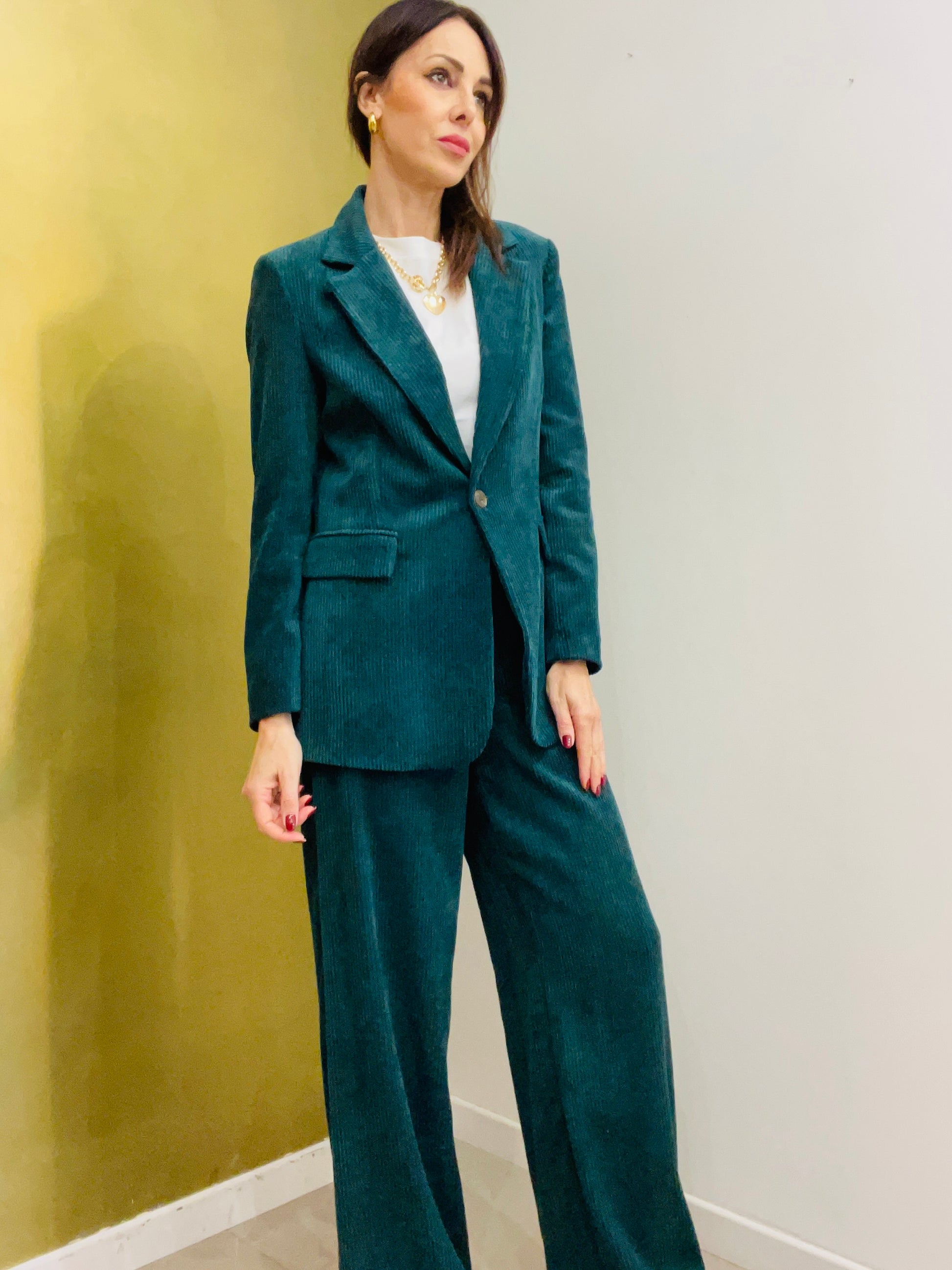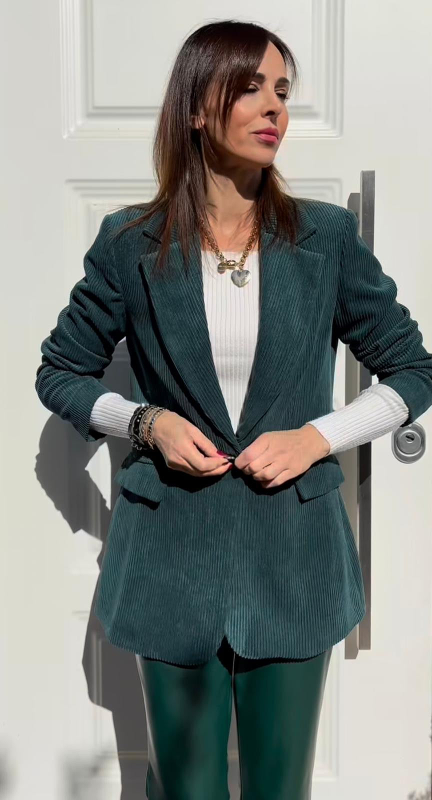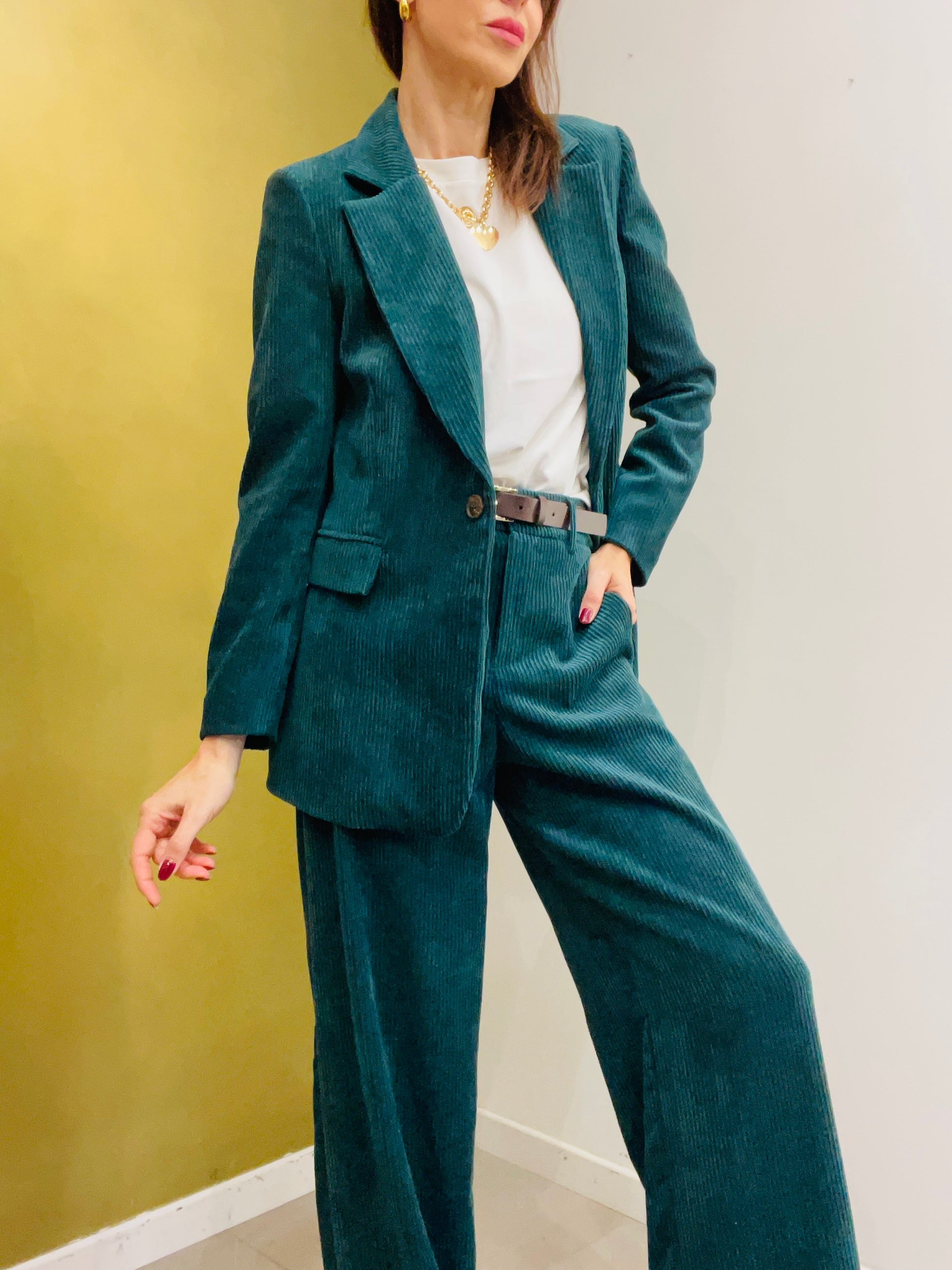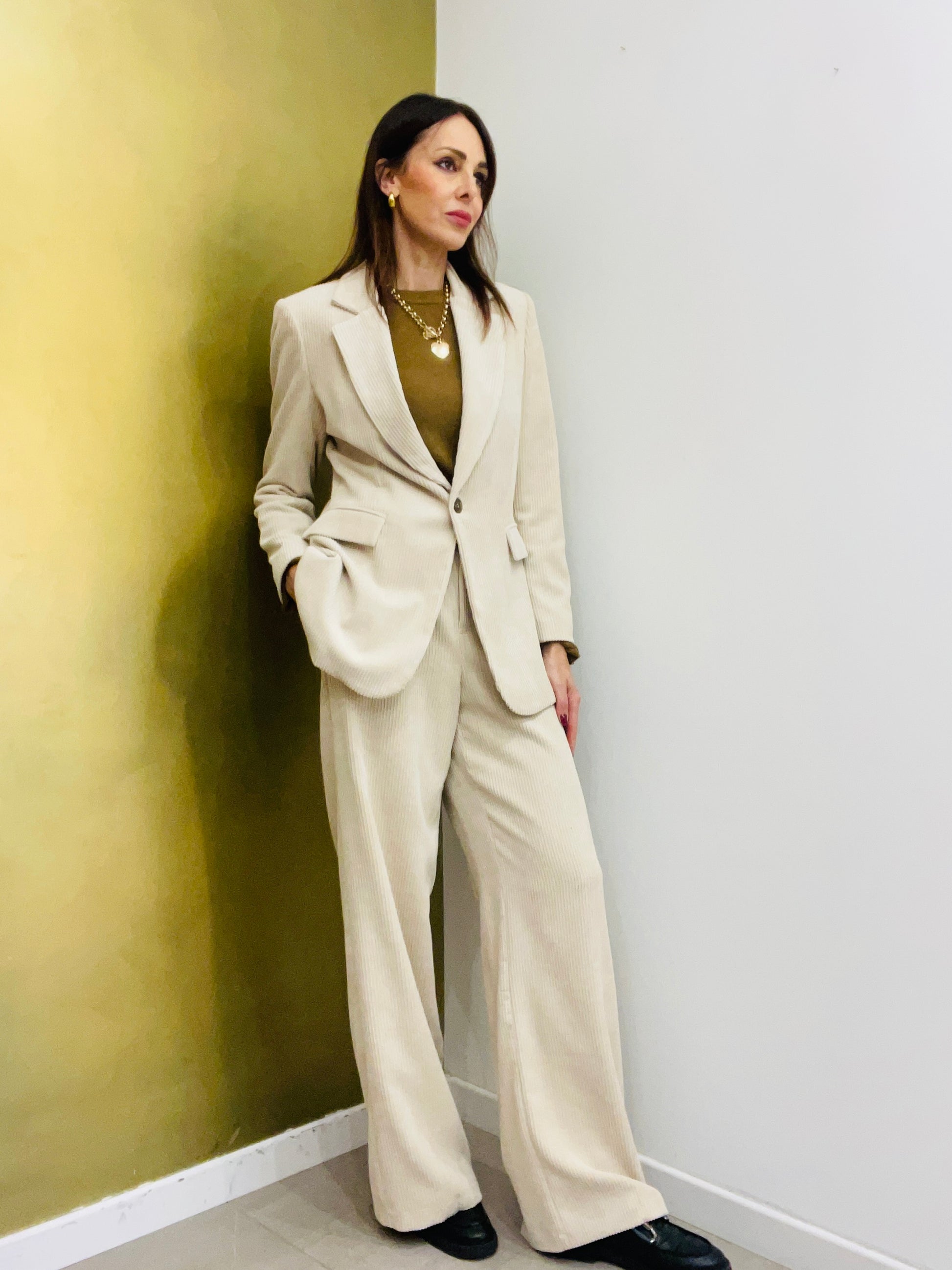 Giacca a cinquecento righe con fodera al suo interno, pattine sul davanti e chiusura a bottone