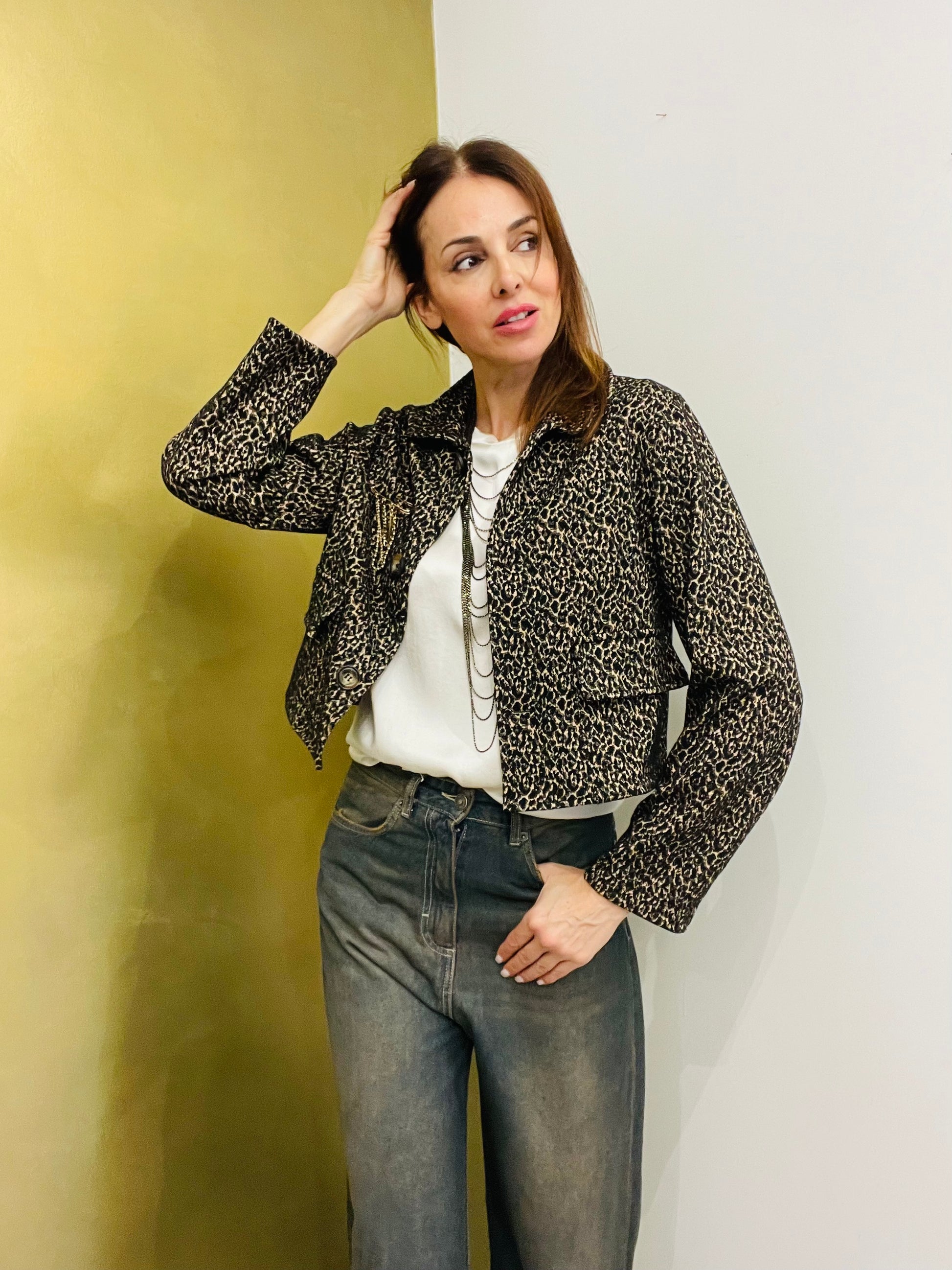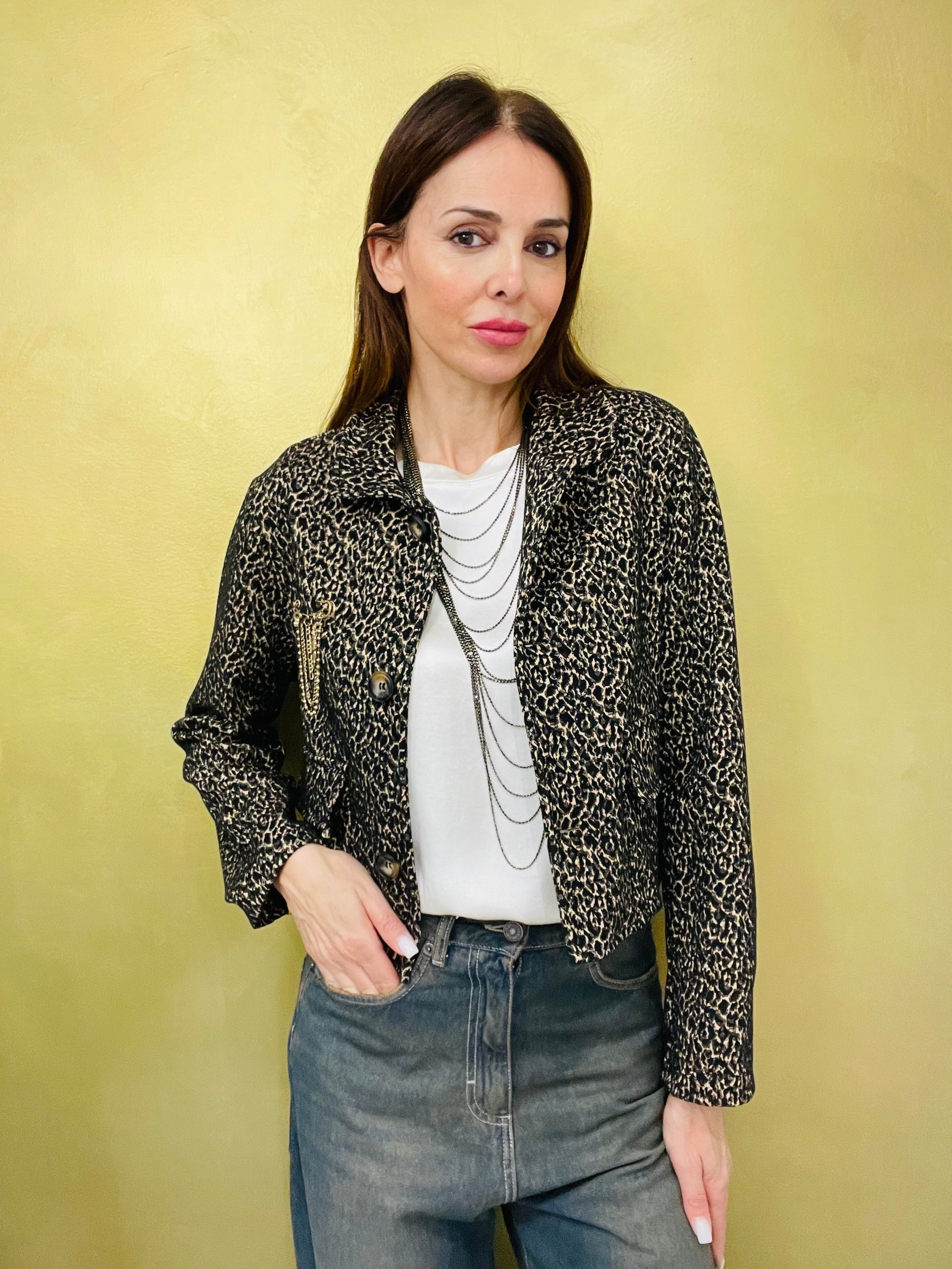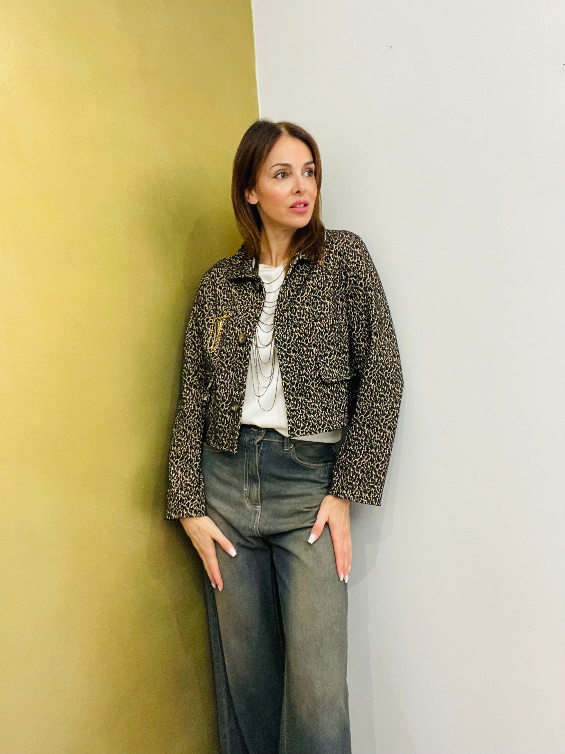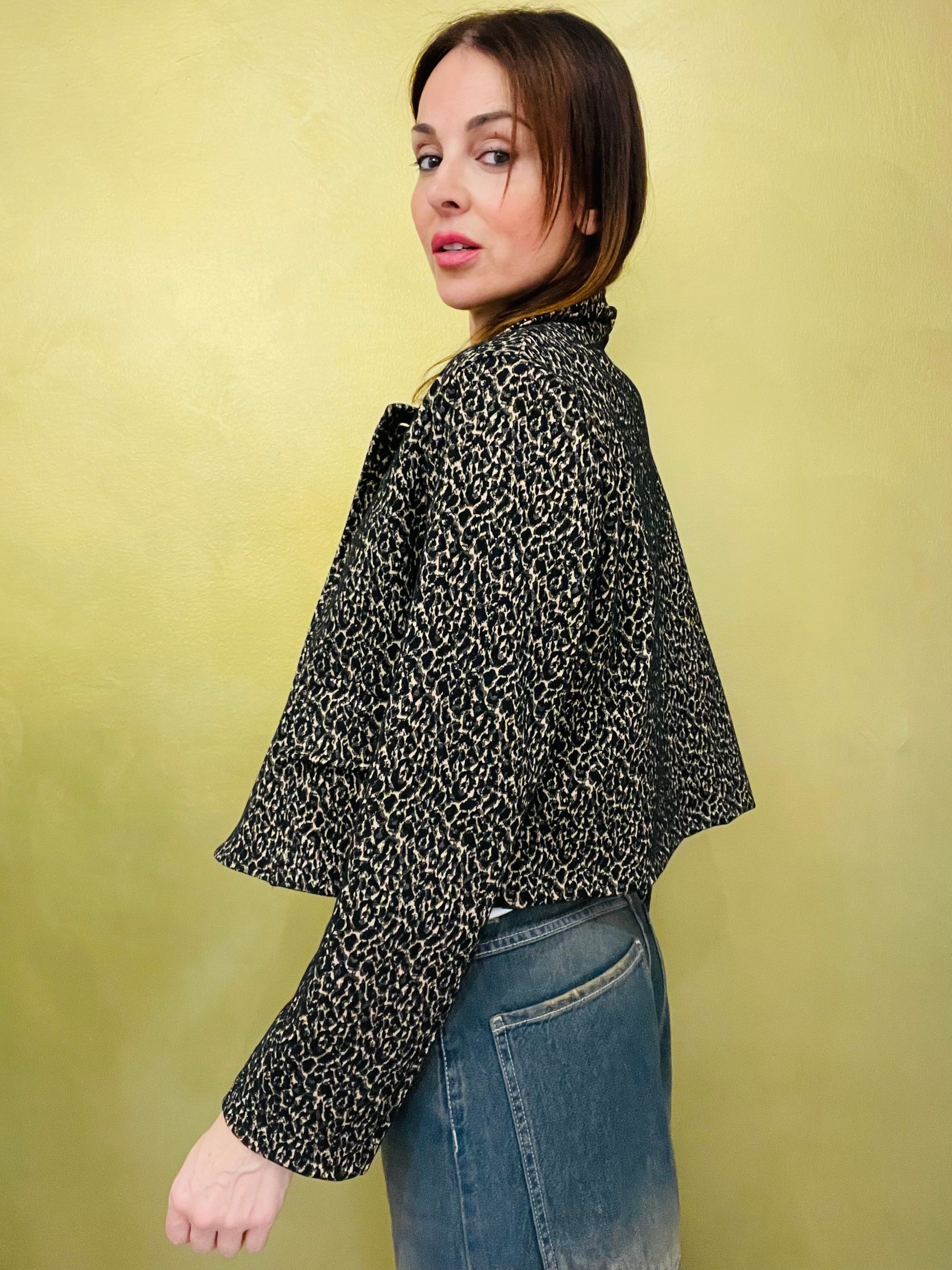 Giacca corta maculata con tasche sul davanti e spilla rimovibile sulla parte sinistra indossata