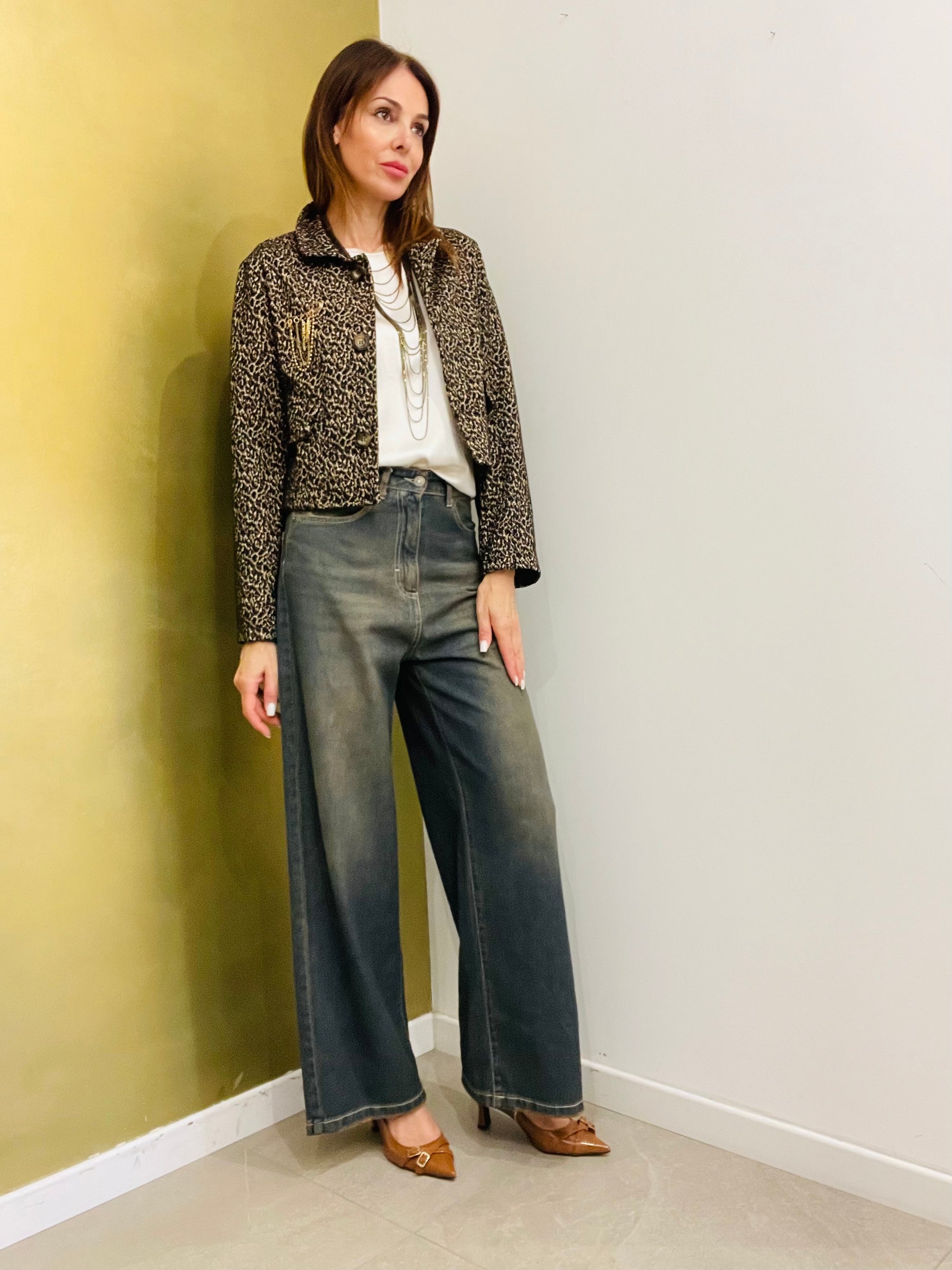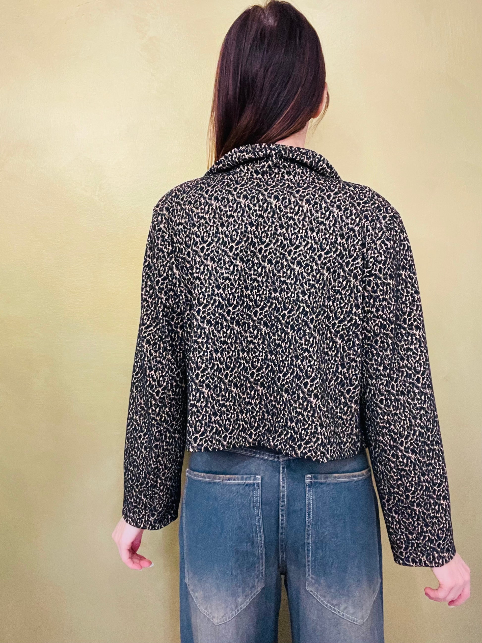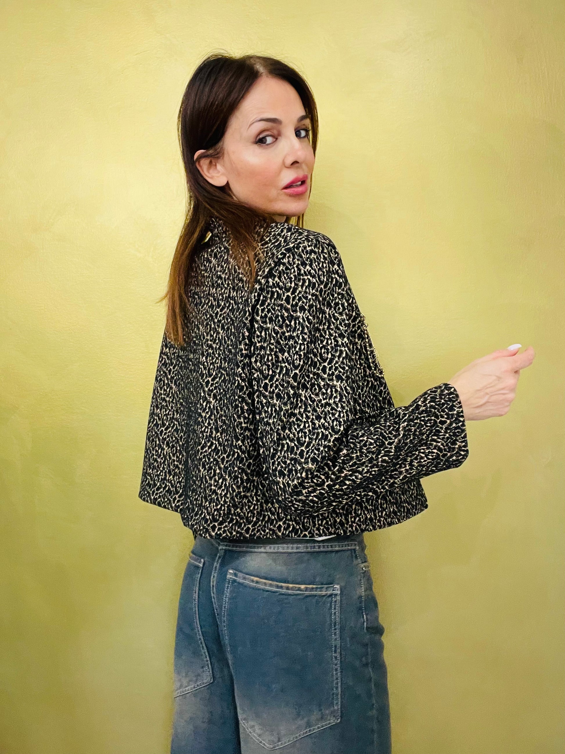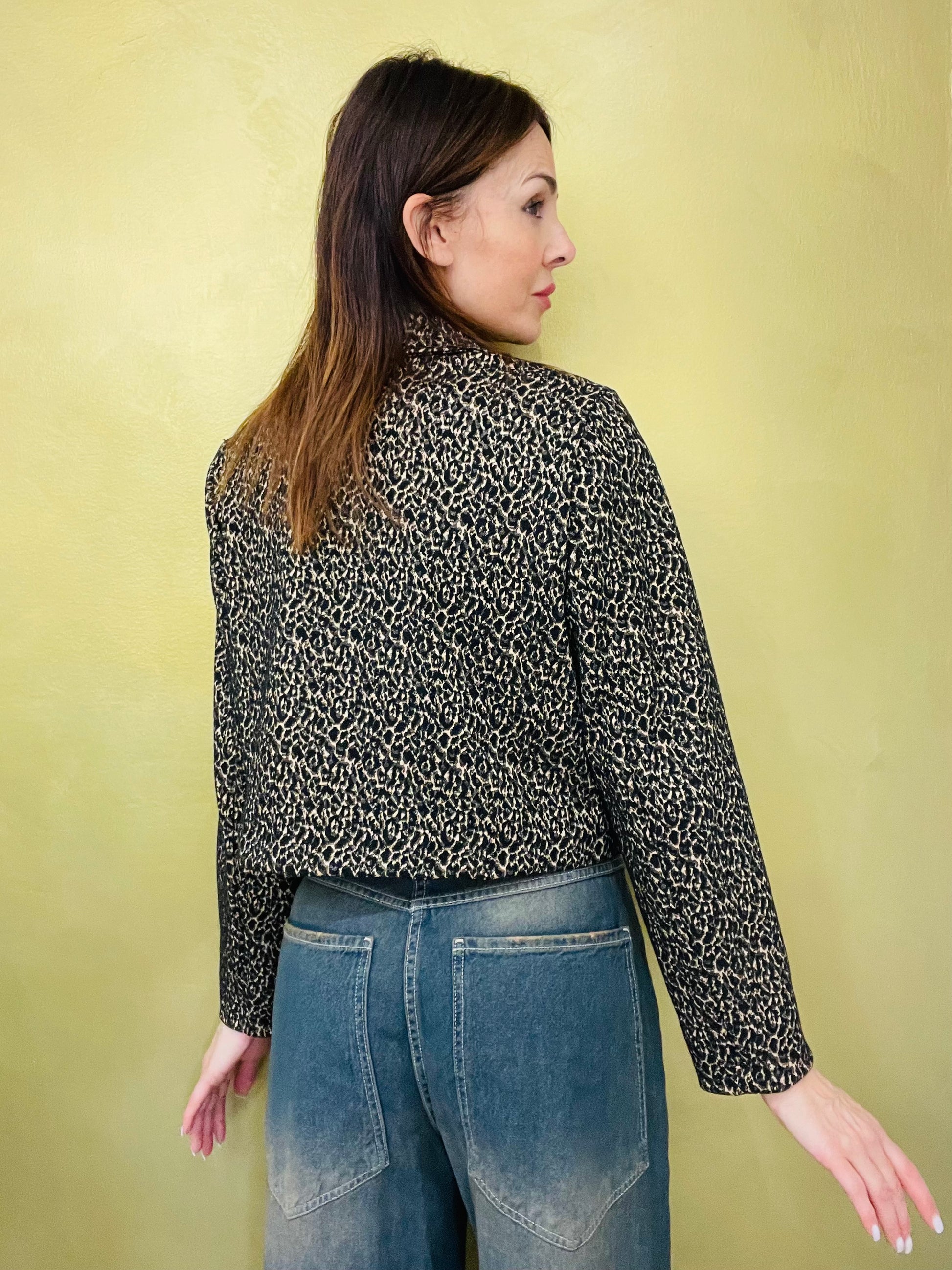 Giacca corta maculata con tasche sul davanti e spilla rimovibile sulla parte sinistra indossata