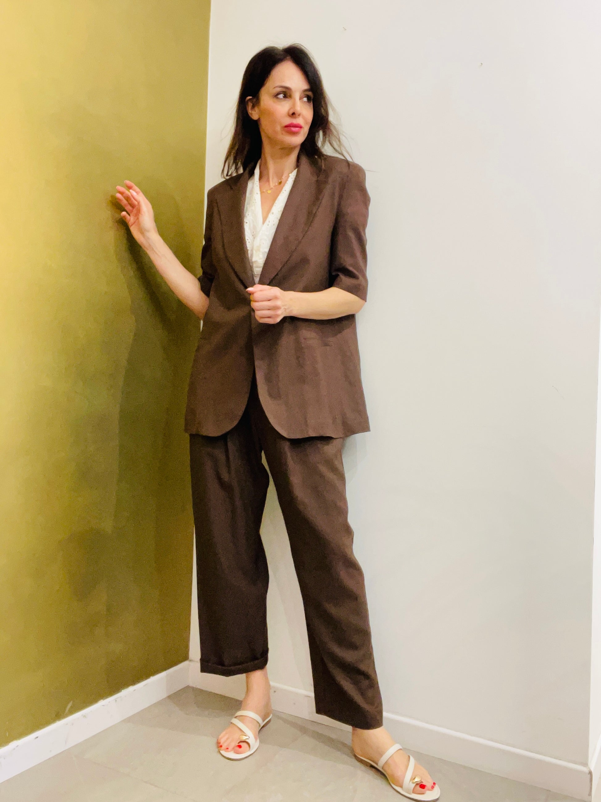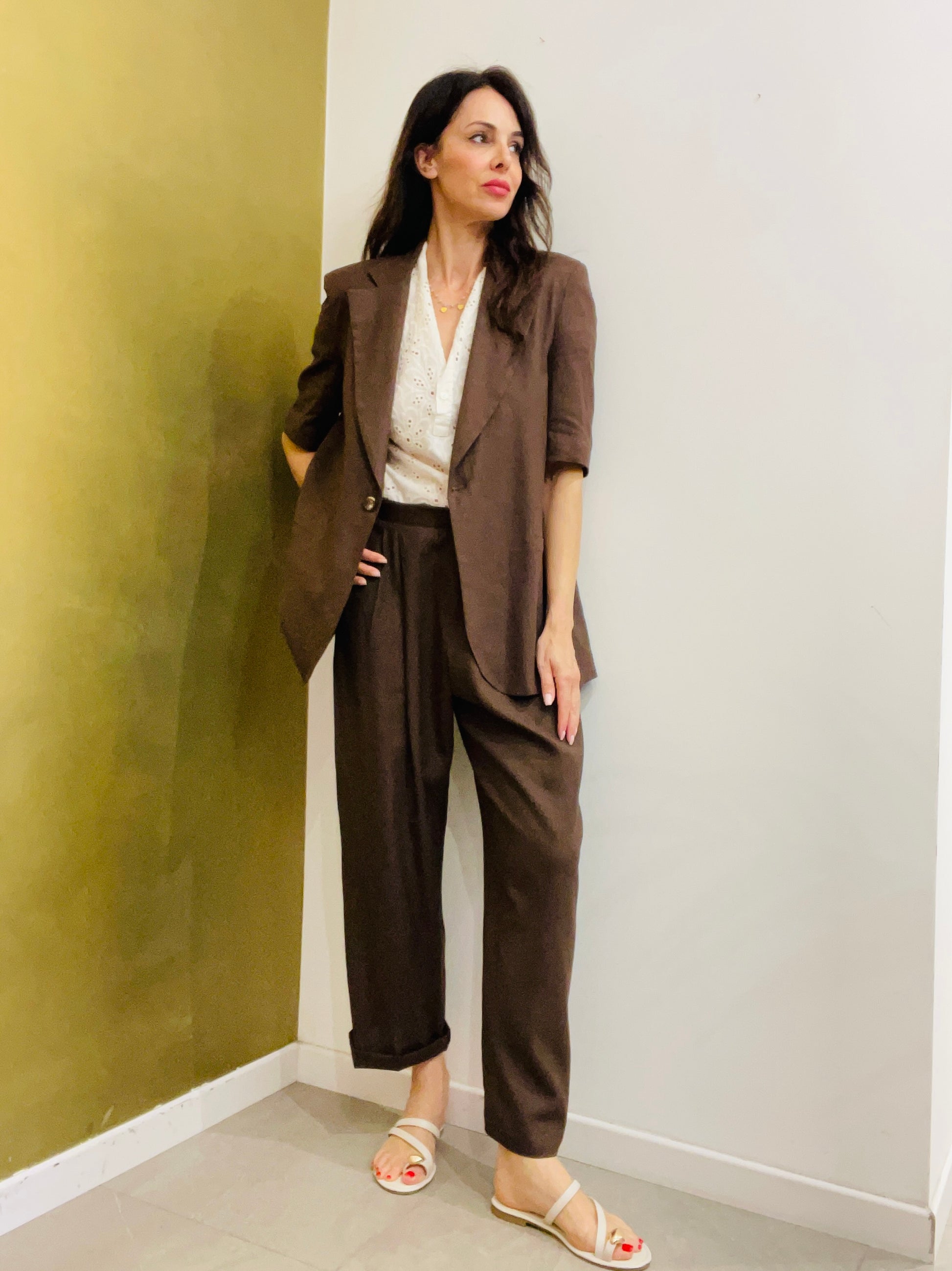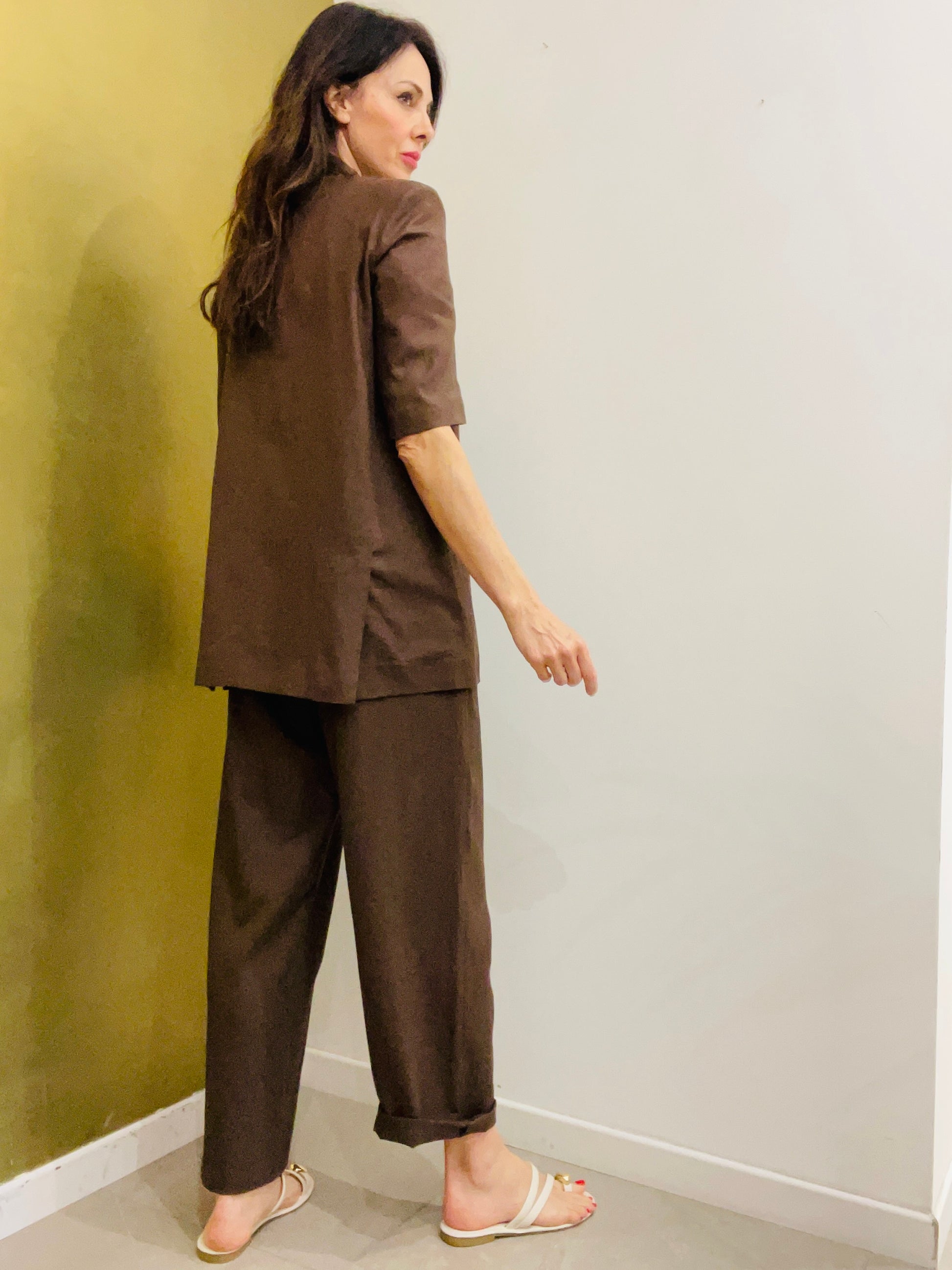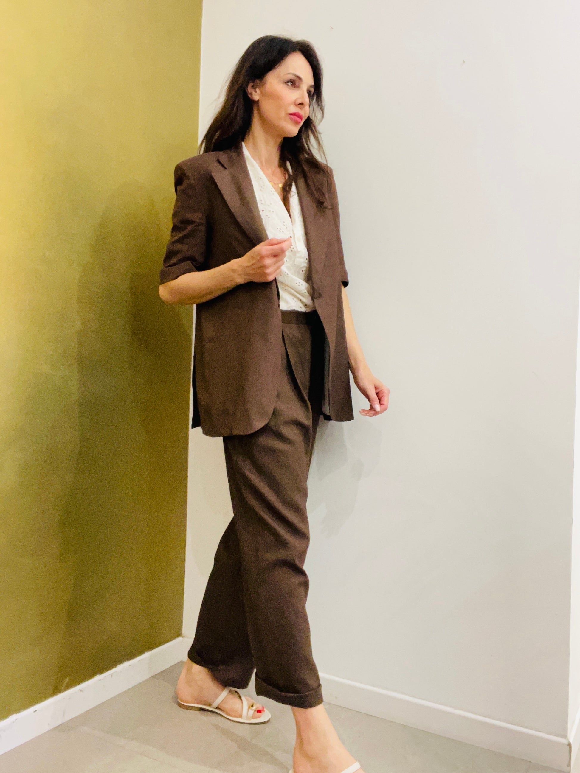 Giacca lunga in lino con manica a 3/4, tasche a filetto nella parte davanti, chiusura ad un bottone