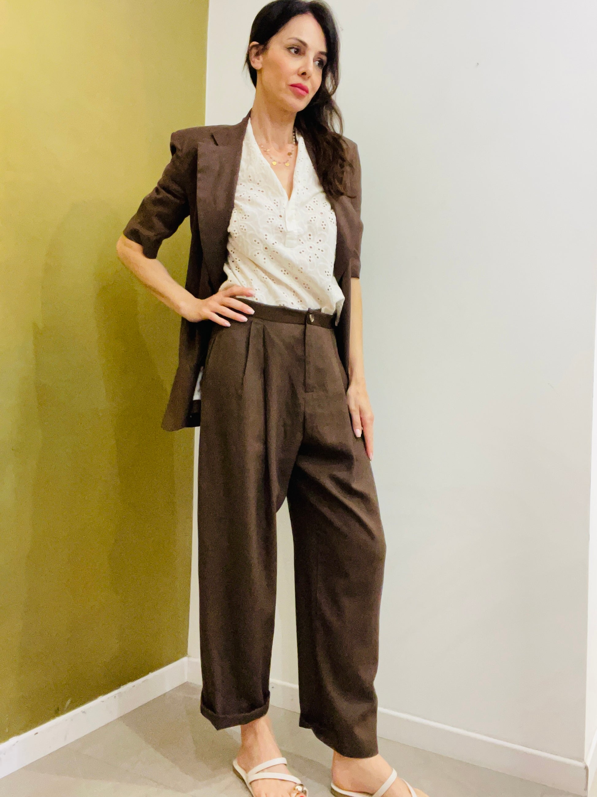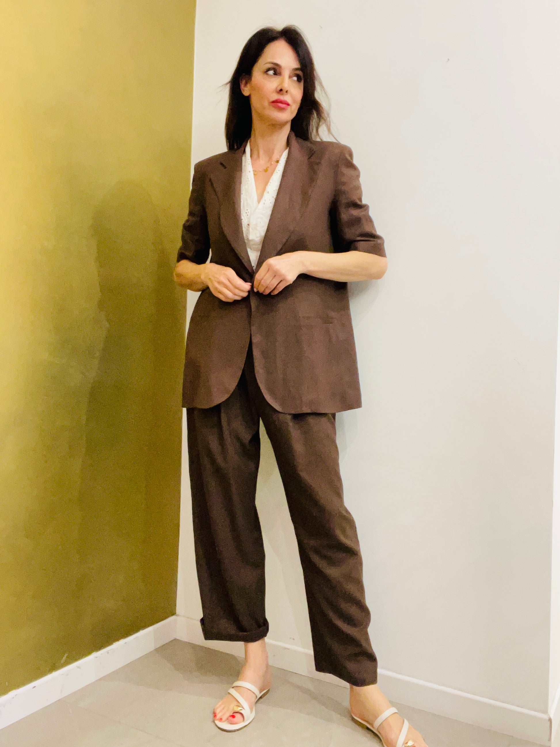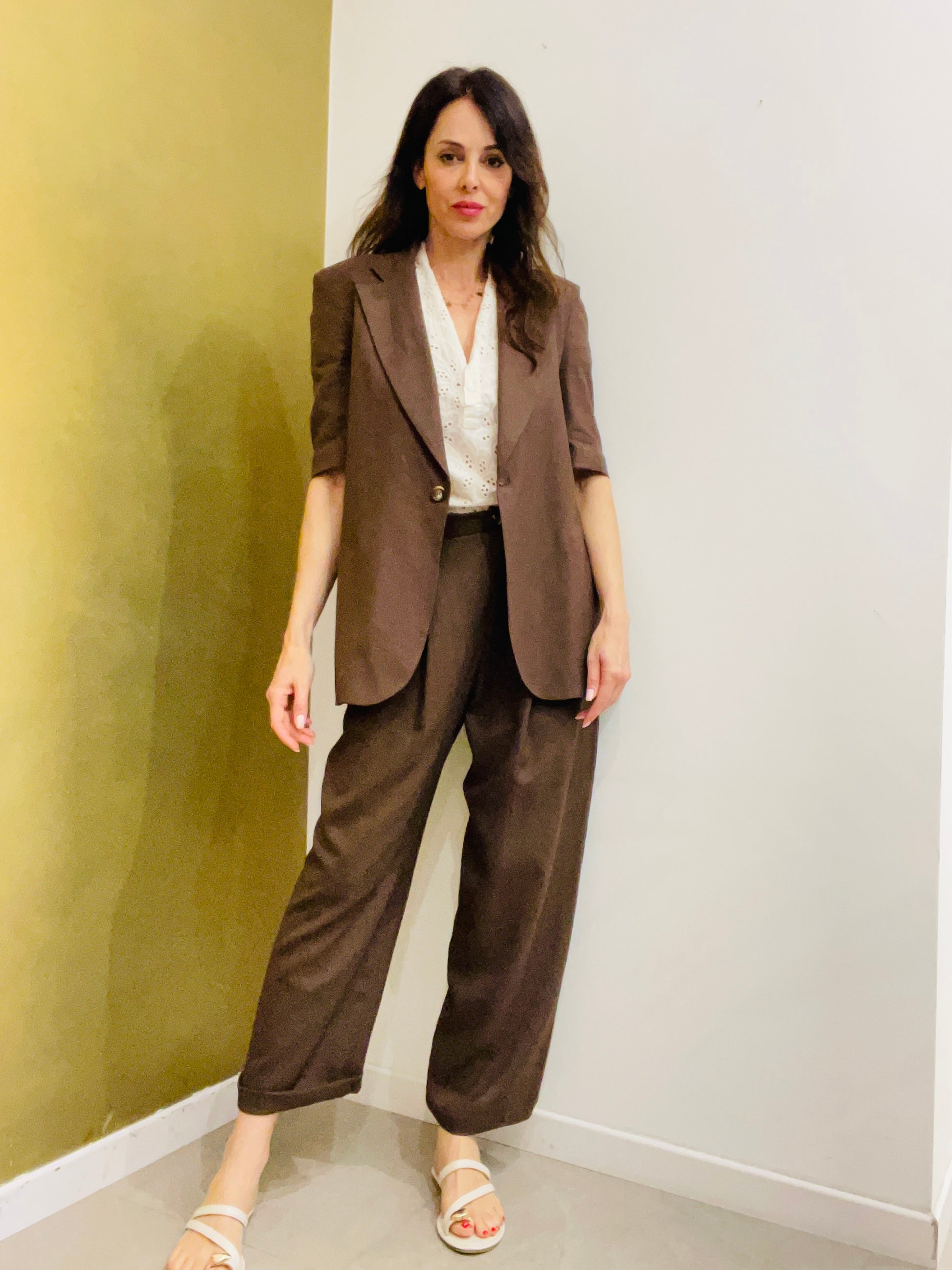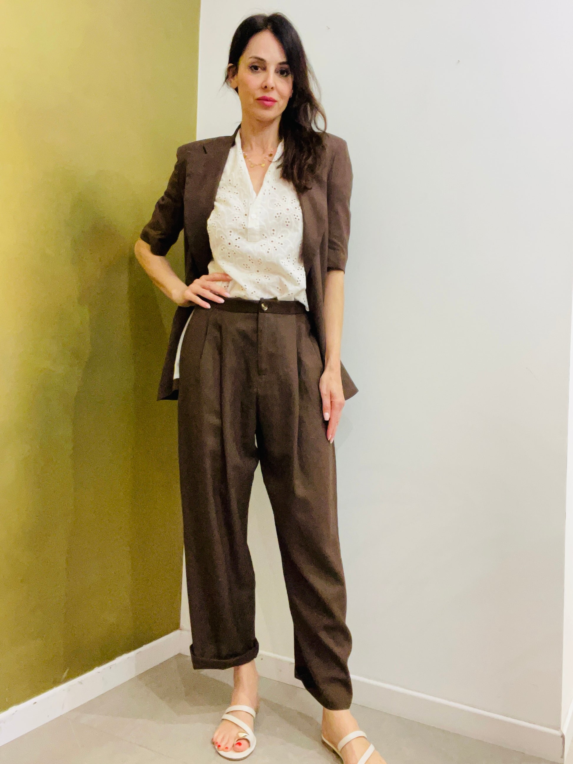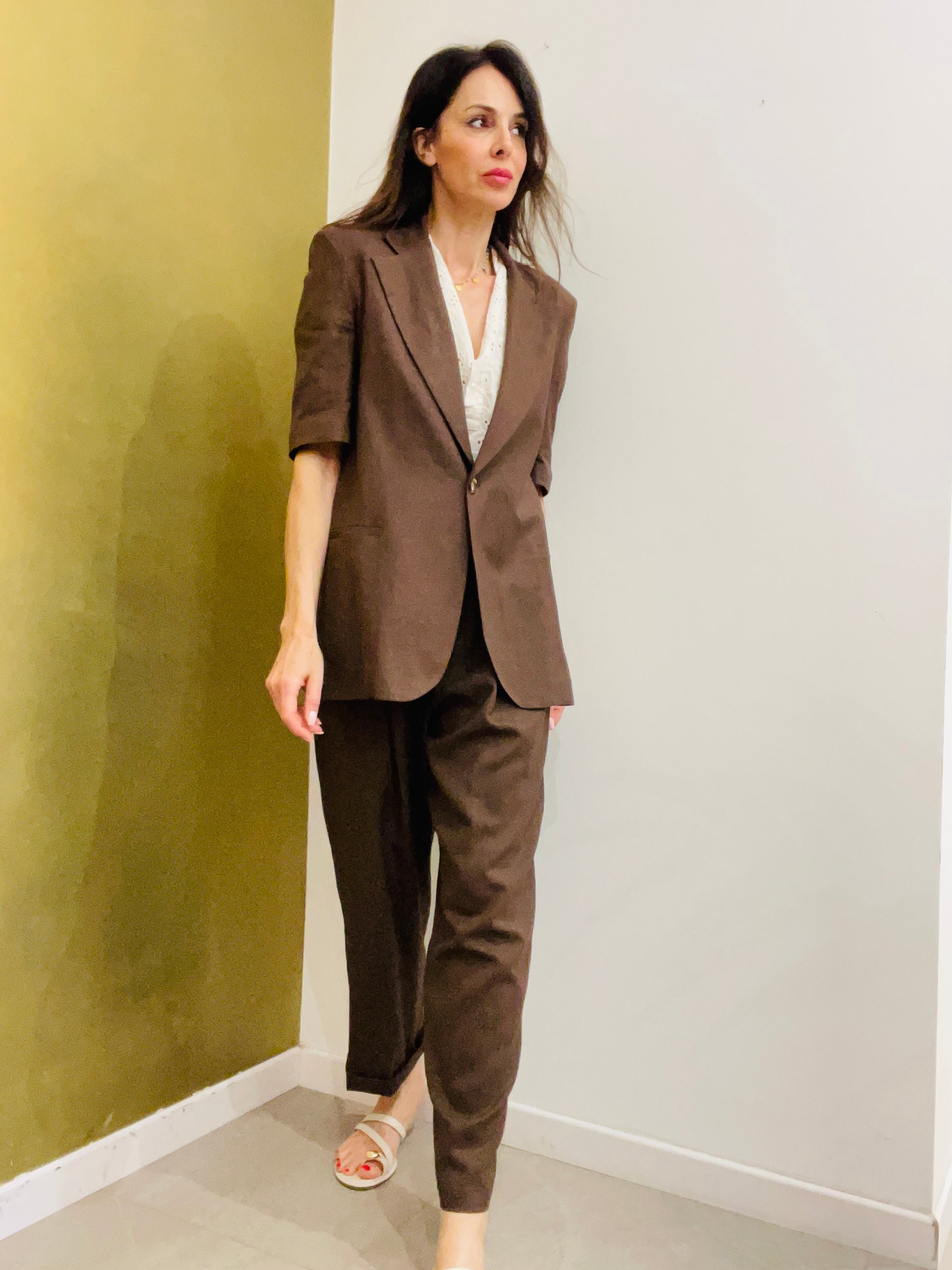 Giacca lunga in lino con manica a 3/4, tasche a filetto nella parte davanti, chiusura ad un bottone