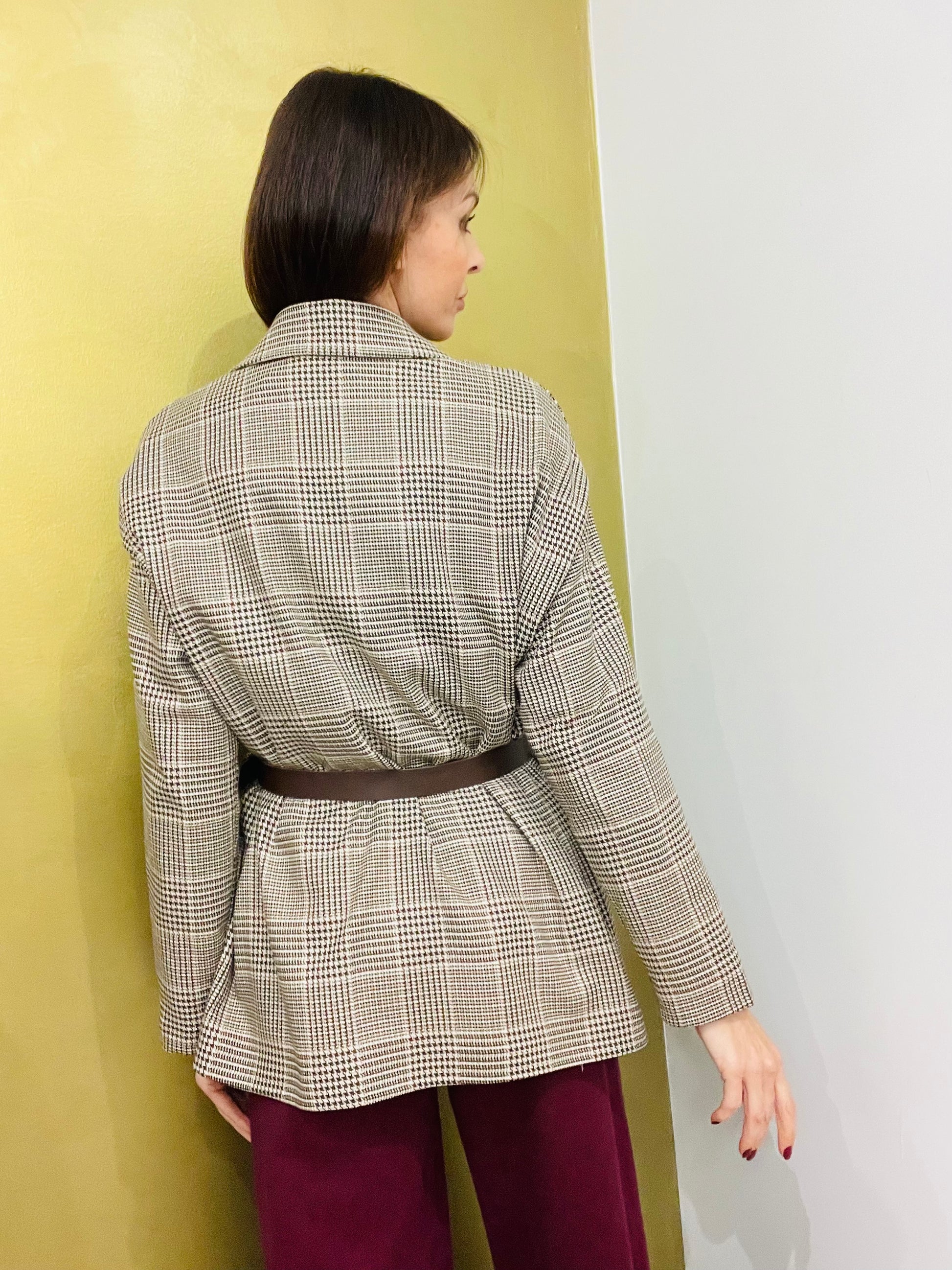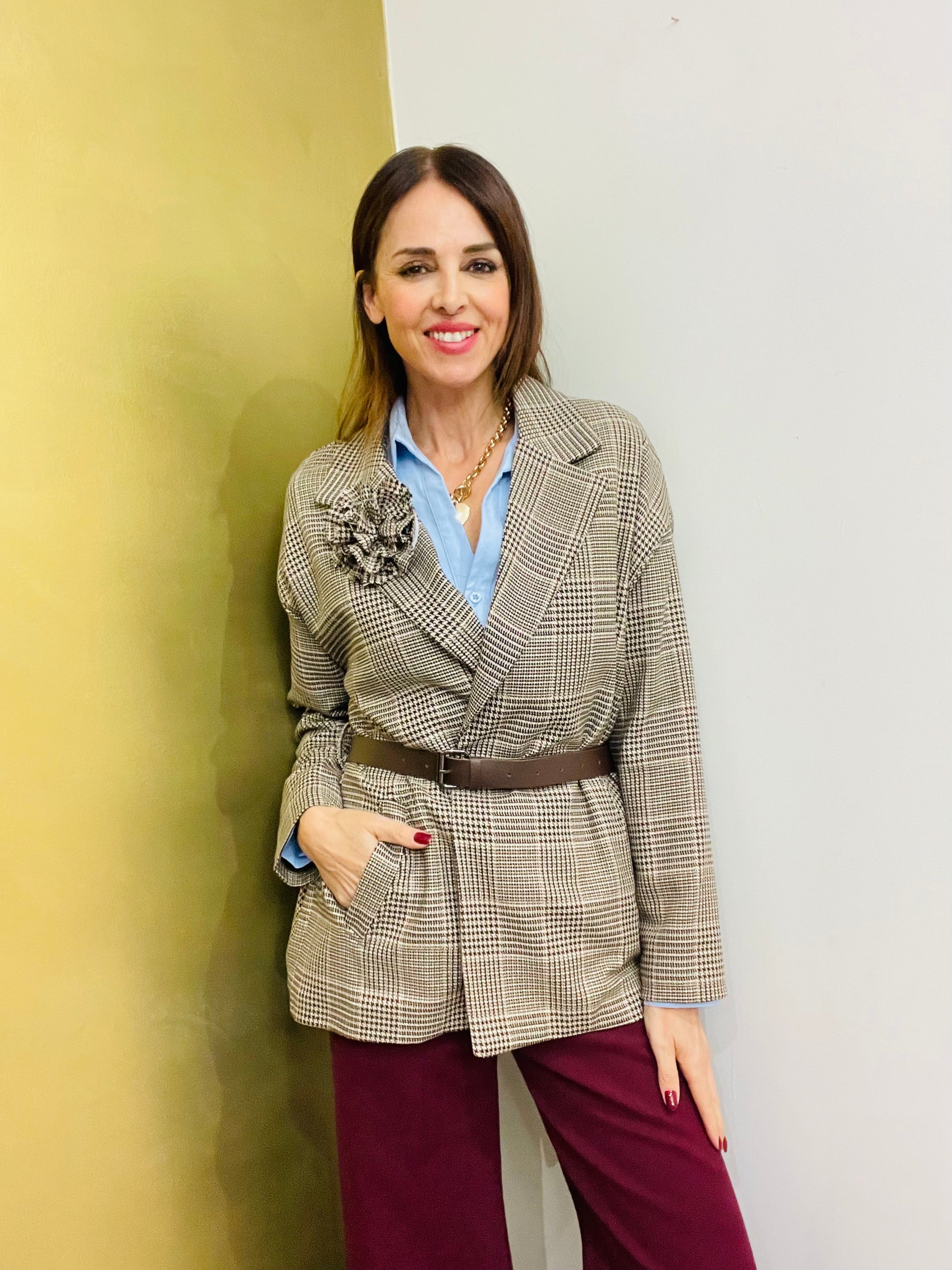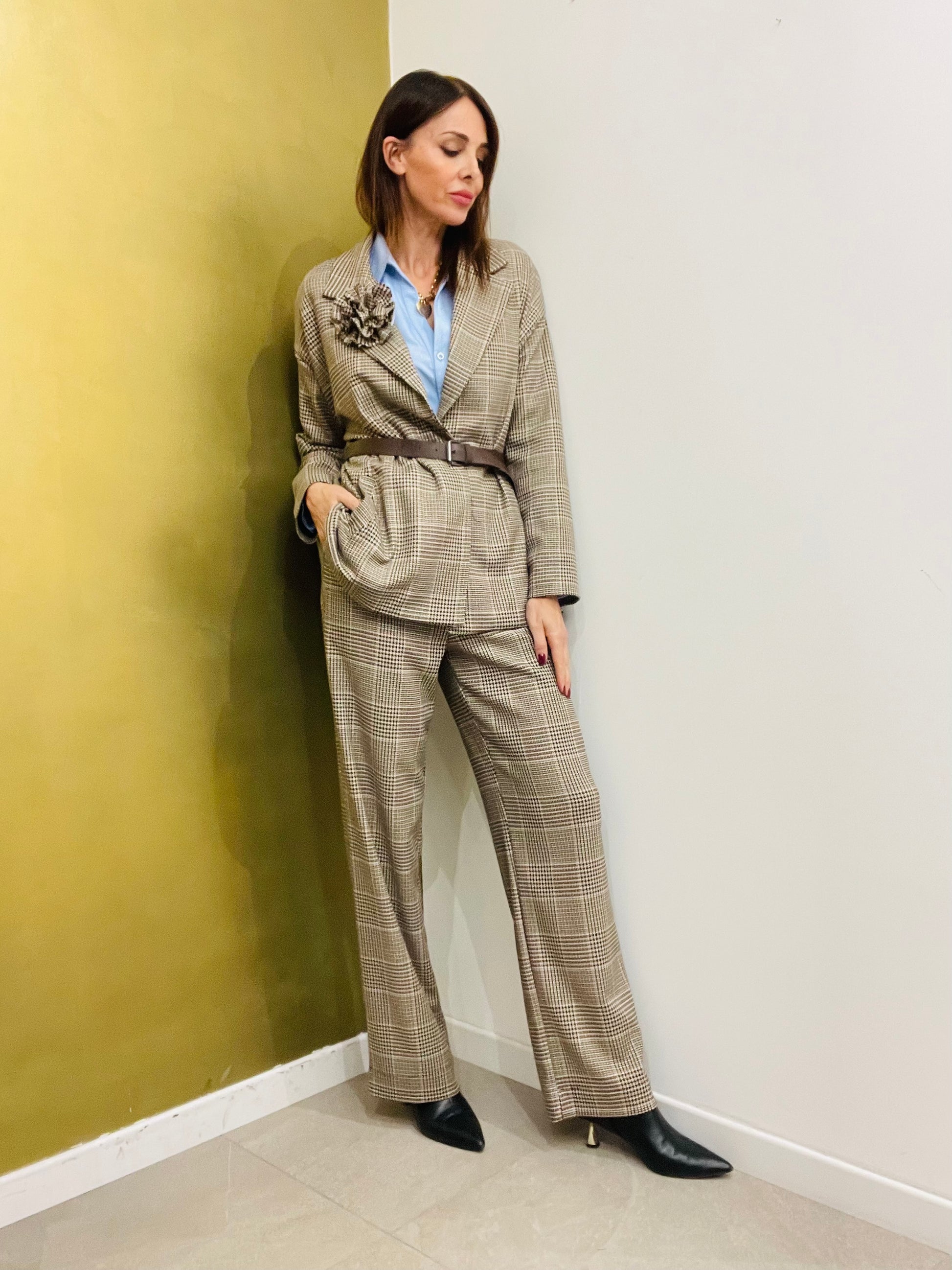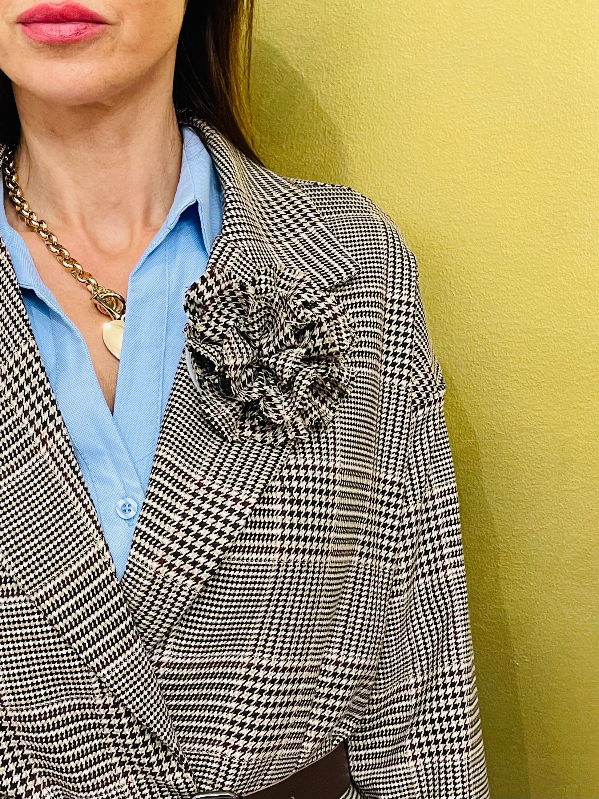 Giacca in principe di galles con spilla a fiore sulla parte sinistra indossata , passanti in vita con cintura compresa, taglio raglan sulla manica, giacca foderata