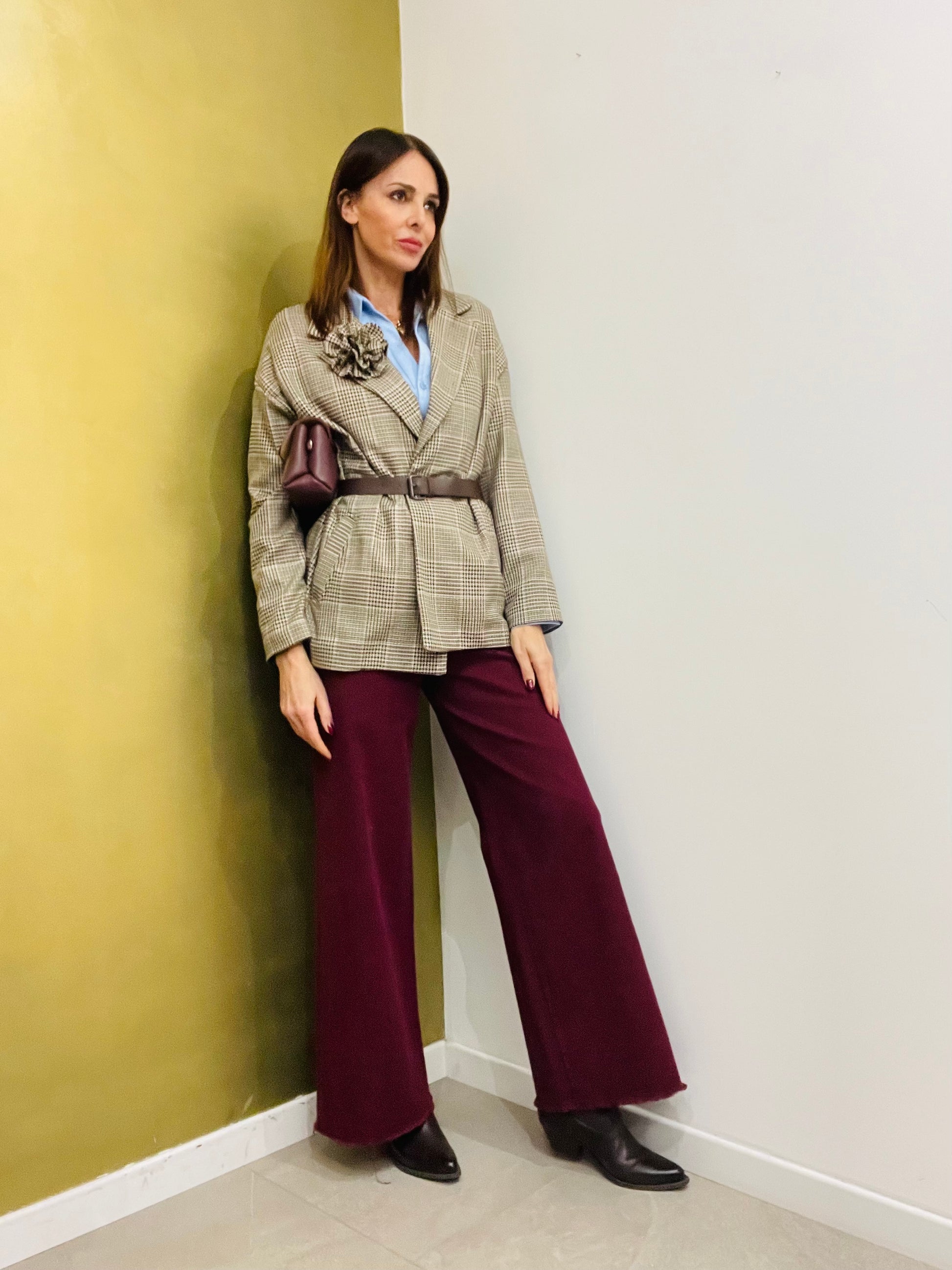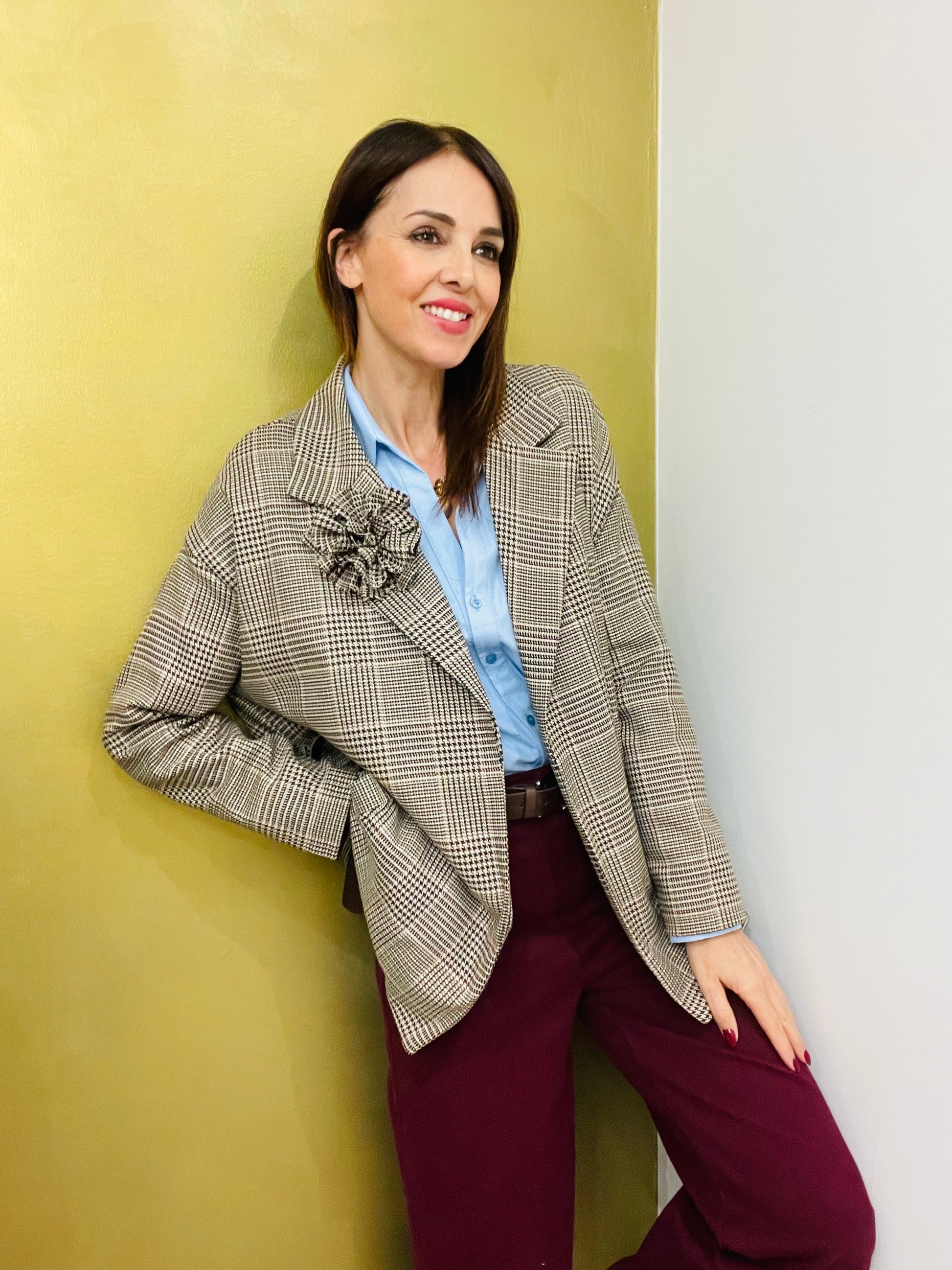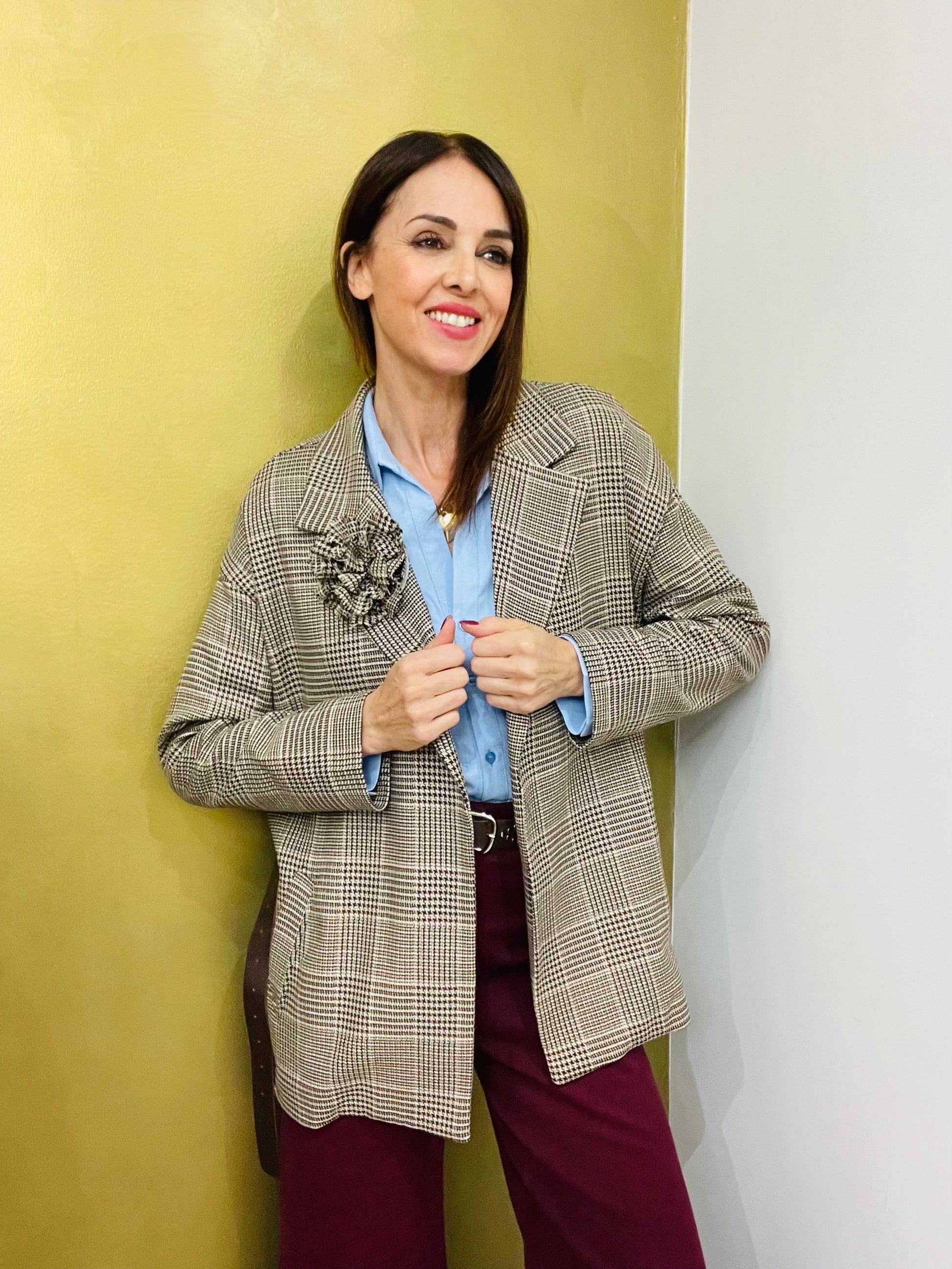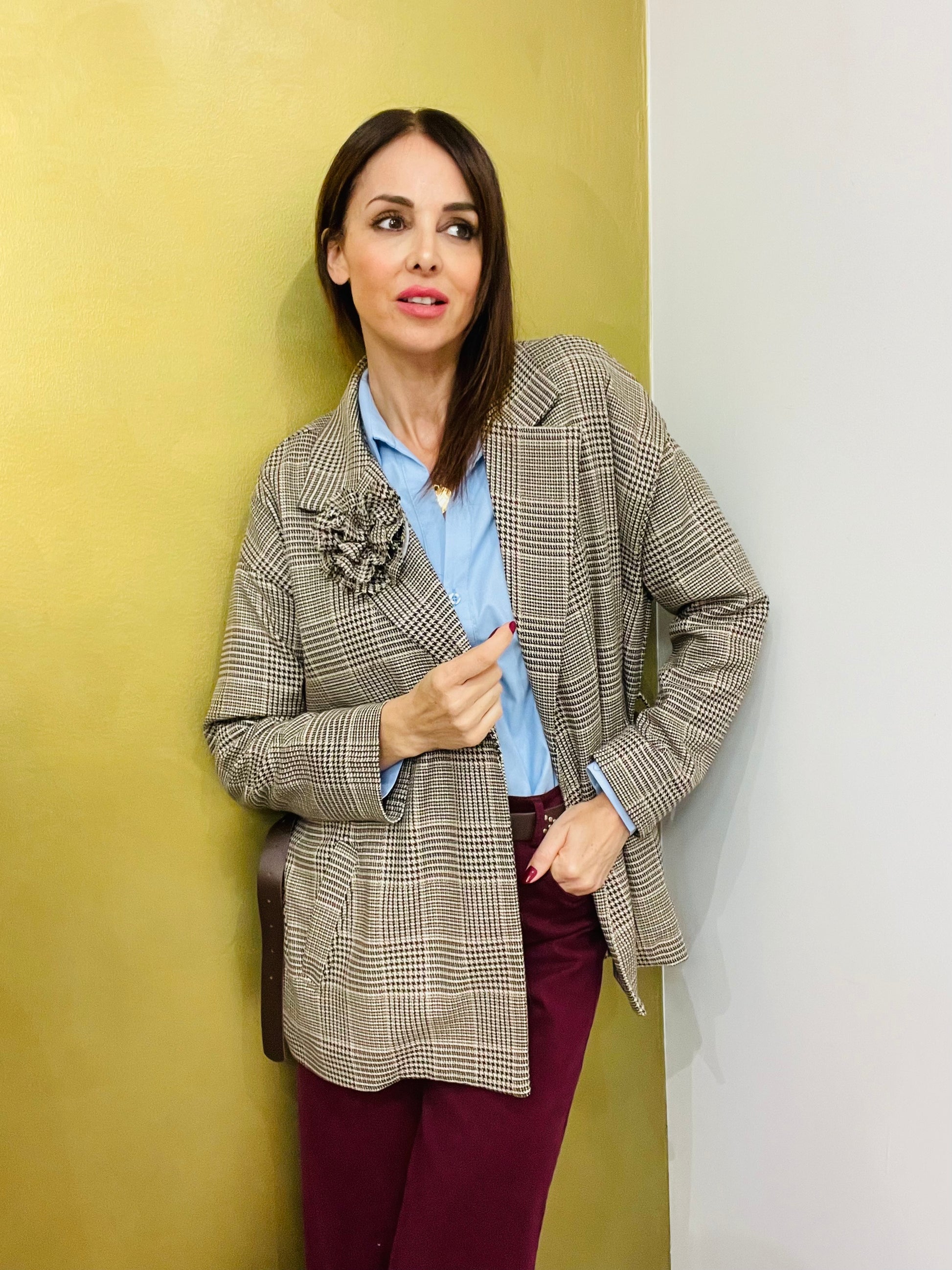Giacca in principe di galles con spilla a fiore sulla parte sinistra indossata , passanti in vita con cintura compresa, taglio raglan sulla manica, giacca foderata
