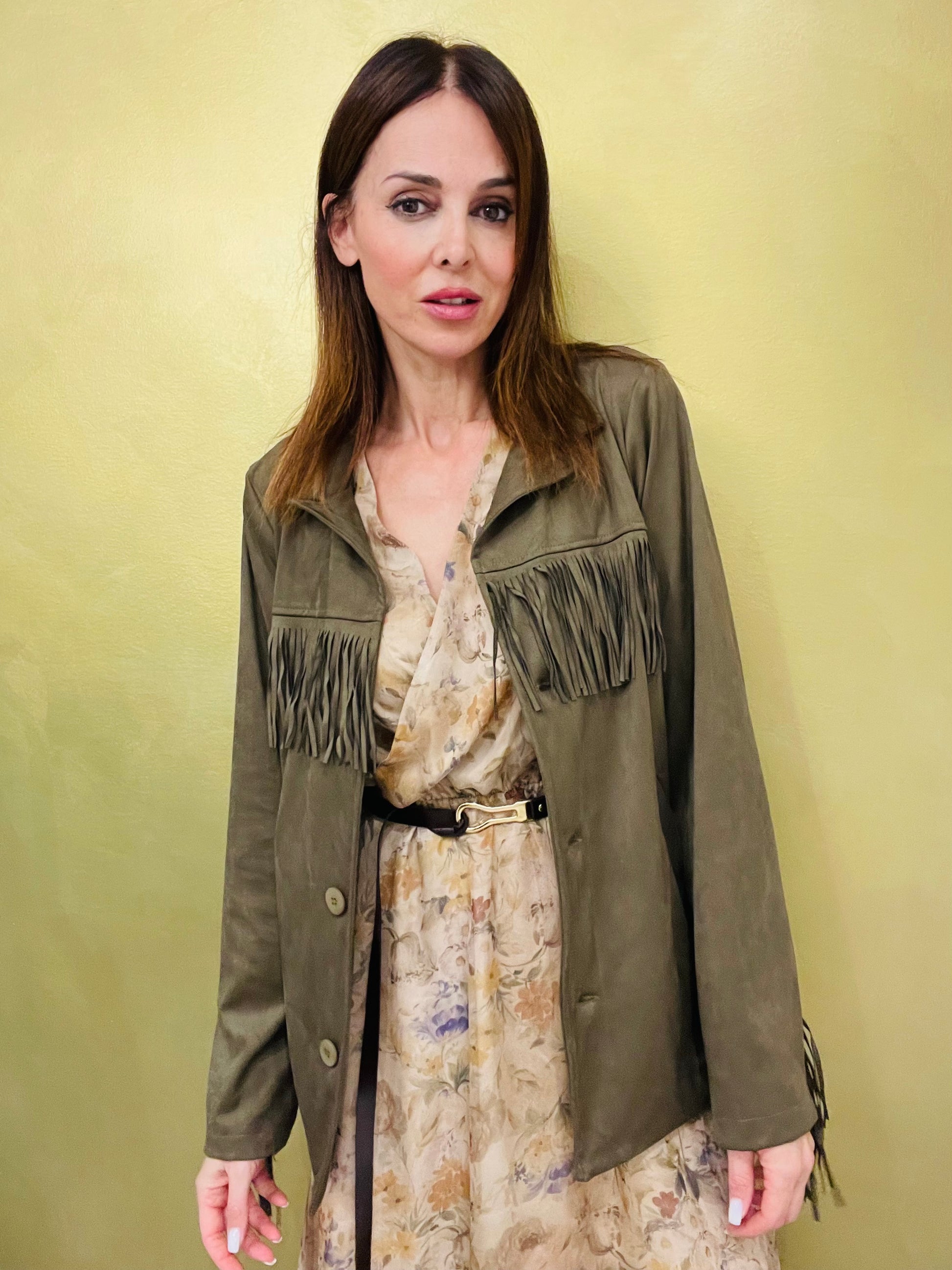 Giacca scamosciata con applicazione di frange sulla parte davanti sul retro e sulla manica, tasche laterali