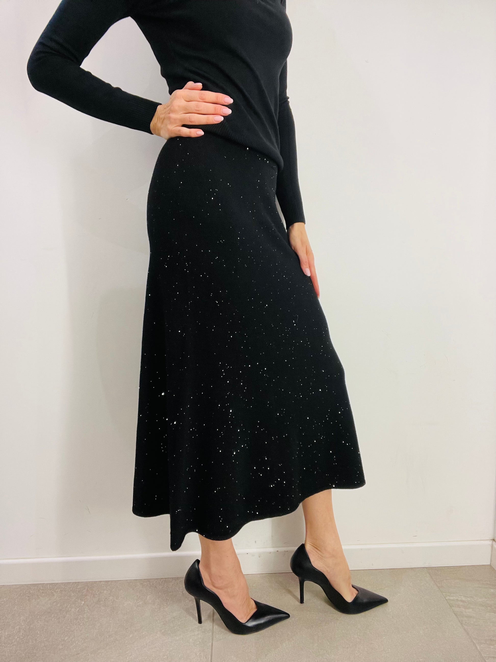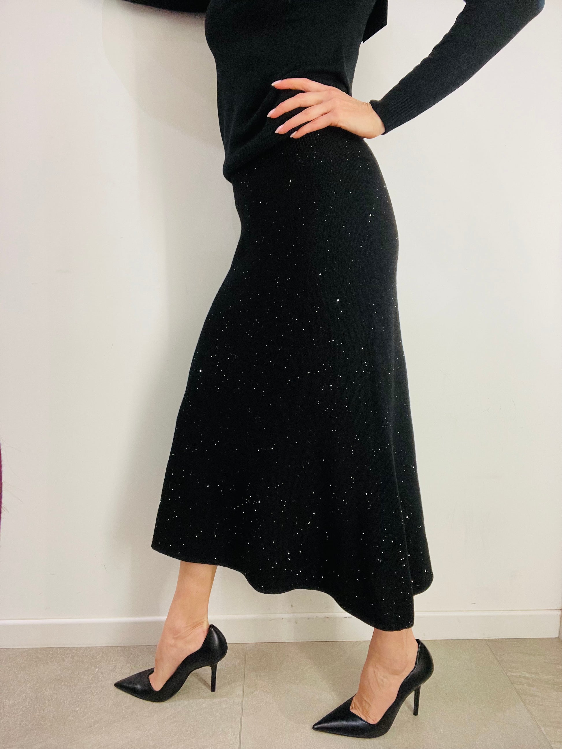 Gonna svasata lunga in maglia con micropaillettes, elastico con dettagli di costina sul giro vita