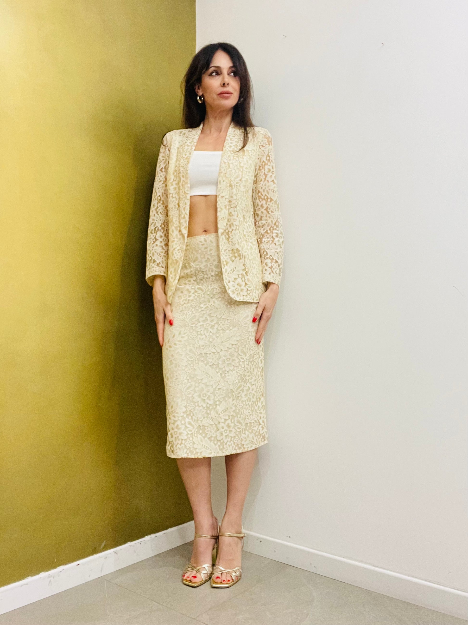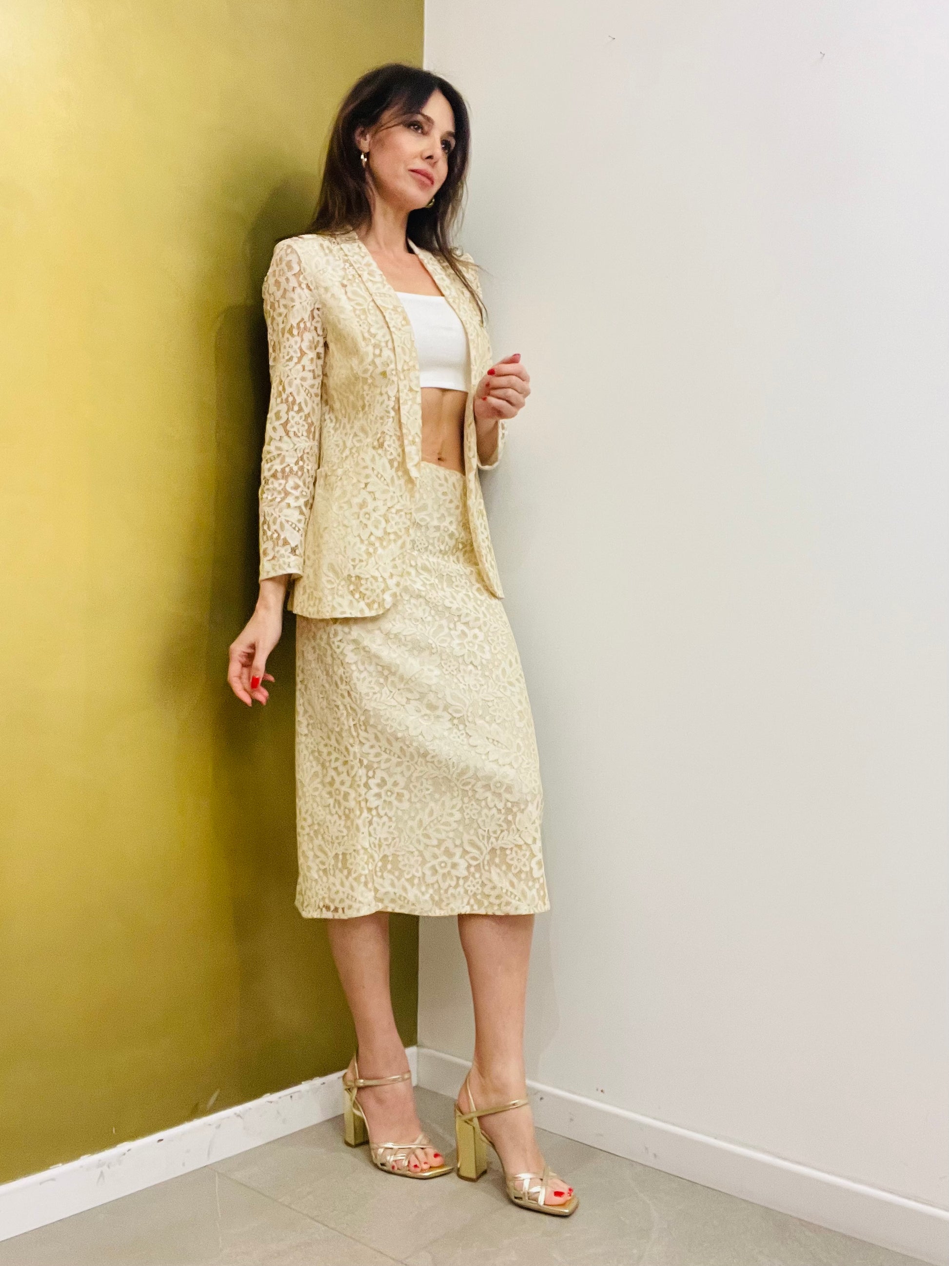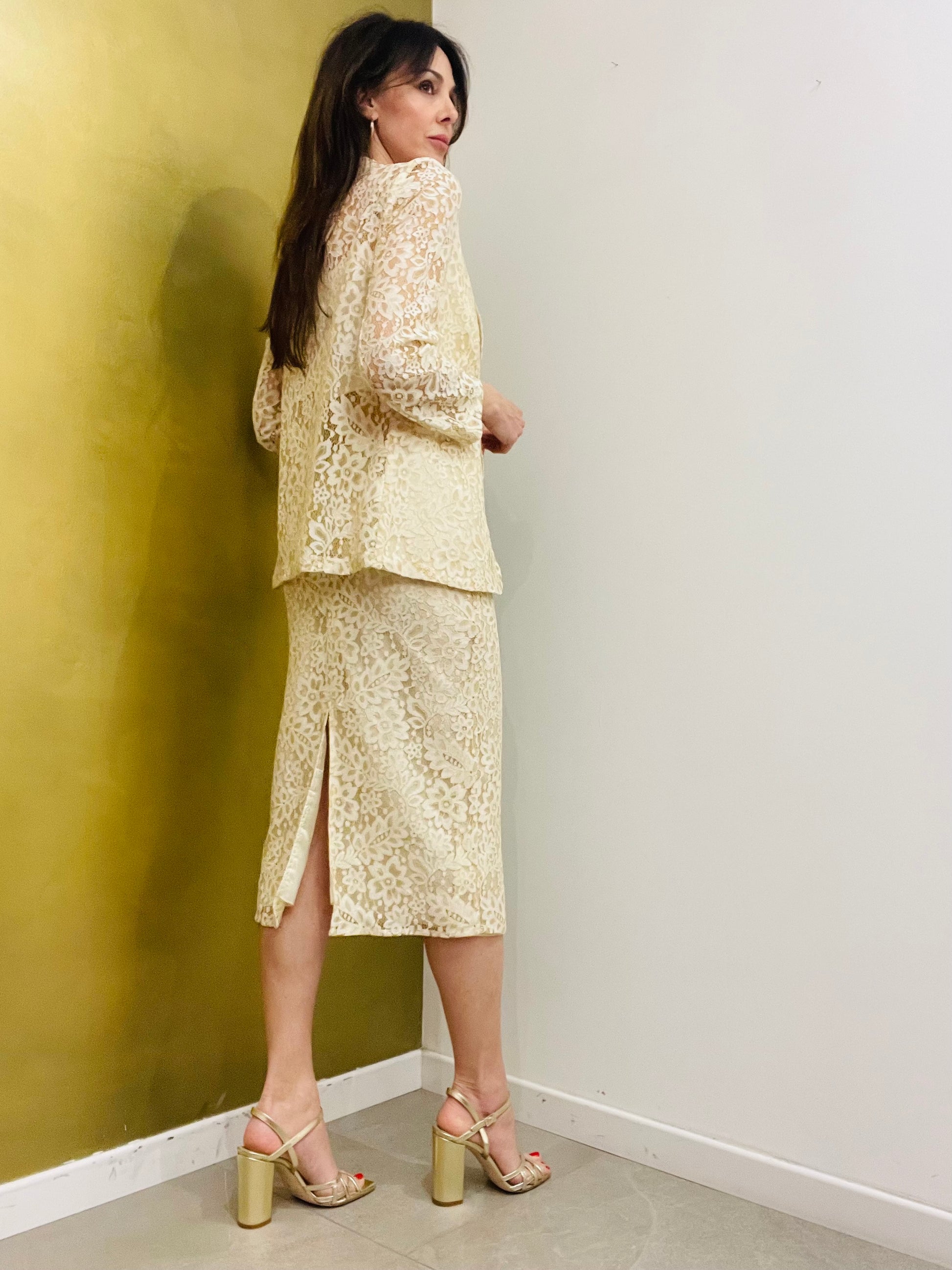 Gonna in pizzo dalla linea dritta a longuette con spacco dietro e zip sul retro completamente foderata