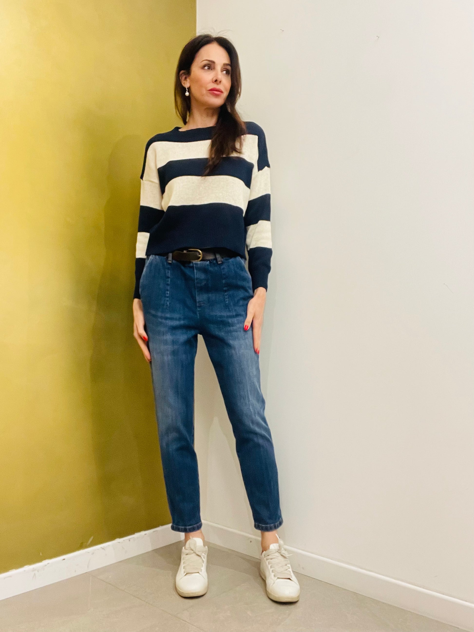 Jeans chino con pence sul davanti con tasche laterali, elastico sul giro vita con cintura rimovibile, tasche a filetto sul retro
