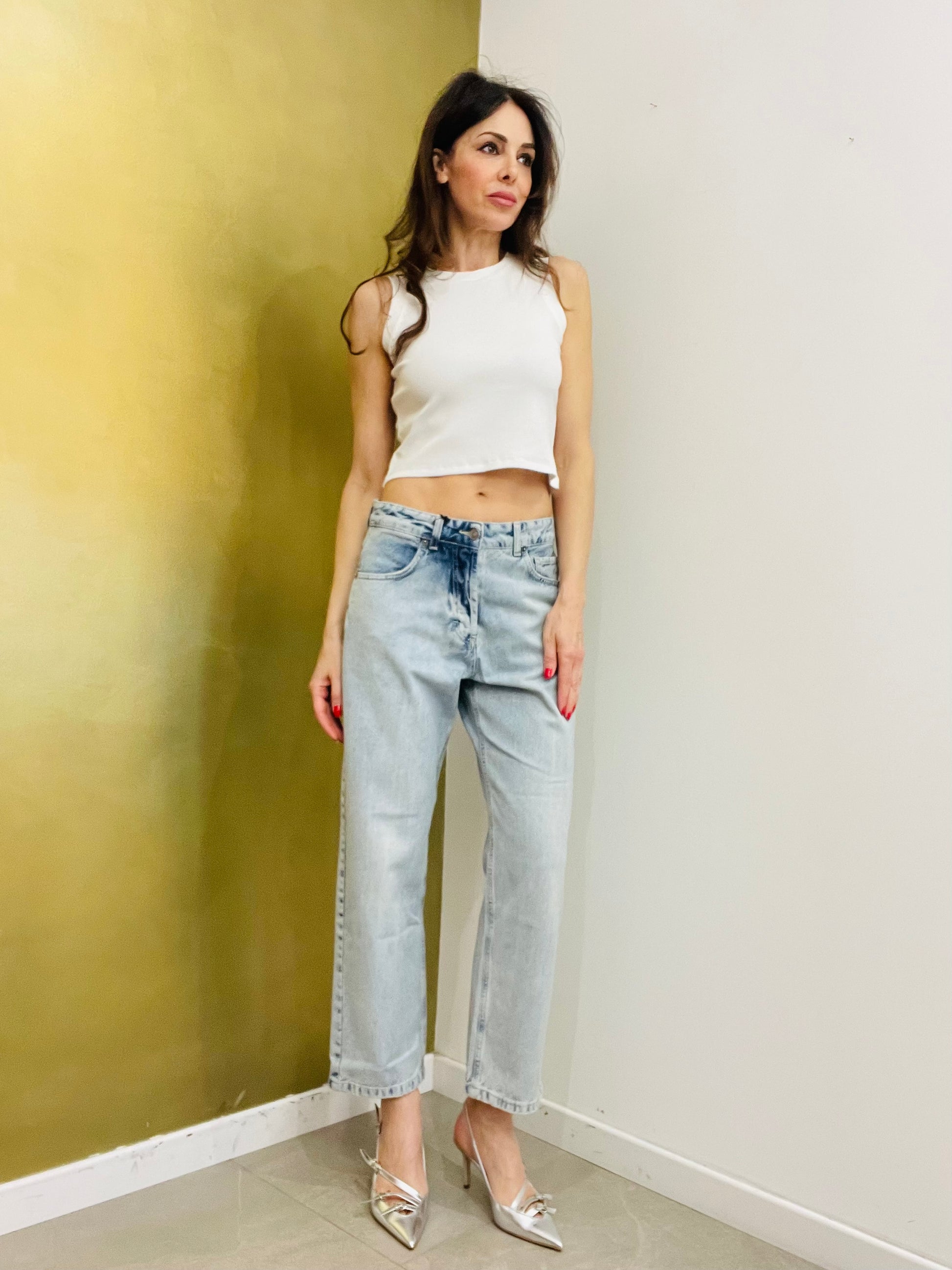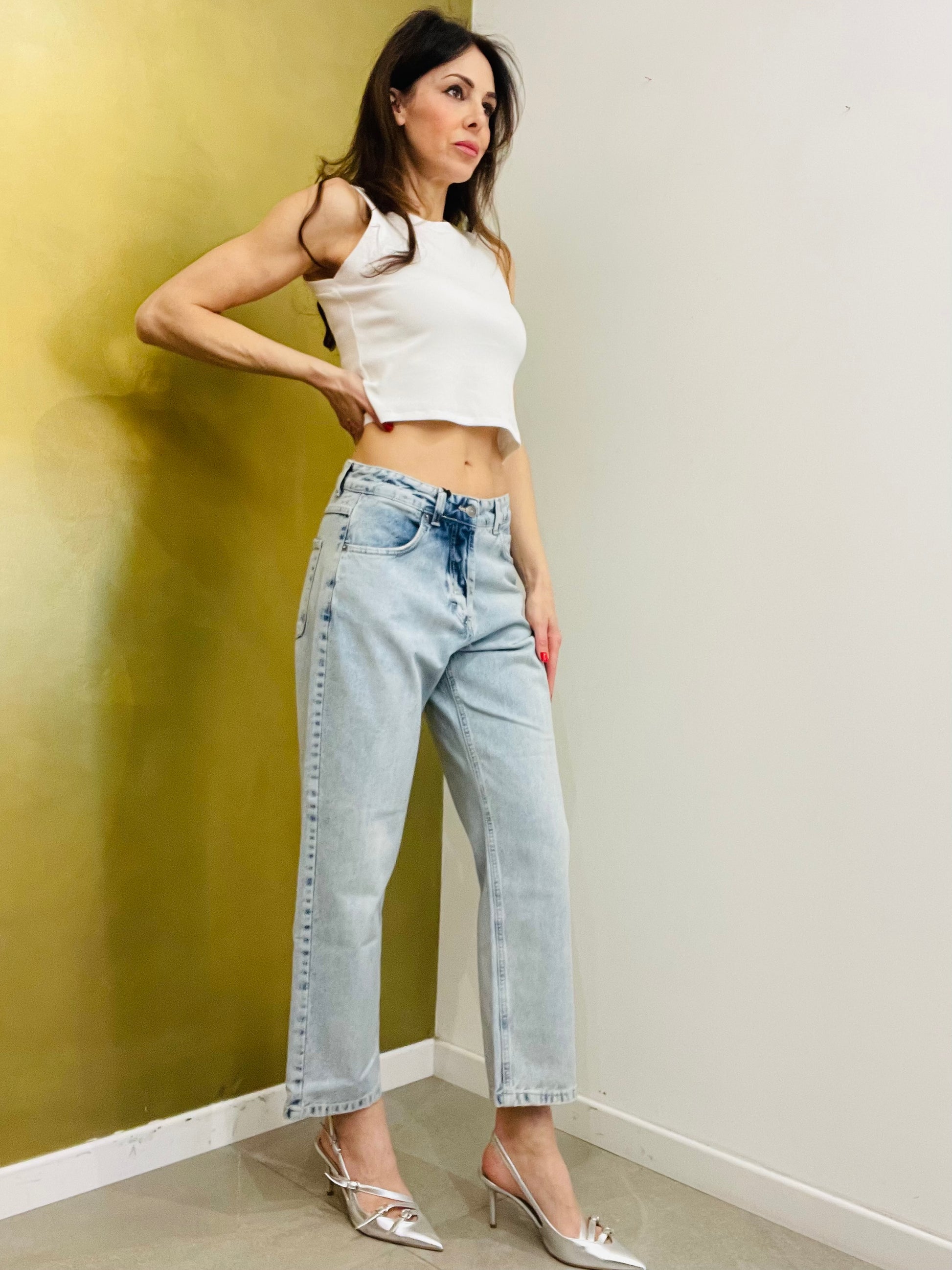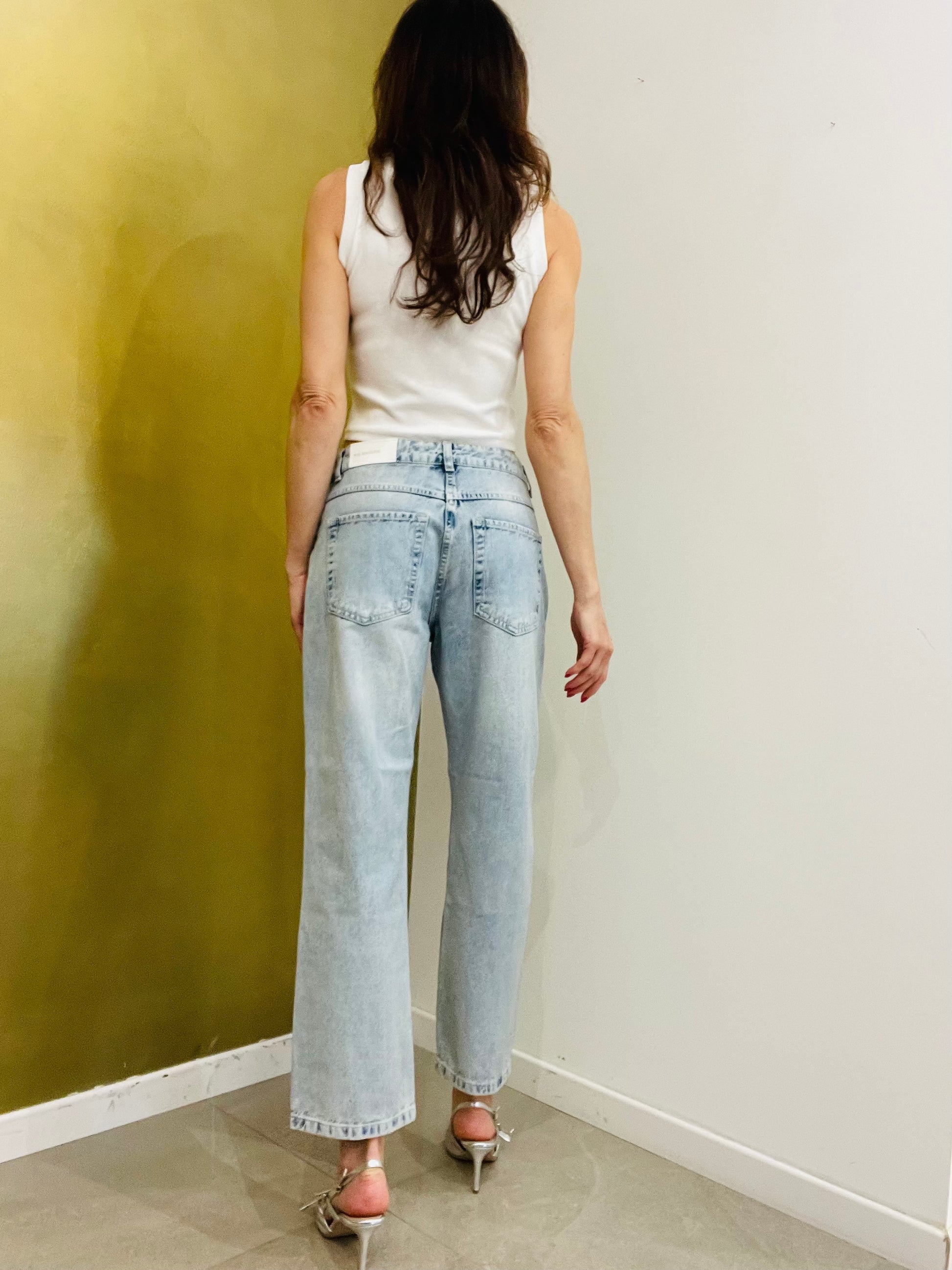 Jeans relax fit in cotone dal taglio largo dalla anche fino alle caviglie, dal lavaggio slavato a cinque tasche, chiusura con zip e un bottone