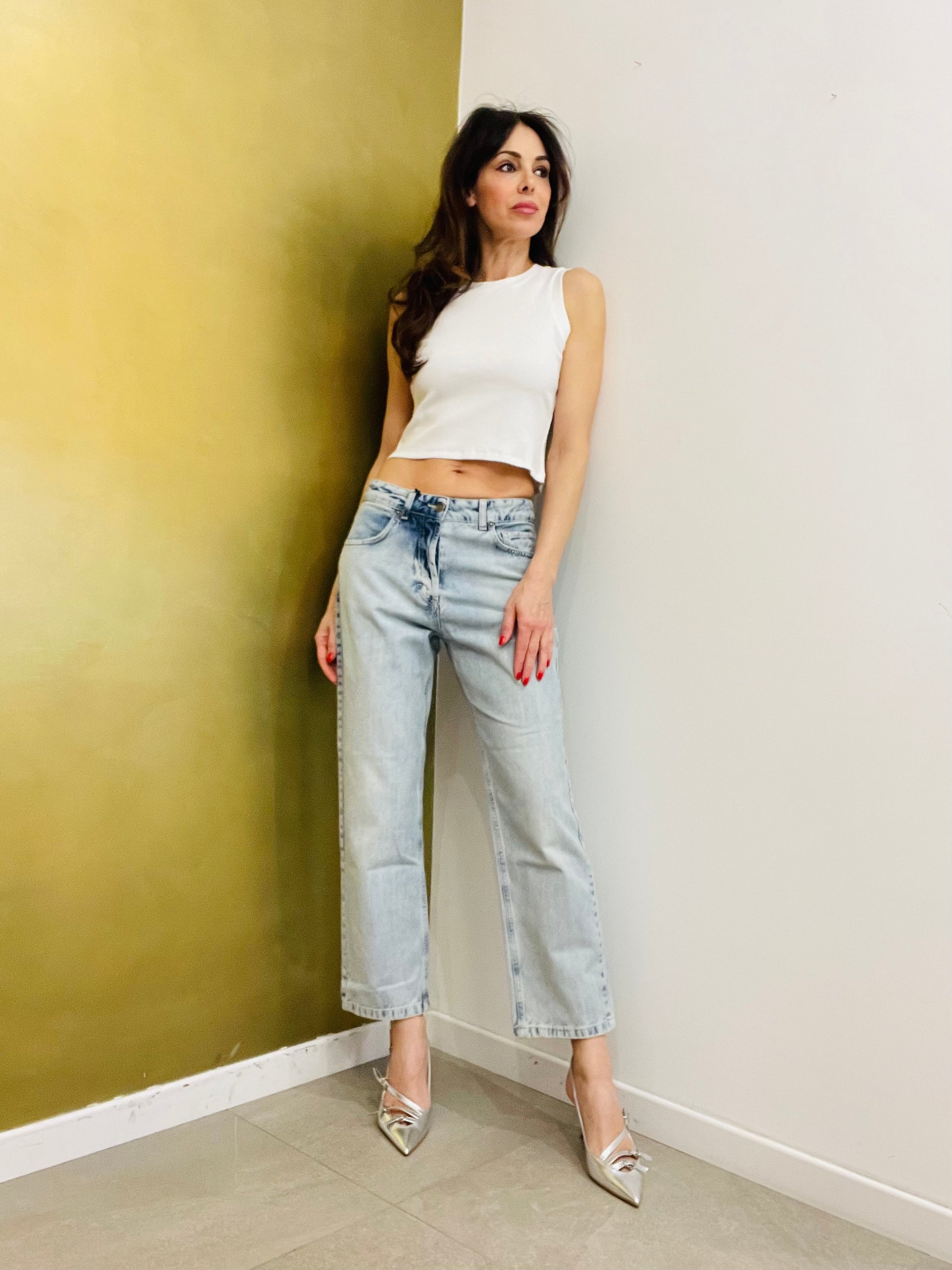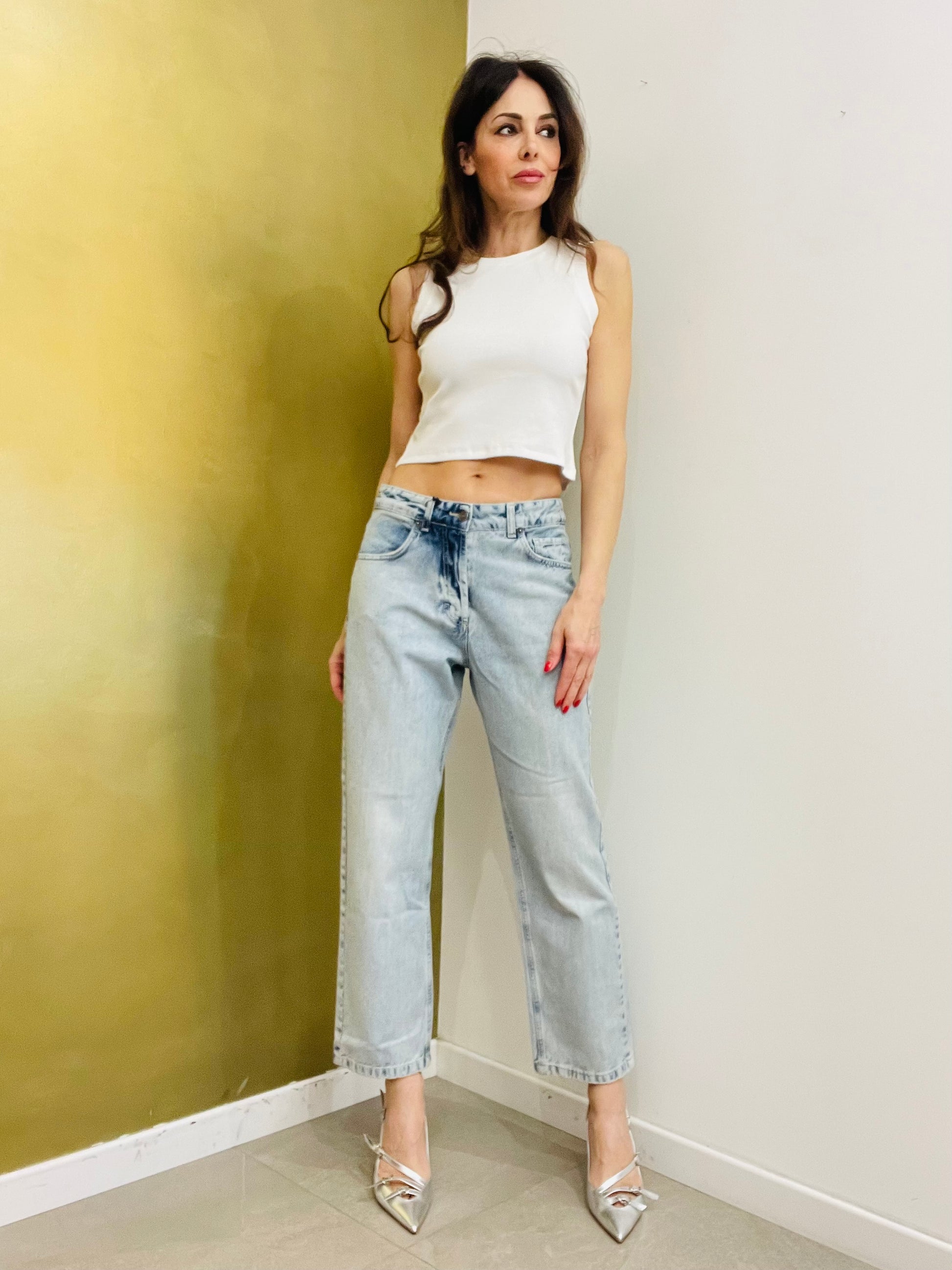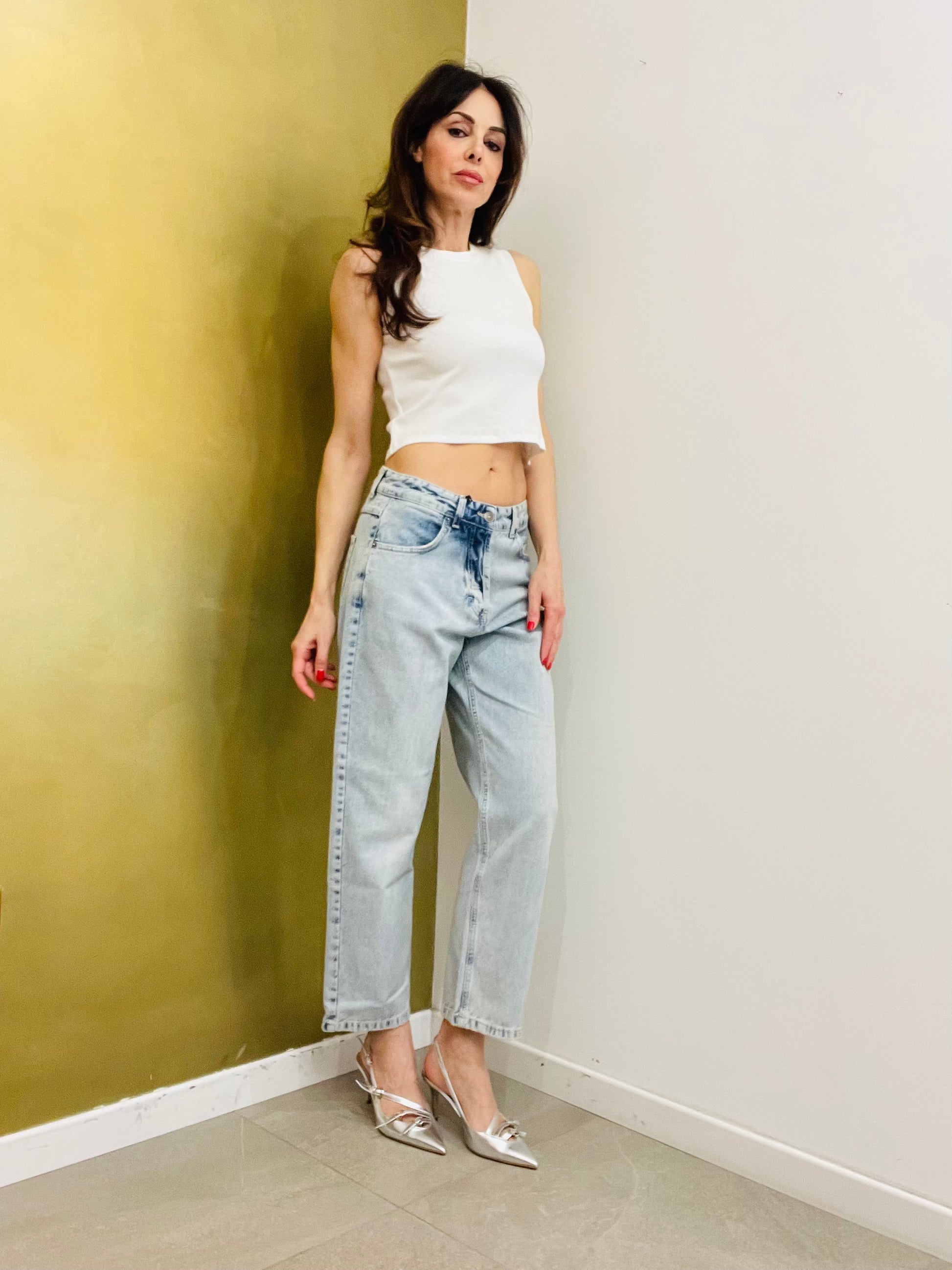 Jeans relax fit in cotone dal taglio largo dalla anche fino alle caviglie, dal lavaggio slavato a cinque tasche, chiusura con zip e un bottone