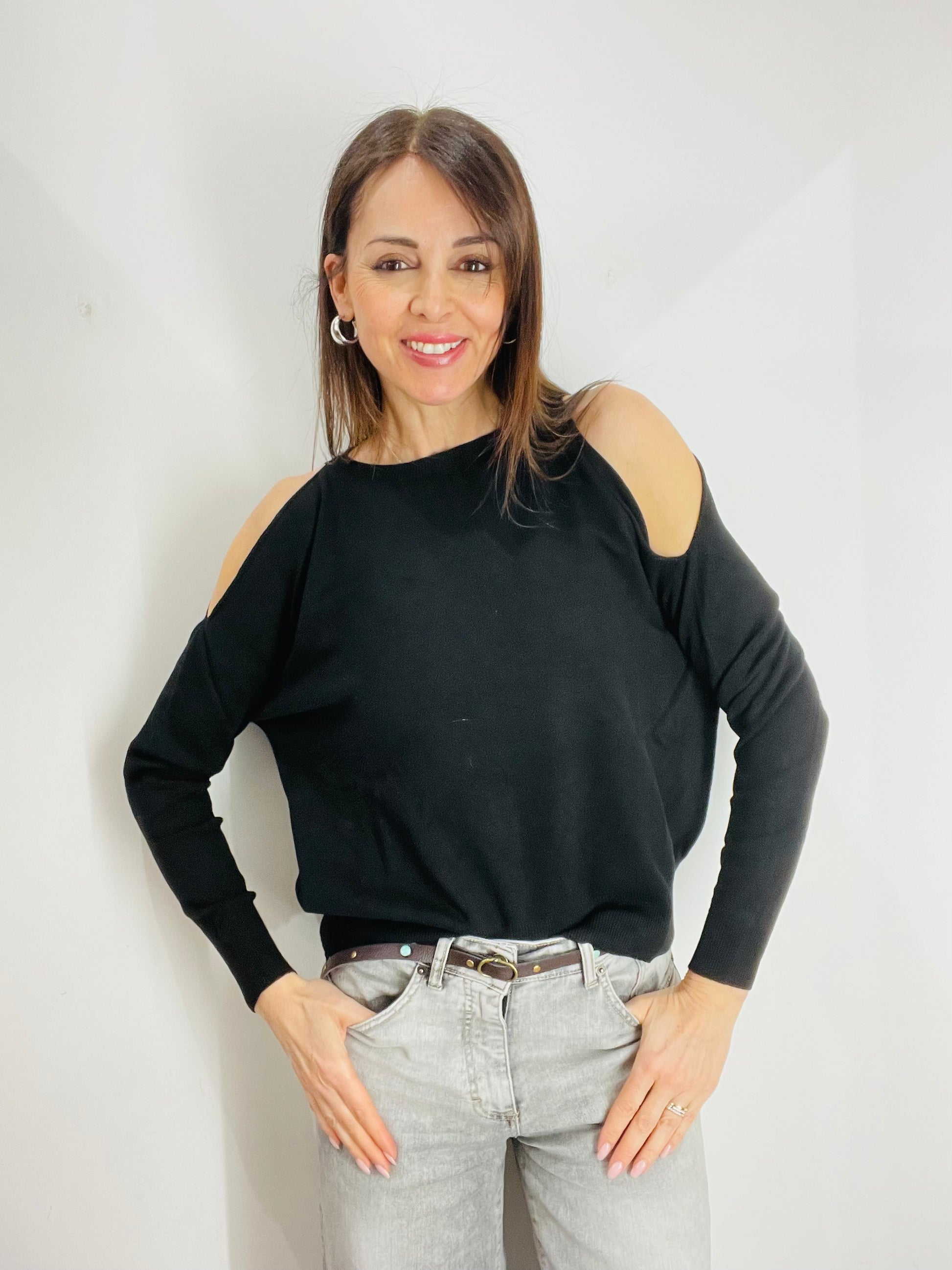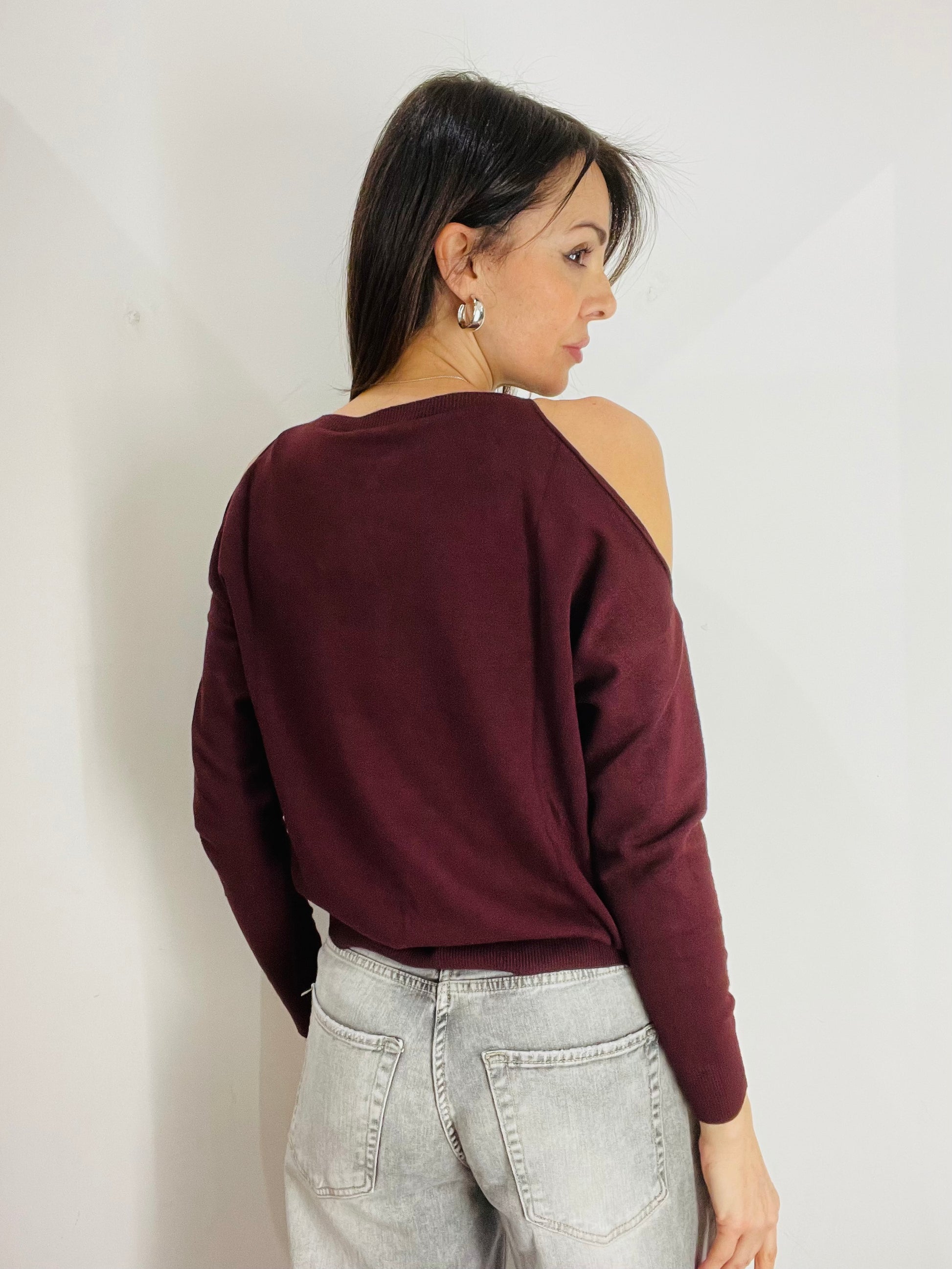 Maglia a girocollo con cut out sulle spalle, dettagli di costina sul fondo maglia sul fondo manica e sul girocollo