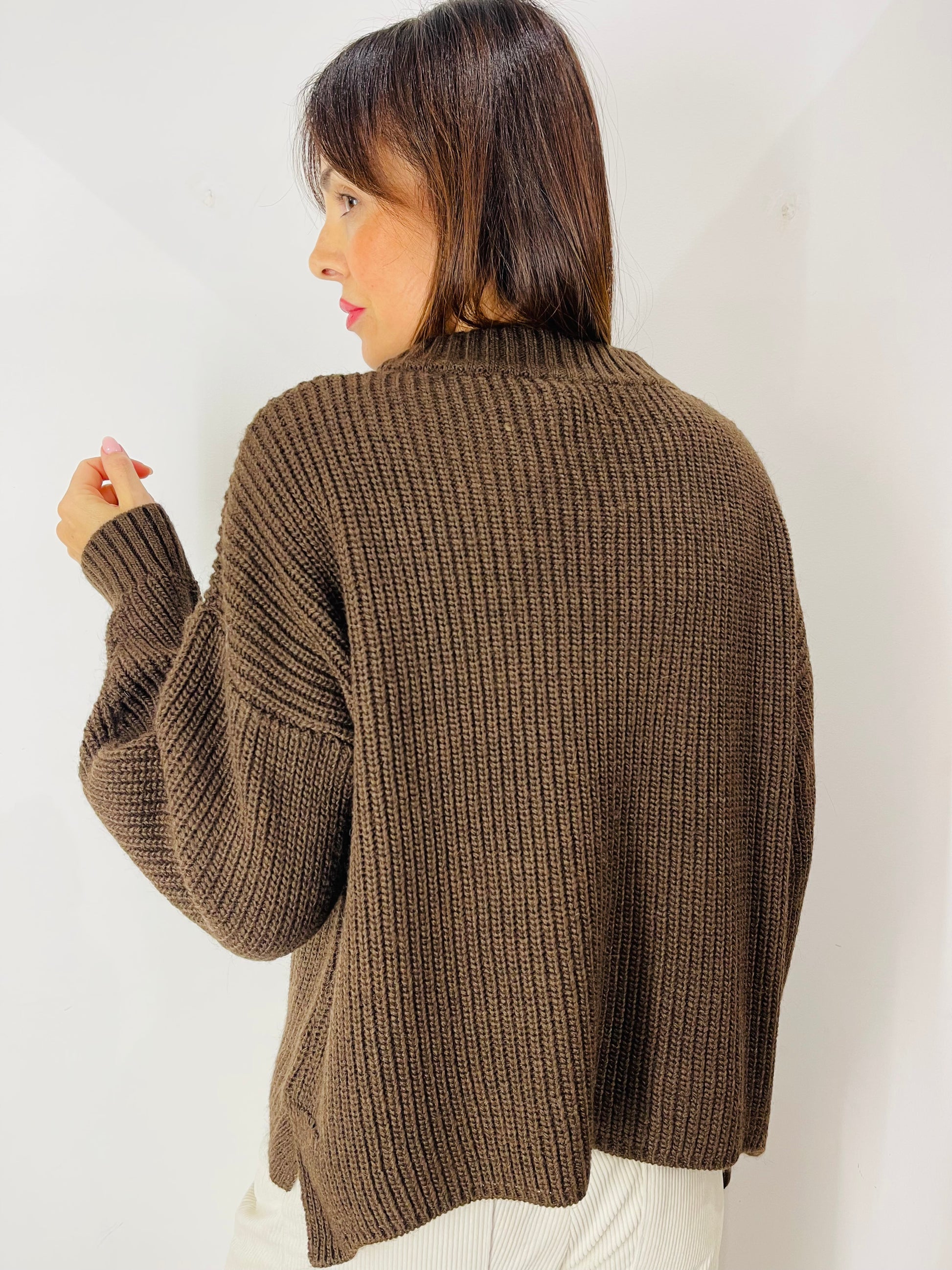 Maglia girocollo a coste con scritta chalet sul davanti con dettagli di filo lurex, taglio raglan sulla spalla, dettagli di costina sul fondo manica e sul girocollo, spacchetti laterali ai lati del fondo maglia