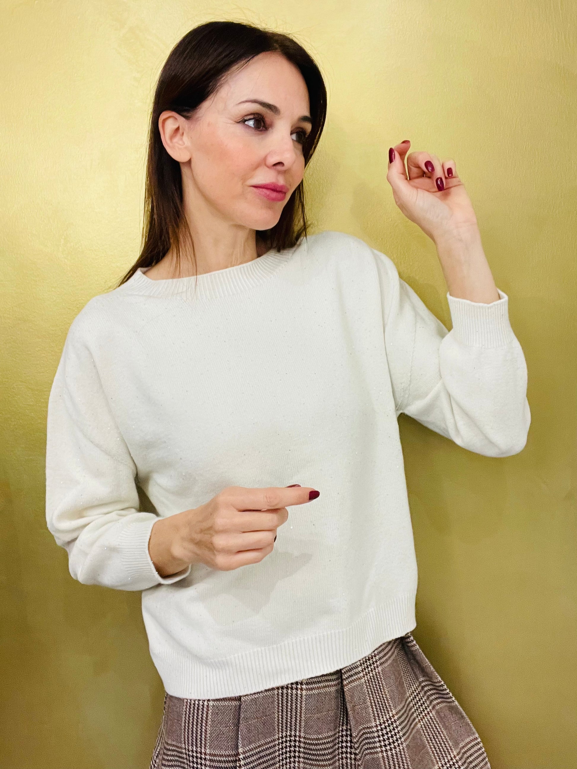 Maglia a girocollo con applicazione di micro paillettes su tutta la maglia, dettagli di costina su fondo maglia su fondo manica e sul girocollo