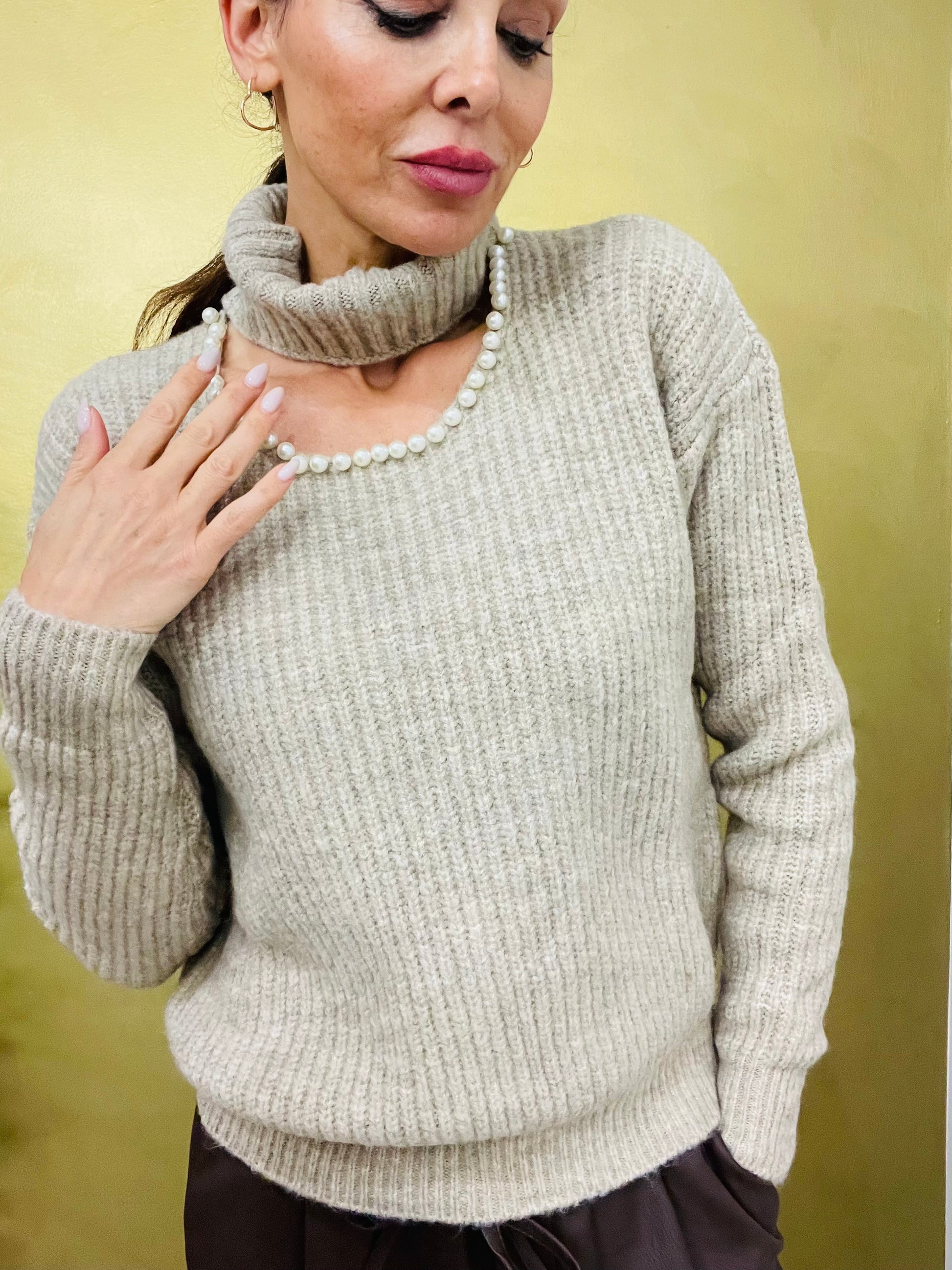 Maglia dolcevita in misto lana con dettaglio di apertura nella parte frontale, con perline applicate che contornano lo scollo