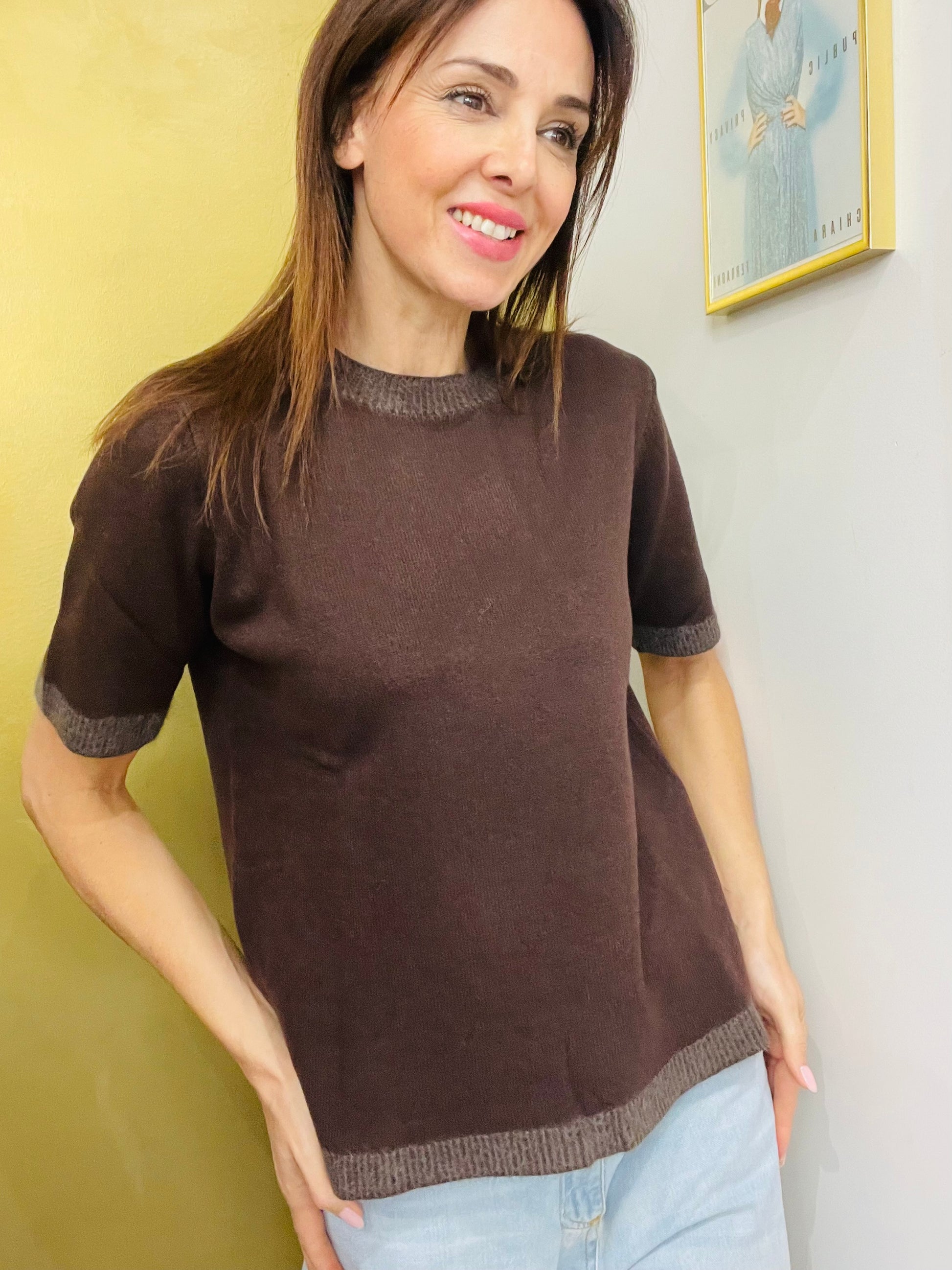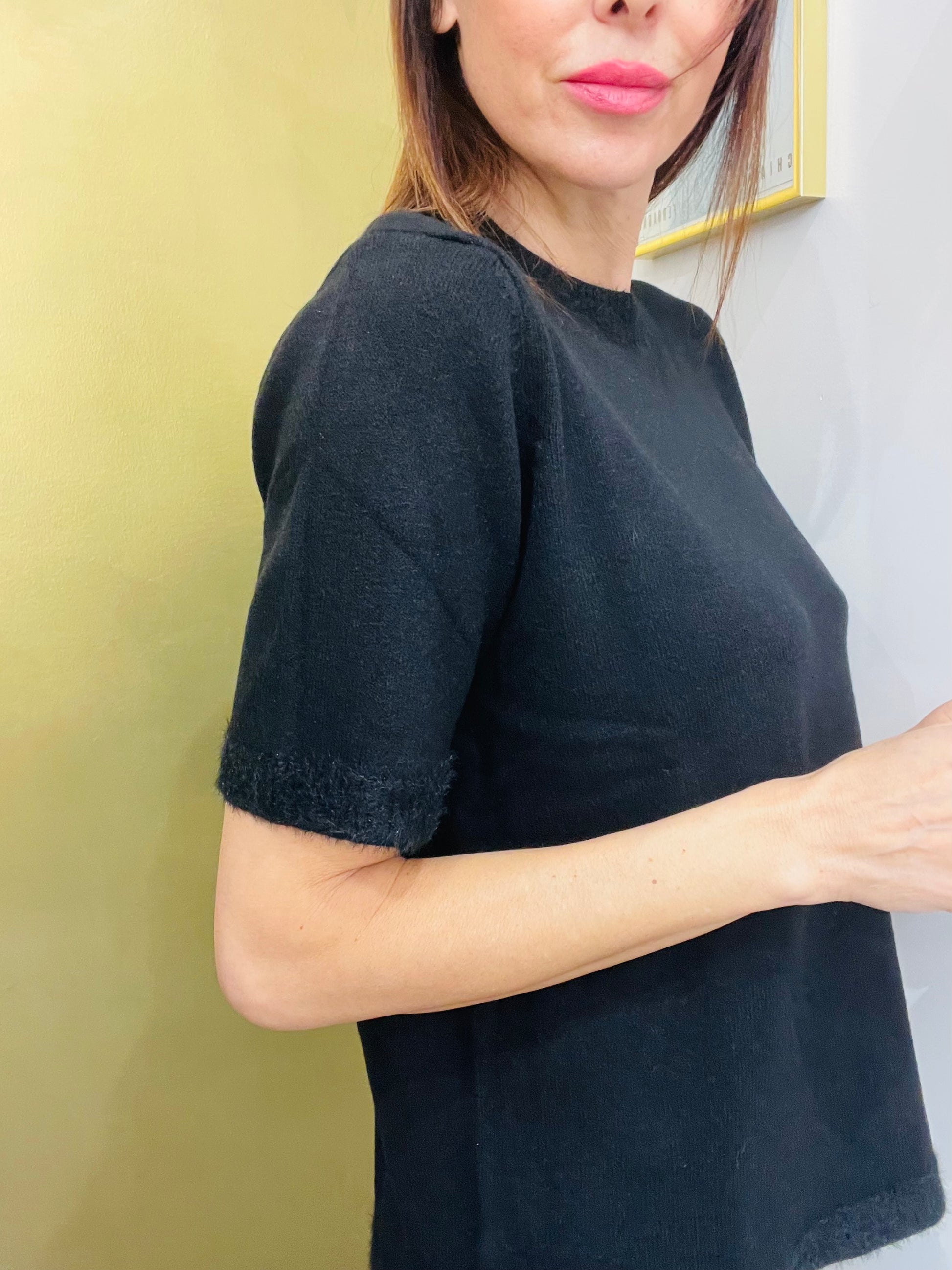 Maglia dalla vestibilità morbida a mezza manica con profili in pelliccia nel girocollo nel fondo della manica e nel fondo della maglia